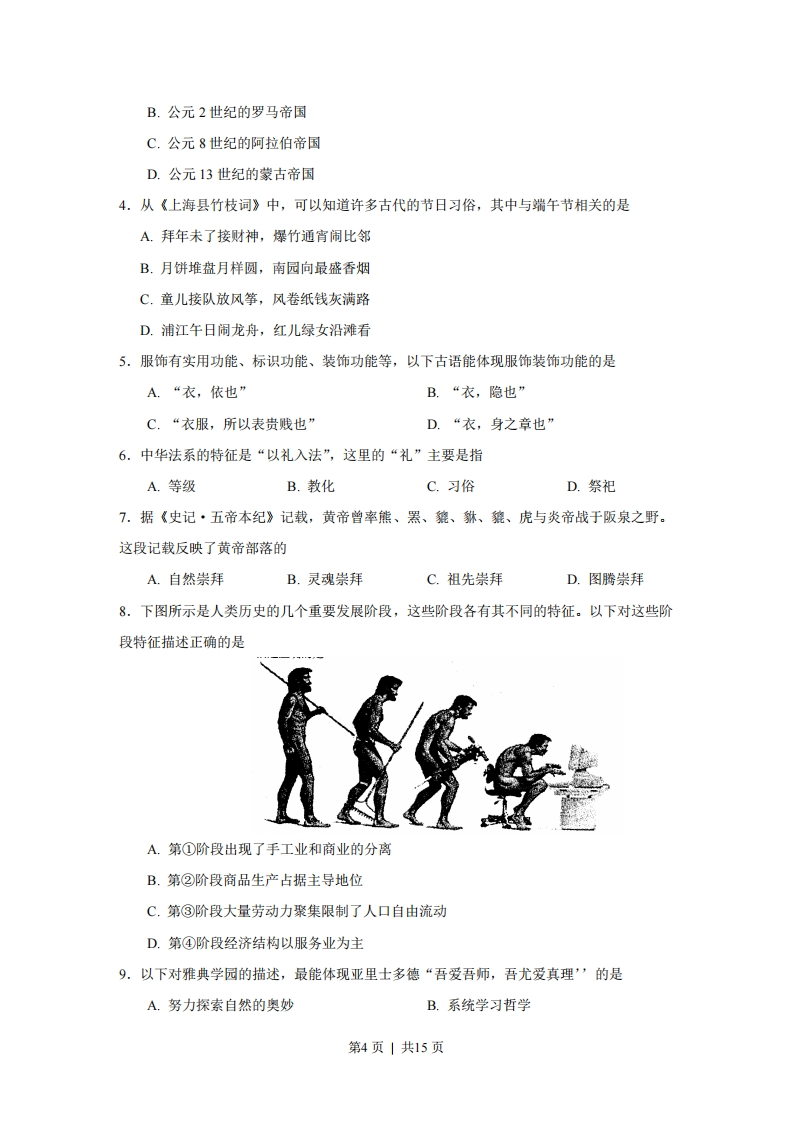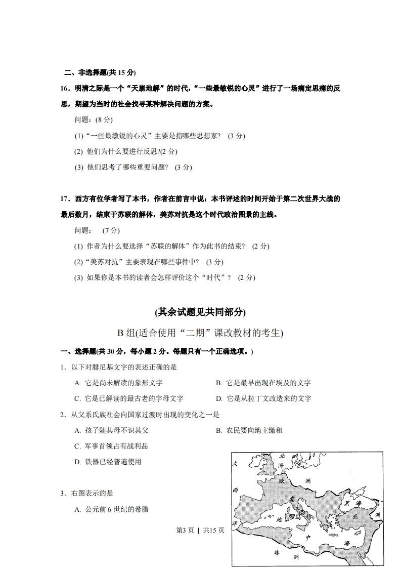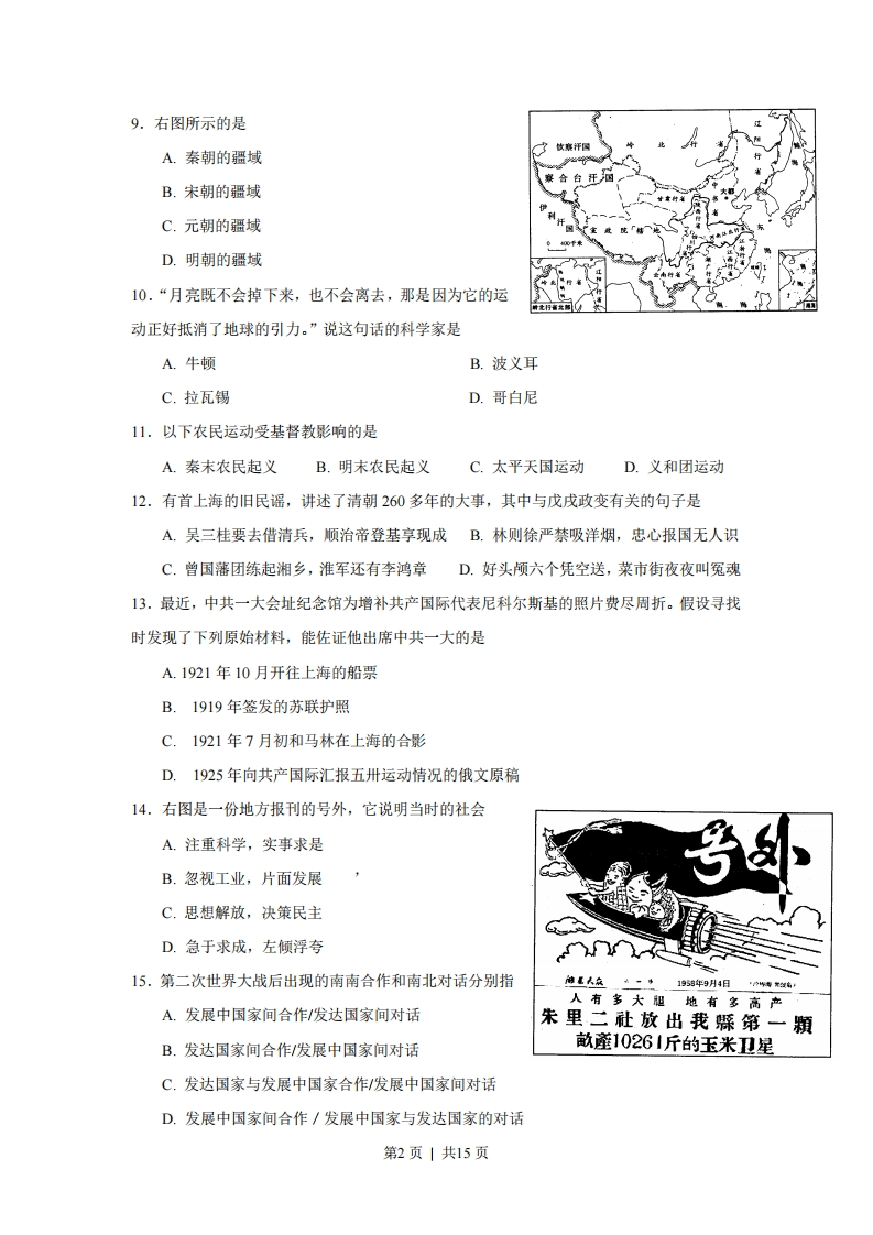 绝密★启封前2008年普通高等学校招生全国统一考试历史(上海卷)分叉部分A组(适合使用“一期”课改教材的考生)一、选择题(共30分,每小题2分。每题只有一个正确选项。)1.“封建亲戚,以藩屏周。”这句话指的是A.分封制B.井田制C.郡县制D.行省制2.战国时期有人提出:“明主之国,无书简之文,以法为教:无先王之语,以吏为师。”这句话反映的是A.儒家的思想B.道家的思想C.墨家的思想D.法家的思想3.有一部断代体史书,首创“志”的体裁,经两代人合作完成。这部书是A.《史记》B.《三国志》C.《汉书》D.《资治通鉴》4.东汉时期“豪强”的基本特征是A.拥兵自重称霸一方B.依靠巧取豪夺聚敛财富C.通过科举获得功名D.世代享有政治经济特权5.均田制是中国古代重要的土地制度,推行该制度的朝代有①西周②北魏③唐朝④明朝A.①②B.②③C.①④D.③④6.“渔阳鼙鼓动地来,惊破霓裳羽衣曲…马嵬坡下泥土中,不见玉颜空死处。”这几句诗所反映的历史事件是A.七国之乱B.八王之乱C.安史之乱D.三藩之乱7.中国历史上推行重文轻武、大将不得据地拥兵政策的朝代是A.西汉B.隋朝C.宋朝D.清朝8.中国古代有许多重大发明,下列发明按出现的先后顺序排列正确的是A.司南、纸、火药、活字印刷B.纸、火药、活字印刷、司南C.火药、活字印刷、司南、纸D.活字印刷、司南、纸、火药第1页|共15页