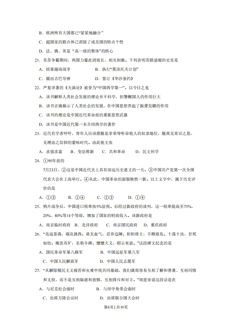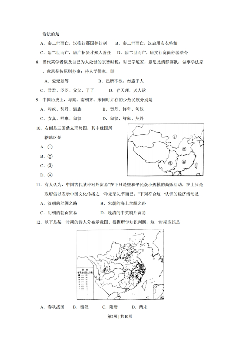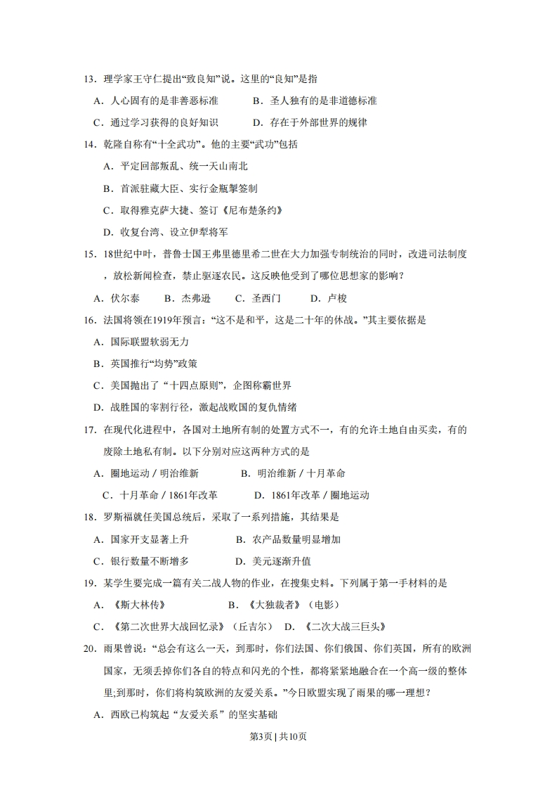 绝密★启封前2011年普通高等学校招生全国统一考试历史(上海卷)一、选择题(共70分)以下每小题2分,共58分,每题只有一个正确的选项。1.一位古希腊人经过实地调查研究,在其著作中记述了希波战争的始末。他是A.伯里克利B.希罗多德C.柏拉图D.罗马2.公元前509年,罗马进入共和国时期,这一时间也可表述为A.公元前5世纪初B.公元前5世纪末C.公元前6世纪初D.公元前6世纪末3.根据所学的知识,右侧表格①②处分别填上采邑改革A.封建等级制:城市的复兴B.封建等级制:民族国家形成①C.城市的复兴:君主专制②商品经济活跃D.民族国家形成:君主专制等级君主制4.拜占庭帝国瓦解前后,许多学者和艺术家迁居意大利半岛,从而大力推动了该地区A.波斯文化的传播B.伊斯兰文化的传播C.古希腊文化的研究D.基督教神学的研究5.中世纪的一位教皇把他的母校巴黎大学称作“为整个世界烤制面包的烤炉”,这一比喻的含义是希望母校A.开展世俗教育B.成为传播神学的中心C.自由探讨真理D.多出学术研究的成果6.在商代,商王和许多邦国首领都称“王”。不过,商王不仅是本国君长,他还是邦国的A.国主B.领主C.盟主D.君主7.历史是复杂的。有时吸取前人的历史教训会导致新问题的产生。下列史实能佐证这一第1页1共10页