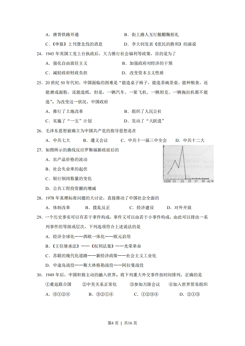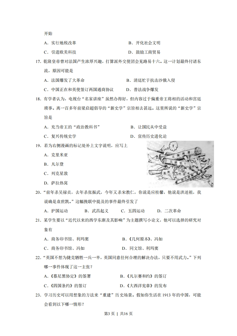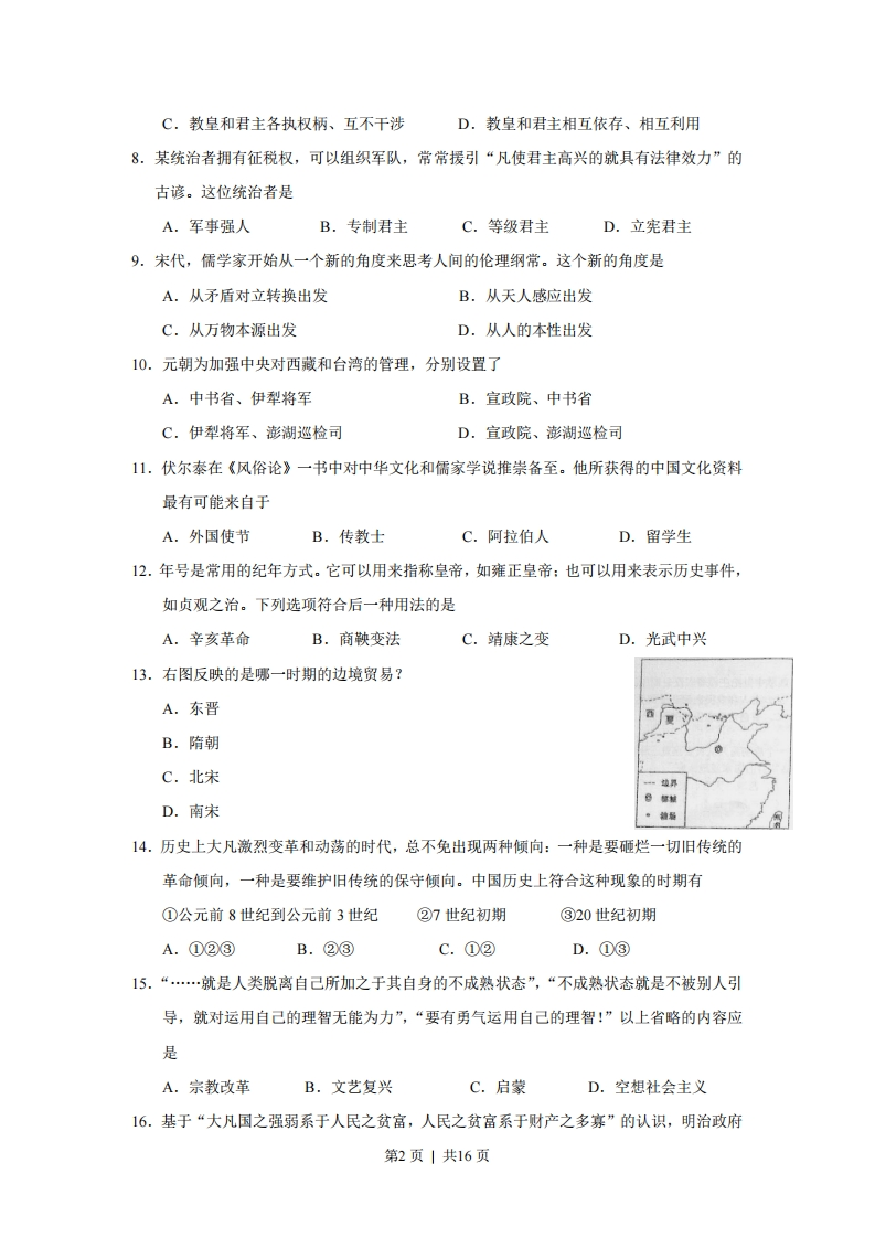 绝密★启封前2010年普通高等学校招生全国统一考试历史(上海卷)一、选择题(共60分,每小题2分。每题只有一个正确选项。)1.新石器时代,人类迎来了第一场重大的经济革命,其标志是A,农耕逐渐取代采集B.采集逐渐取代狩猎C.狩猎逐渐取代驯养D.渔猎逐渐取代采集2.文学是西方文化的载体,其源头可追溯到古代世界,其中对西方文化产生重要影响的是A.《大藏经》、《荷马史诗》B.《旧约全书》、《古兰经》C.《荷马史诗》、《旧约全书》D.《古兰经》、《荷马史诗》3.汉代以来,某地出土了数以千计的青铜重器,青铜铭文多涉及诸侯战争、土地交换等内容。学者推断此地应是A.夏人的活动地域B.周朝的重要都城C.秦朝的阿房宫遗址D.汉初同姓王的封国4.春秋战国时代,诸子百家讲政治时大多站在民众一边,替百姓打算,唯有一家与其他各家不同,为君主参谋,专替君主打算。这一家是A.儒家B.法家C.道家D.墨家5.西欧中世纪庄园和东汉后期庄园的共同特点是A.主人和农民之间有雇佣关系B,具有商品货币关系C.有自营地和份地的区别D.自给自足的经济体6.一个唐朝商人从长安出发,沿着丝绸之路的陆路通道行走。途中可以与他进行贸易的的国家和地区有A.西域、大食、波斯B.大食、波斯、新罗C.西域、日本、大食D.波斯、新罗、日本7.人们在一座古老建筑的墙上发现了一幅画(右图)它反映了西欧中世纪某个阶段的政教关系。其特征是A.教皇拥有至高无上的权威B.教皇成了君主的人质第1页|共16页
