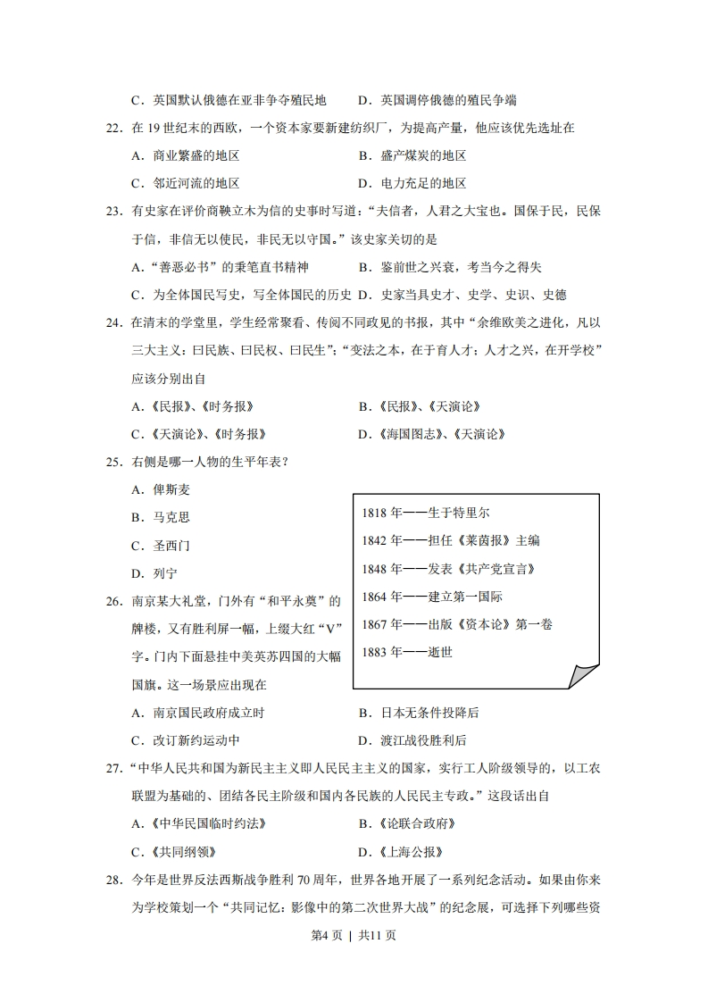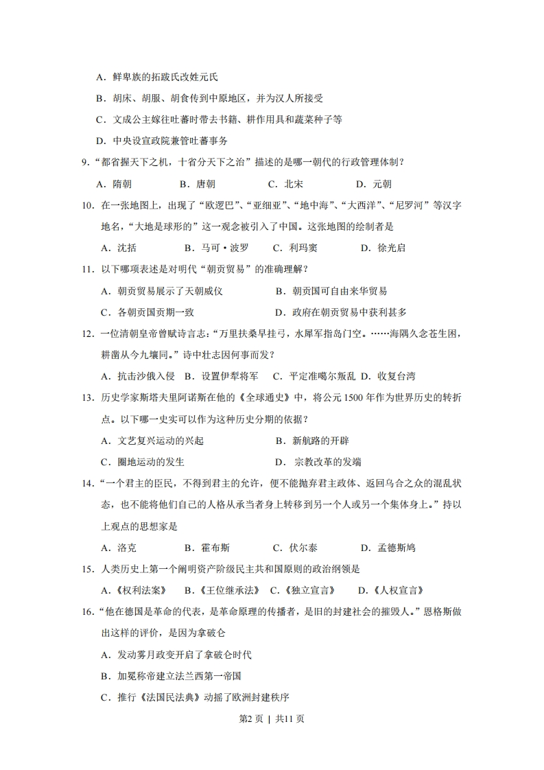 绝密★启封前2015年普通高等学校招生全国统一考试历史(上海卷)一、选择题(共75分)以下每小题2分,共60分。每题只有一个正确选项。1.“一万年农业,五千年文明,两千年大一统”指的是A.中华文明B.埃及文明C.印度文明D.希腊文明2.“什尔巴克,这是个你也知道的市镇,它的位置在幼发拉底。那是个古老的市镇,诸神都在那里存身,是他们让诸大神泛起洪水…”以上文字出自A.《吉尔伽美什》B.《罗摩衍那》C.《摩诃婆罗多》D.《荷马史诗》3.“每一国的人民,一方面要遵守自身特有的法律制度和社会习俗,一方面要遵守全人类共同的法律。…根据自然理性,适用于全人类的法律称为列国通法”。与此理论相关的法律实践是A.汉穆拉比颁布了集古代两河流域各国法律之大成的法典B.梭伦改革时期颁布了废除债务奴隶的法令C.罗马共和国政府公布了“十二铜表法”D.卡拉卡拉皇帝敕令授子罗马帝国全体自由公民以公民权4.在中央集权体制初创的秦朝,选用啬夫的是A.太尉B.皇帝C.郡守、县令D.丞相5.公元前202年汉朝建立。这一年处在A.公元前2世纪初B.公元前2世纪末C.公元前3世纪初D.公元前3世纪末6.“井田之变,豪人货殖,馆舍布于州郡,田亩连于方国”描述的是A.西周诸侯封地的情况B.秦朝实行郡县制后的情况C.汉武帝时代的盛况D.东汉豪强势力膨胀的情况7.为研究三国时代的历史,某同学找来了电脑游戏《三国英杰传》、二十四史中的《三国志》、小说《三国演义》、电视剧《三国》的影碟,其中属于第一手史料的是A.《三国志》B.《三国演义》C.《三国》D.《三国英杰传》8.以下史实中哪一项反映了唐代的民族交往?第1页|共11页