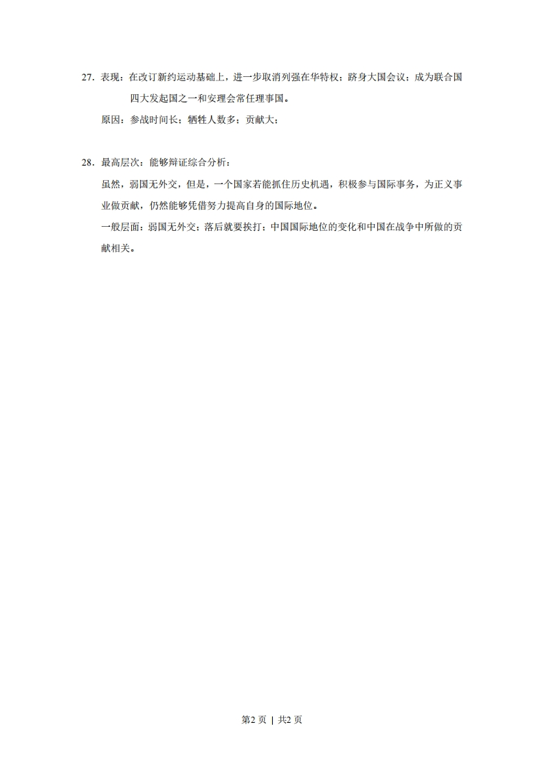 2017年上海市普通高中等级性考试历史试题参考答案一、选择题(共40分,每小题2分。每小题只有一个正确答案)题号1236910答案A日AA0B题号121314151617181920答案DCCDBBCDA二、综合分析题(共60分)21.汉:B:唐:C:宋:A:清:D22.ADBCFGE23.一手:BC:二手:A24.分层给分:25.事实陈述:第二层:卢梭天赋人权的理论认为:私有制是人类不平等的根源,卢梭批判该制度:结论:是一个真正的民主主义者:第三层:卢梭发展了社会契约学说,提出主权在民,认为人民是政治共同体的主权者,政府是由人民所同意的人组成的:人民可以对政府加以限制等:26.作用:一战:中国虽然未出兵,但中国民众对协约国战事不乏助力,包括劳务输出、国内华商、外国华侨赞助:待遇:一战后巴黎和会受到不公正待遇,作为战胜国仅获两个席位,国际地位较低。第1页|共2页