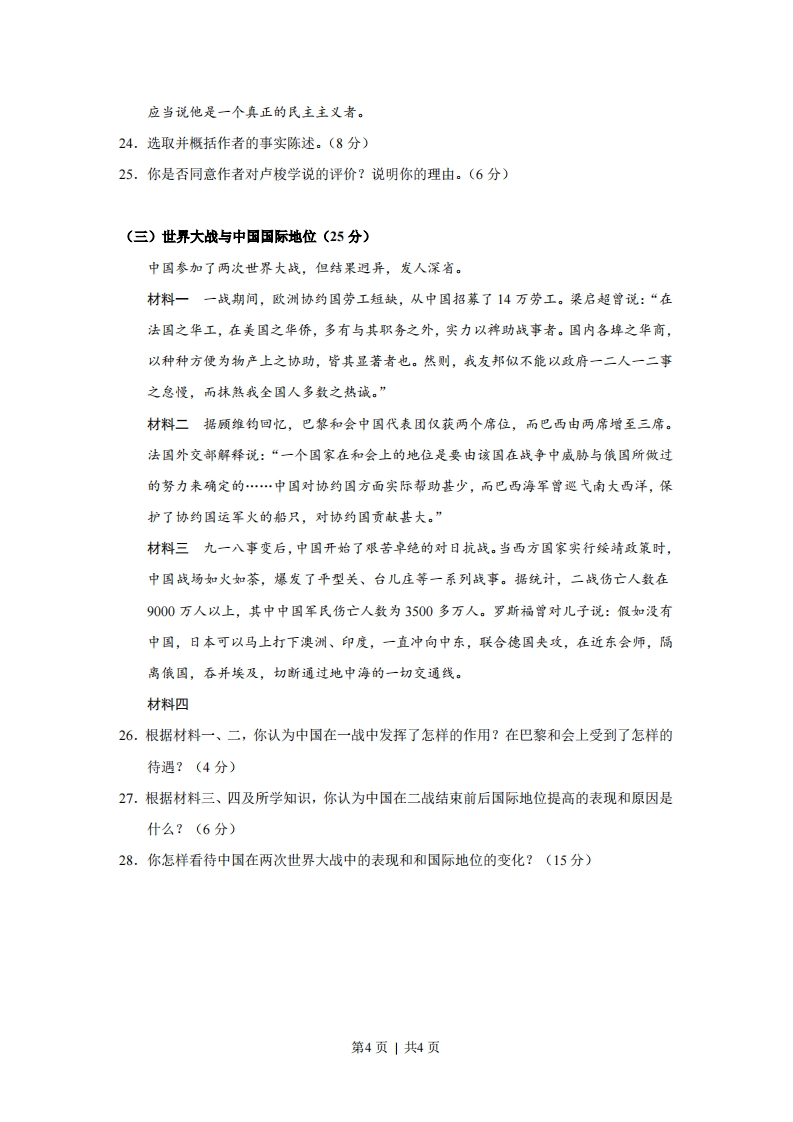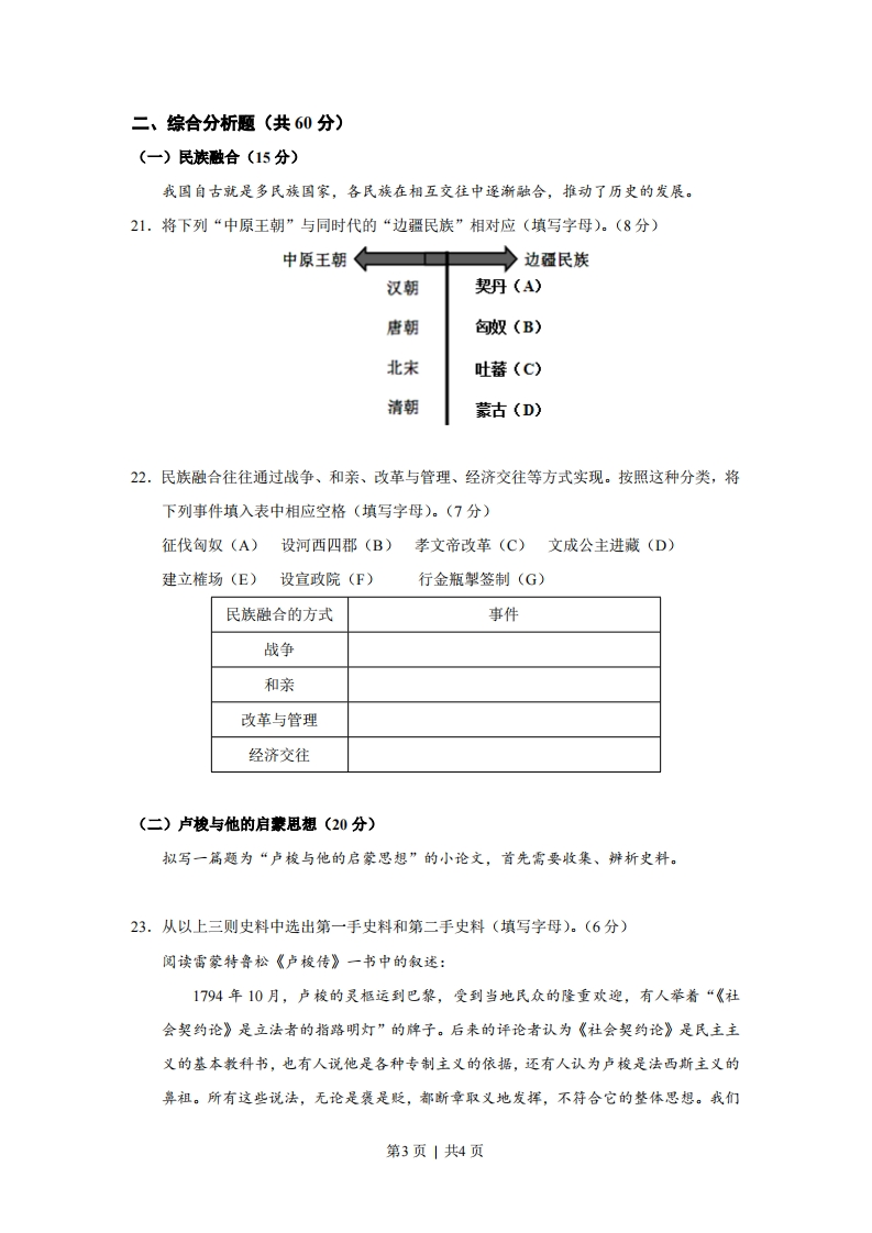 2017年上海市普通高中等级性考试历史试题一、选择题(共40分,每小题2分。每小题只有一个正确答案)1.早期先民的集体记忆是研究远古社会的重要依据,通常被称为A.神话传说B.考古遗存C.实物资料D.文字实录2.史学家虽未发现夏朝考古的直接证据,但发现了与其时间地点最吻合的遗址,它是A.姜寨遗址B.崧泽遗址C.二里头遗址D.殷墟遗址3.公元前770年,周平王把都城迁到洛邑。这一时间也可表述为A.公元前7世纪前期B.公元前7世纪后期C.公元前8世纪前期D.公元前8世纪后期4.战国时期,孟子将儒家“仁”的观念升华为“仁政”学说,提出A.重义轻利B.民贵君轻C.天人感应D.正心诚意5.“市舶之利,颇助国用”这种现象的发生得益于A.张骞出使西域B.遣唐使节来华C.海上丝路繁荣D,朝贡贸易推行6.刘知几认为史家著史必须不加隐讳,如是撰写,意思就是A.秉笔直书B.知往鉴来C.经世致用D.祥今略古7.“我朝罢相…以后嗣君,并不许立丞相。”其中“我朝”是指A.秦朝B.汉朝C.唐朝D.明朝8.历史学家使用“原始积累”“君主专制”“人文主义”等词汇来描述A.西欧社会的演变B.早期资产阶级革命的爆发C.工业社会的来临D.资本主义世界体系的形成9.英国工业革命时期,出现了下列那一重要现象?A.手工工场建立B.城市化进程开始C.垄断组织产生D.资本全球扩张10.太自鸣钟设置于工部局,“报时报刻,远近咸闻”。这种情景最先出现在A.汉口B.上海C.天津D.重庆11.开创两种社会制度竞争格局的历史事件是第1页|共4页