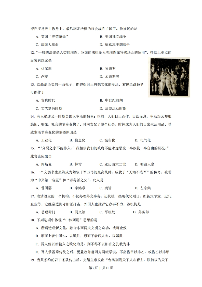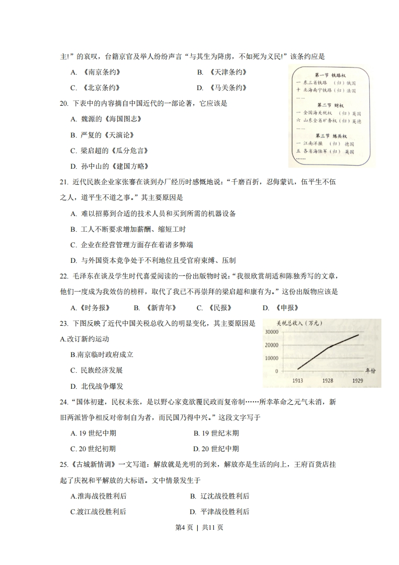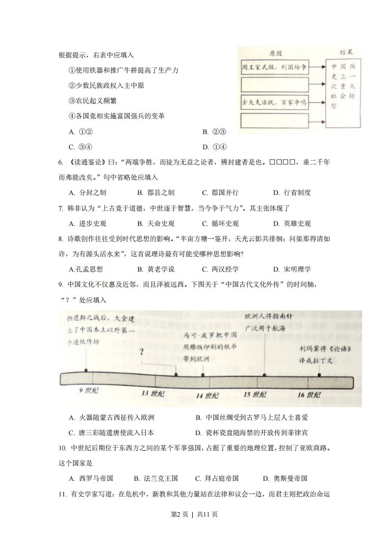 绝密★启封前2016年普通高等学校招生全国统一考试历史(上海卷)一、选择题(共75分)以下每小题2分,共60分。每题只有一个正确选项。1.古希腊人所称的“美索不达米亚'’位于右图中A.①B.②C.③D.④2.有学者认为河南偃师二里头文化遗址是传说中的夏朝都邑。以下考古发现中,最有力的证据是A.石制农具B.青铜礼器C.宫殿遗址D.家畜遗骨3周公日:“惟殷先人,有册有典”。殷人的册典主要指的是B4.公元前1046年,武王率兵在牧野打败商军,建立周朝。这一年处在A.公元前10世纪上半叶B.公元前10世纪下半叶C.公元前11世纪上半叶D.公元前11世纪下半叶5.探究因果关系是历史学习的重要技能。第1页|共11页