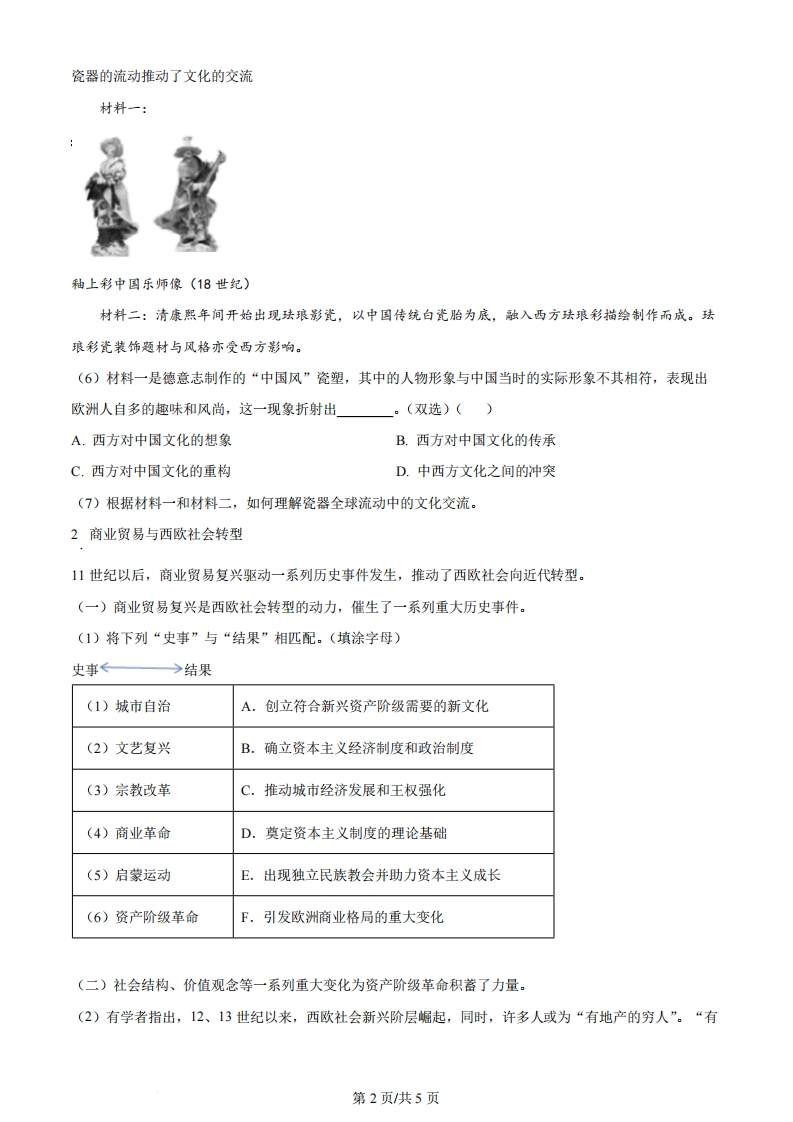 2024年上海卷历史卷学科等级考试试题免责声明:试题来自网络,非官方渠道,学科网不对真实性负责,请自行鉴别1.瓷器的全球流动中国瓷器在中西方文明交流过程中,扮演着载体和象征的角色。自新航路开辟以来,中国与欧洲的距离被极大地拉近,从前需要在东南亚、南亚、阿拉伯诸国进行转运的中国瓷器,如今与欧洲有了更直接的联系通道。(一)瓷器行销世界(1)随着制瓷技术的重大改进,瓷器远销海外,成为继丝绸之后中华文明新的文化符号,这发生于、。(单选)()A.秦汉时期B.魏晋时期C.隋唐时期D.宋元时期(2)不同时代、不同类型的中外交通路线为瓷器行销世界提供了便利,将下列示意图中的交通路线填入空格中(填涂字母)①有研究表明,810世纪中国瓷器己经由中亚的撒马尔罕传入大食国境内,该路线是②郑和出使西洋,曾将一批景德镇官窑的瓷器作为外交礼物赠与外邦。他出使的路线是③16世纪上半叶,葡萄牙向中国订购了一批带有王室徽章的瓷器,其葡萄牙的运输路线是(3)1784年,美国商船“中国皇后号”抵达中国港口,其与中国的瓷器贸易由官方指定机构代理,该机构是。(单选)(A.宣政院B.市舶司C.中书省D.广州十三行(4)结合地图及所学,分析中国的瓷器不断外传的原因有。(双选)()A.外部需求B.军事扩张C.技术传播D.工艺精湛(二)瓷器影响世界(5)欧洲瓷器大量订货,直接促使欧洲众多城市成为专门的手工业市镇,开始进行了“流水线式生产”,生产效率不断增加,这得益于。(单选)A.工厂制度的确定B.资本主义的垄断C.手工工坊的发展D.殖民活动的兴起第1页共5页