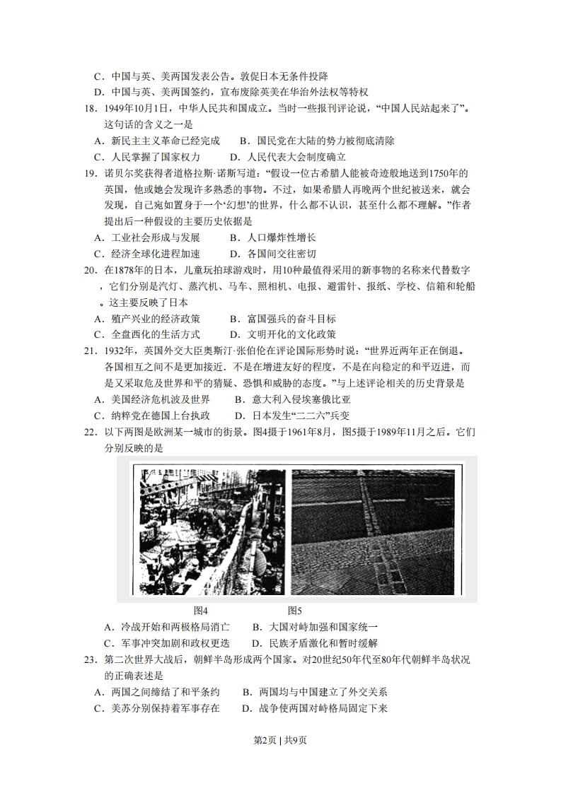 2008年普通高等学校招生全国统一考试(全国卷丨)文科综合(历史部分)本试卷分第I卷(选择题)和第Ⅱ卷两部分。第I卷1至7页,第Ⅱ卷8至12页,共300分。考生注意:1.答题前,考生务必将自己的准考证号、姓名填写在答题卡上。考生要认真核对答题卡上粘贴的条形码的“准考证号、姓名、考试科目”与考生本人准考证号、姓名是否一致。2.第I卷每小题选出答案后,用2B铅笔把答题卡上对应题目的答案标号涂黑,如需改动,用橡皮擦干净后,再选涂其他答案标号。第Ⅱ卷用黑色墨水签字笔在答题卡上书写作答。在试题卷上作答,答案无效。3.考试结束,监考员将试题卷、答题卡一并收回。第I卷(选择题)本卷共35小题,每小题4分,共140分。在每小题给出的四个选项中,只有一项符合题目要求。13.一位在华美国人士在评论近代中国的一部著作时说:“它是因中英战争刺激而产生的一部成果。我们认为它将极大地摧毁傲慢心态,驱散中国统治者和学究们的愚味无知,证明他们所属的并非地球上的惟一一个国家。”该著作的作者是A.姚莹B.徐继畲C.郑观应D.严复14.洋务运动时期,有一类企业是“由官总其大纲,察其利病,而听该商董等自立条议,悦服众商”。采用选种经营管理方式的企业是A.江南制造总局B.轮船招商局C.发昌机器厂D.耶松船厂15.1920年,梁启超在《欧游心影录》中谈到“科学万能说”时,认为它“当然不能像从前一样的猖獗”。梁启超之所以这样说,是因为A.科学技术在中国的传播遇到阻碍B.科学技术在欧洲的发展水平很高C.科学技术在世界大战中成为战争工具D.科学技术的发展速度减缓16.抗日战争时期,陕甘宁让区“不禁止地主、富农、国民党员参选议员”。这说明陕甘宁边区A.实行民主选举制度B.接受国民政府直接领导C.实现了国菇两党党内合作D.组建了多党联合政府17.美国《时代》周刊评论说,1943年1月相关外交文件的签署“开辟了中国与西方列强之间关系的新纪元”。这一评论指的是A.中国与英、美等国签署宣言,保证团结一致打败法西斯B.中国与英、美两国签署宣言,要求日本无条件归还侵占的中国领土第1页|共9页