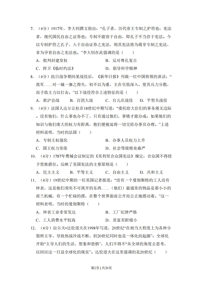 2009年全国统一高考历史试卷(全国卷I)一、选择题(共12小题,每小题4分,满分48分)1.(4分)古人在分析姓氏起源时说:“氏于国,则齐鲁秦吴..氏于字,则孟孙叔孙:氏于居,则东门北郭。”由此推论,司马、司徒等姓氏应源自()A.官名B.爵位C.谥号D.行业2.(4分)“四面楚歌”典出楚汉战争。西汉初期,“楚歌”在社会上风行一时。这主要是因为()A.南方经济的影响B.统治集团的更替C.北方文化的衰落D.民族融合的结果3.(4分)南朝秀美灵动,北朝刚健雄浑,南北文化共同孕育了唐代文化的新气象。以下最能体现南方文化特征的是()A.初唐书法B.秦王破阵曲C.飞天壁画D.唐三彩4.(4分)如表汉至宋南北方户数变化表(单位:万户)年代西汉元始二年晋太康元年唐天宝元年宋元丰三年区域北方965149493459南方11165257830(据钱穆《国史大纲》)影响表如表汉代至宋代南北方户数变化的主要因素是()A.朝代时间长短B.王朝力量强弱C.疆域面积大小D.经济格局变化5.(4分)辽与西夏分别是契丹与党项建立的少数民族政权,两者的相似之处是()A.两族均源出秦汉时期的东胡B.创立政权在宋朝建立之后C.仿汉字结构创制本民族文字D.均曾与北宋结为兄弟之国6.(4分)1858年,中英《天津条约》规定:“嗣后各式公文,无论京外,内叙大英国官民,自不得提书夷字。”这表明当时的中国()A.已经形成平等的外交观念B.“天朝上国”规制受到冲击C.对西方列强产生崇拜心理D.受到西方文化的广泛影响第1页1共20页