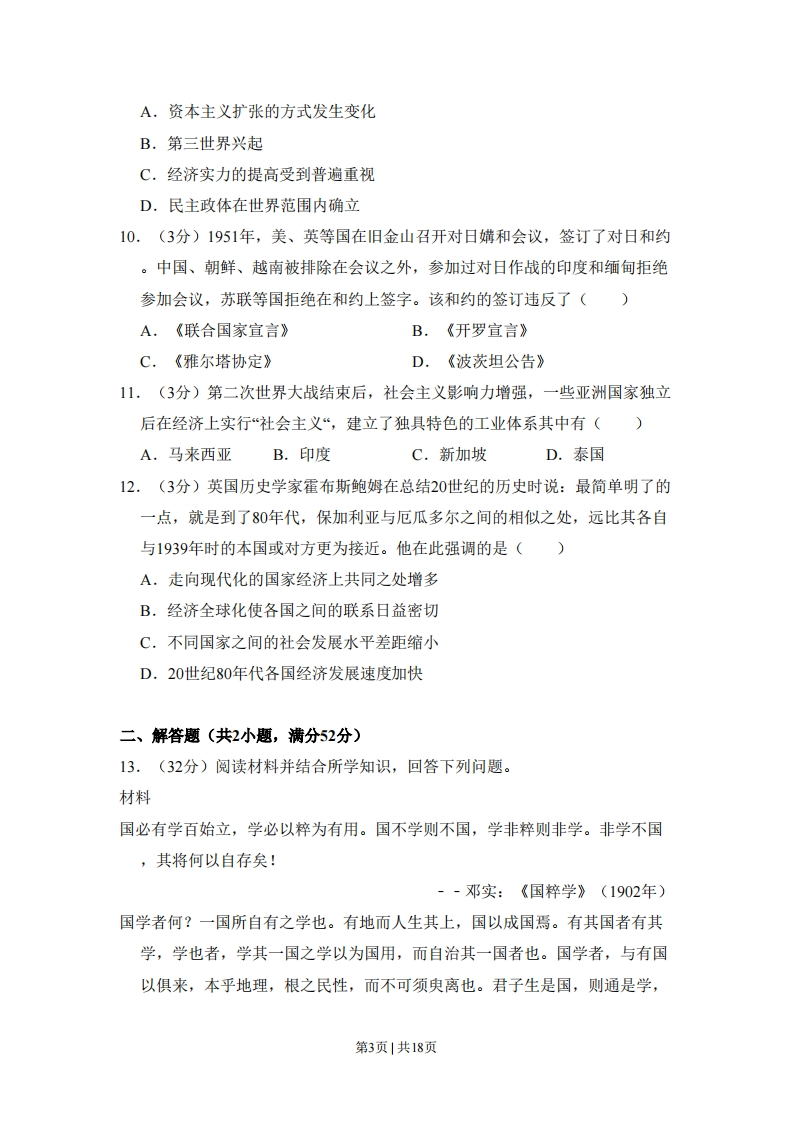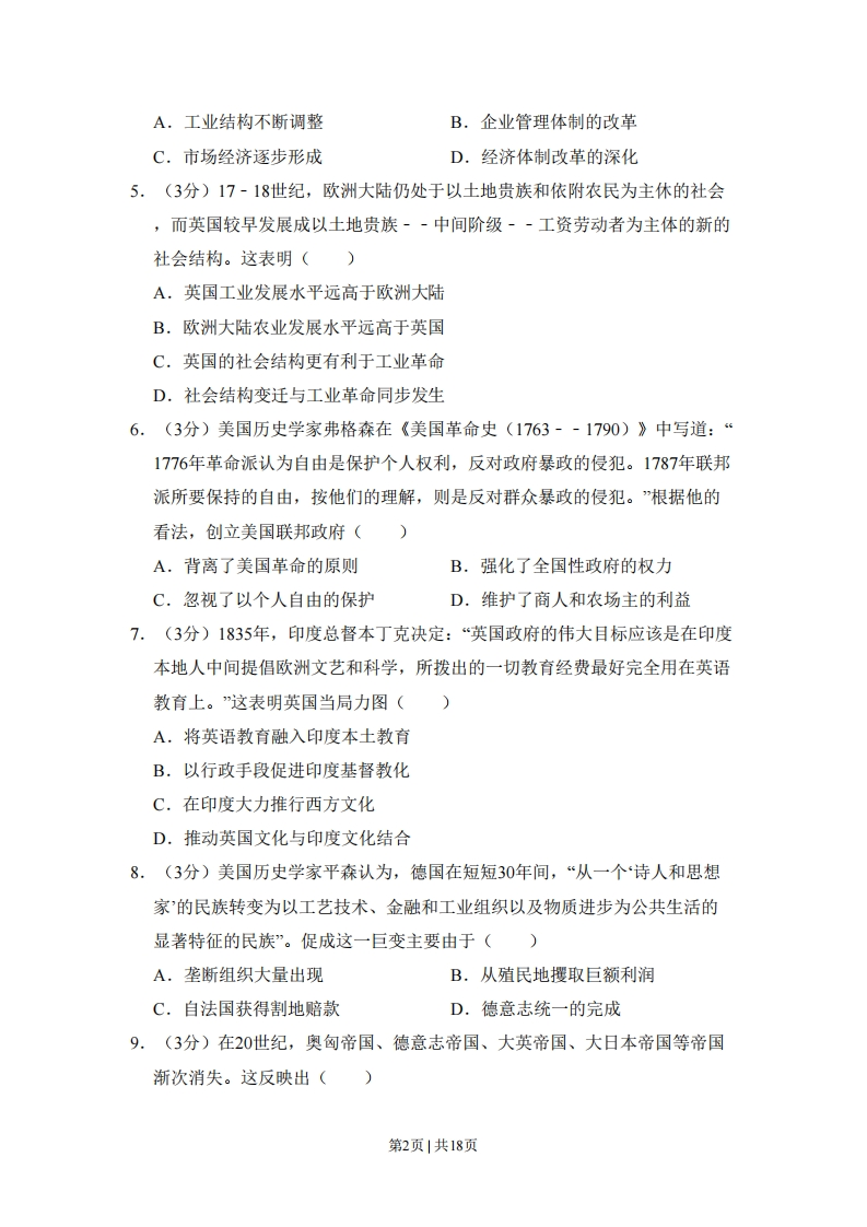 2009年全国统一高考历史试卷(全国卷)一、选择题(共12小题,每小题3分,满分36分)1.(3分)关于中国姓氏起源,唐人柳芳说:“氏于国,则齐鲁秦吴;氏于谥,则文武成宣.氏于事,则巫乙匠陶。”由此类推,王、侯、公孙等姓氏应源自()A.族号B.邑号C.爵号D.官号2.(3分)隋唐时期商业经济较之前代有很大的发展,但仍有许多阻碍其进一步发展的因素,其中有()A.废除五铢钱B.市坊分区C.实行两税法D.草市兴起3.(3分)如图所示战役是()nun长罐乏什克的宣化京师战役示意图A.明朝与瓦刺之战B.明朝与后金之战C.清军反击噶尔丹之战D.清军平定大小和卓之战4.(3分)表11978、1997年我国工业总产值中各种经济成分比重表(%)类别国有及国有控股工业集体工业城乡个体工业其他经济类型工业年份1978年77.622.41997年25.538.117.918.5表1反映了我国工业总产值中各种经济成分的变化。这一变化的主要原因是(第1页1共18页