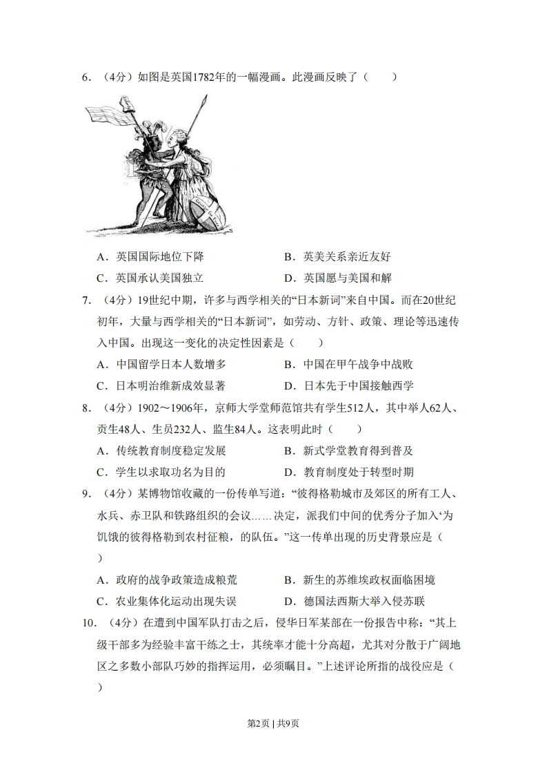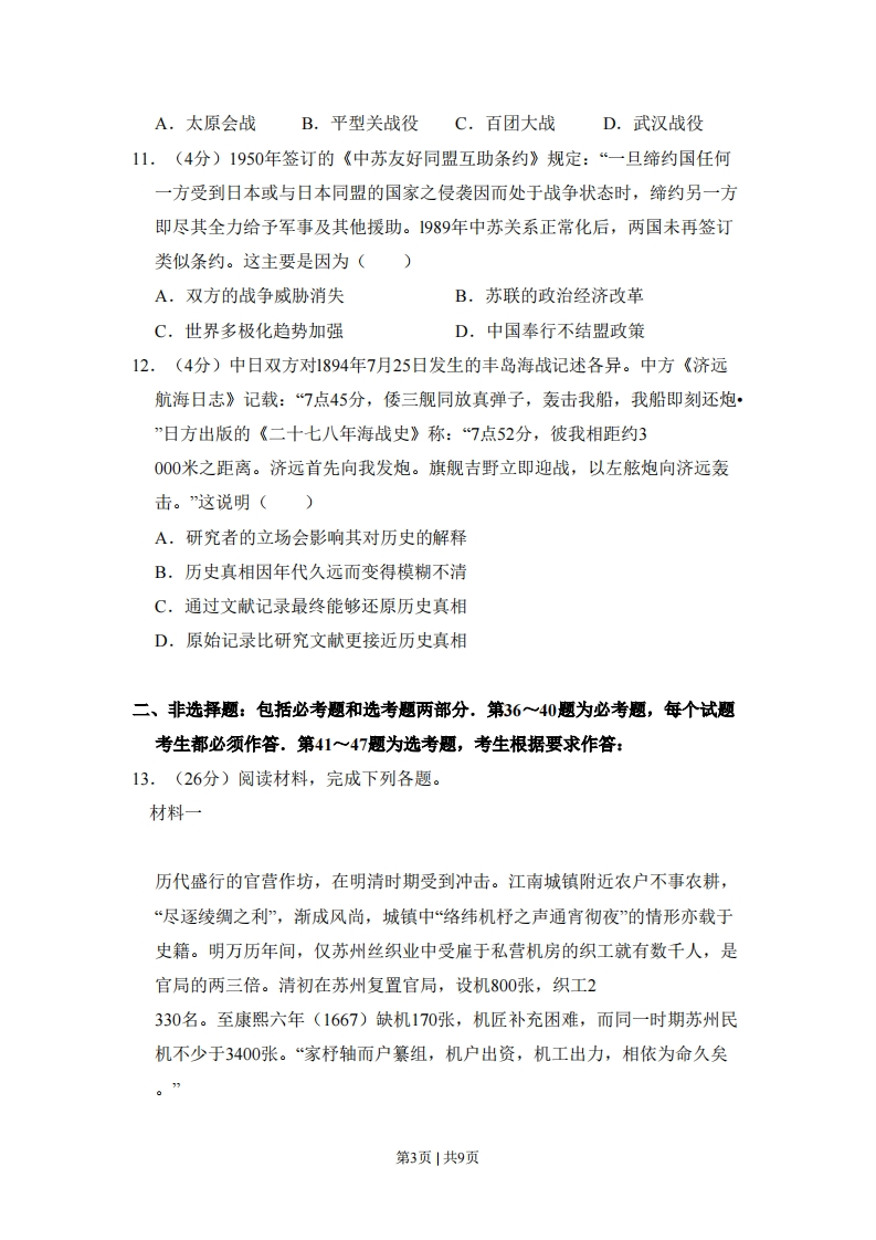 2010年全国统一高考历史试卷(新课标)一、选择题:本题共12小题,每小题4分,共140分.在每小题给出的四个选项中,只有一项是符合题目要求的。1.(4分)西周分封制在中国历史上影响深远。下列省、自治区中,其简称源自西周封国国名的是()A.河南、河北B.湖南、湖北C.山东、山西D.广东、广西2.(4分)柳宗元在(封建论》中评价秦始皇废封建、行郡县说:“其为制,公之大者也..公天下之端自秦始。”郡县制为“公天下”之开端,主要体现在()A.百姓不再是封君的属民B.更有利于皇帝集权C.制度法令的统一D.依据才干政绩任免官吏3.(4分)王安石提出“形者,有生之本”,与之相对立的观点是()A.“心外无物”B.“天地为万物之本”C.“夫形于天地之间者,物也D.“舍天地则无以为道”4.(4分)如表明代洪武至弘治年间(1368~1505)徽州祁门土地买卖契约情况表时间使用通货类别及契约张数洪武年间至永乐年间宝钞23、银1、布1宣德年间至景泰年间宝钞4、银27、布42、稻谷4天顺年间至弘治年间银52、稻谷1表中反映了(A.宝钞在民间的信用降低B.社会经济大幅度衰退C.生活资料均可作为支付手段D.白银始终是主要流通货币5.(4分)亚里士多德在《政治学》中认为,世上有两种形式的平等,即数量平等和比值平等。数量平等是绝对平均主义:比值平等则根据个人的实际价值,按比例分配与之相称的事物。根据上述观点,通常所说的“分数面前人人平等”应该是()A.更接近于数量平等B.更接近于比值平等C.数量平等高于比值平等D.既非数量平等又非比值平等第1页|共9页