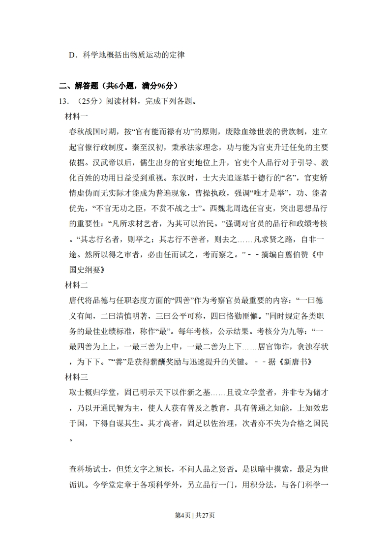 2011年全国统一高考历史试卷(新课标)一、选择题(共12小题,每小题2分,满分24分)1.(2分)董仲舒认为孔子撰《春秋》的目的是尊天子、抑诸侯、崇周制而“大一统”,以此为汉武帝加强中央集权服务,从而将周代历史与汉代政治联系起来。西周时代对于秦汉统一的重要历史影响在于()A.构建了中央有效控制地方的制度B.确立了君主大权独揽的集权意识C.形成了天下一家的文化心理认同D.实现了国家对土地与人口的控制2.(2分)如图是依据《隋书·食货志》等制作的南北朝时期各地区货币使用情况示意图。该图反映出()皿主要使用铜币的地区网主要使用金银作为货币的地区国主要使用绢、帛作为货币的地区A.长江流域经济水平总体上高于黄河流域B.河西走廊与岭南地区经济发展速度最快C.黄河流域的丝织业迅速发展D.长江流域经济发展相对稳定3.(2分)黄宗羲在《明夷待访录》中说:“使朝廷之上,闾阎之细,渐摩濡染,莫不有诗书宽大之气,天子之所是未必是,天子之所非未必非,天子亦遂不敢自为非是,而公其非是于学校。”与这一论述的精神实质最为接近的是()A.天下兴亡,匹夫有责B.民为邦本C.天下为公D.民贵君轻4.(2分)苏格拉底在受审时申辩说:“打一个可笑的比喻,我就像一只牛虻,整天到处叮住你们不放,唤醒你们、说明你们、指责你们..我要让你们知第1页1共27页