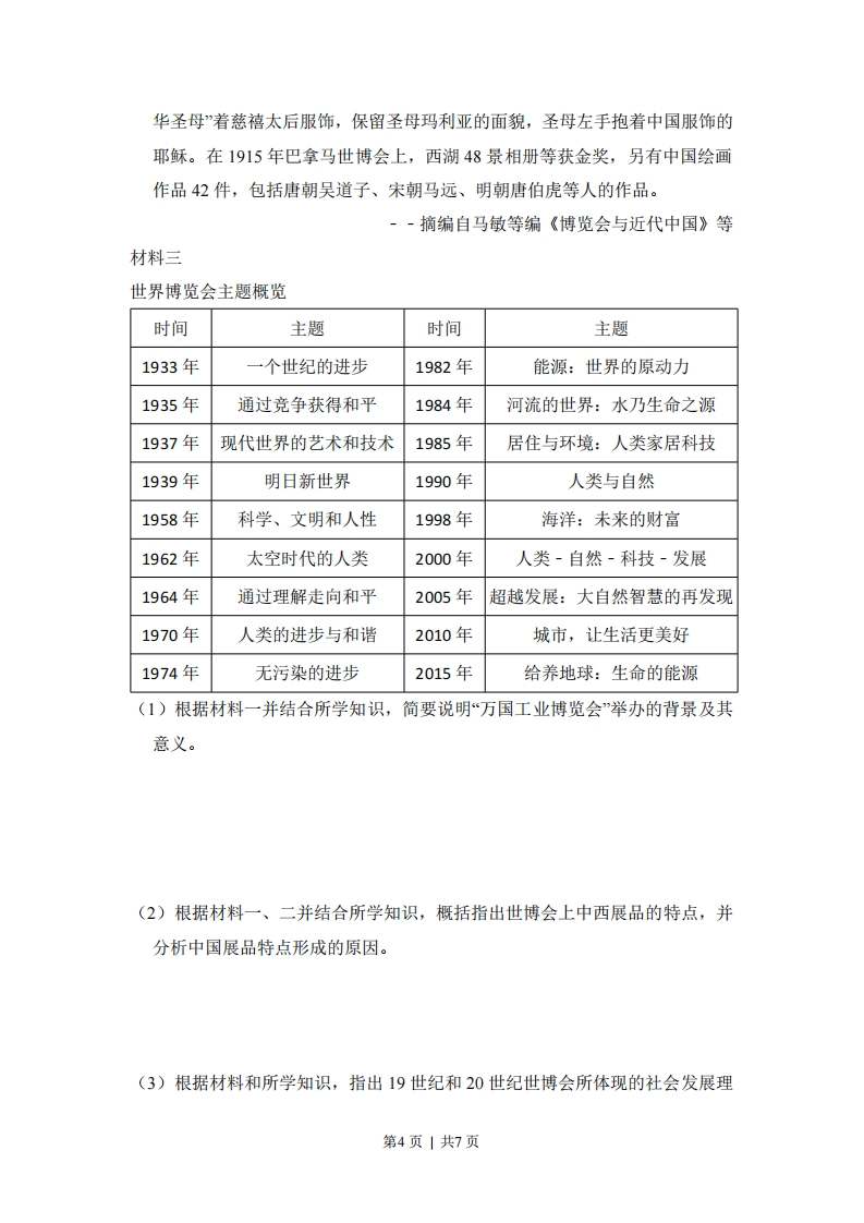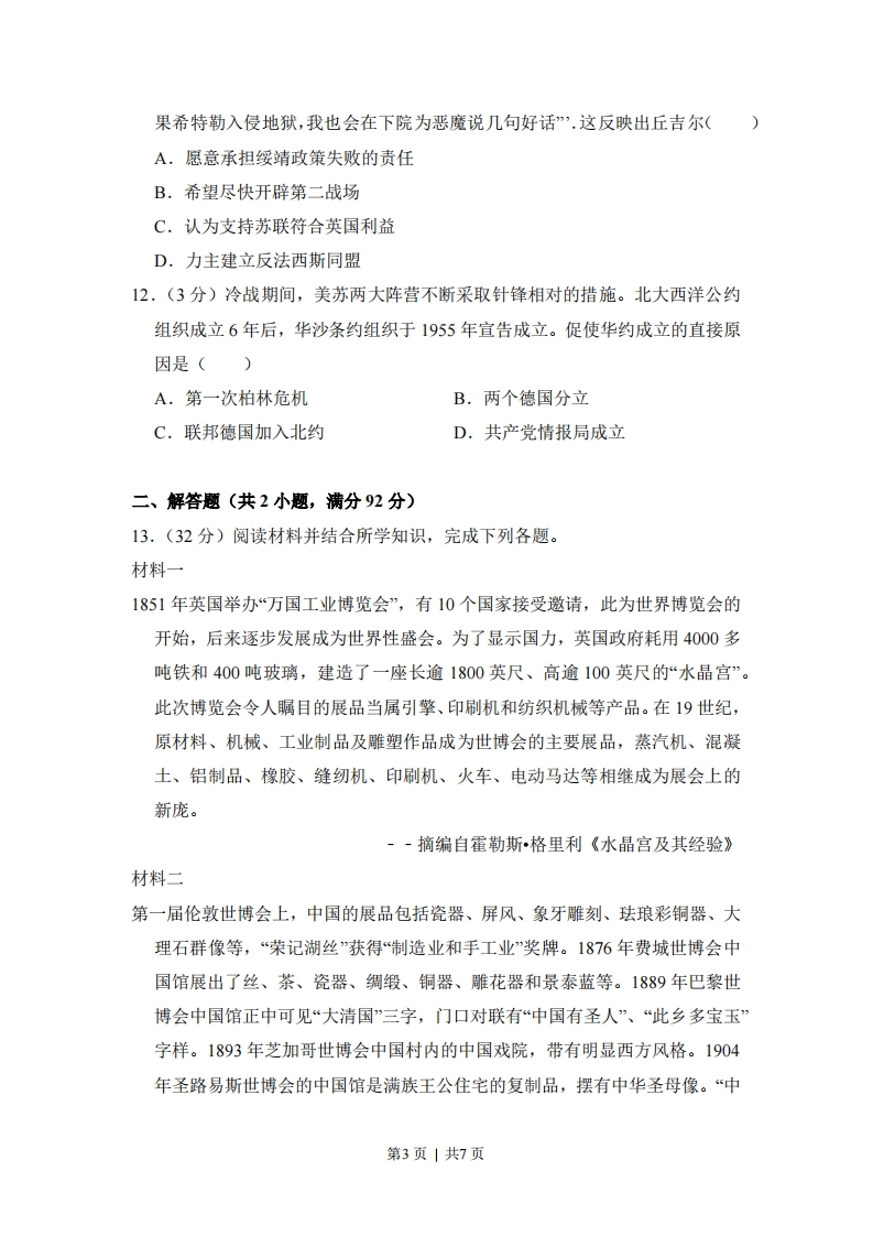 2012年全国统一高考历史试卷(大纲版)一、选择题1,(3分)秦汉而后,官府下层文职人员俗称“刀笔吏”,这一称谓起因于秦汉时期此类人员的()A.工作器具B.工作内容C.工作职责D.工作性质2.(3分)唐太宗说:“工商杂色之流.止可厚给财物,必不可超授官秩,与朝贤君子比肩而立,同坐而食。”在此唐太宗强调的是()A.防止官商勾结B.维持社会等级C.重义轻利D.重农抑商3.(3分)王国维《宋元戏曲考》称:“凡一代有一代之文学...唐之诗、宋之词、元之曲,皆所谓一代之文学,而后世莫能继焉者也。独元人之曲,为时既近,托体稍卑,故两朝史志与四库集部,均不著于录:后世儒硕,皆鄙弃不复道。”这反映了()A.元代文学不为后世所重视B.厚古薄今的观念影响深刻C.士大夫对市民文化的排斥D.八股取士抑制新文学形式4.(3分)清帝雍正朱批谕旨说:“山右(今山西)大约商贾居首,其次者犹肯力农,再次者谋入营伍,最下者方令读书。联所悉知,习俗殊可笑。”这反映出当地()A,商人的政治地位已经跃居首位B.学而优则仕的传统已被抛弃C.重农抑商政策并没有得到实施D.传统观念因追求财富而改变5.(3分)张塞评论某人时说:“以四朝之元老,筹三省之海防,统胜兵精卒五十营,设机厂、学堂六七处,历时二十年之久,用财数千万之多.曾无一端立于可战之地,以善可和之局。”张塞评论的是()A.曾国藩B.李鸿章C.张之洞D.袁世凯6.(3分)1928年,南京国民政府制定的《海关进口税则》确定进口货物税率为7.527.5%,这废止了近代某一条约的相关规定。这一条约是()A.《南京条约》B.《天津条约》C.《马关条约》D.《辛丑条约》第1页|共7页