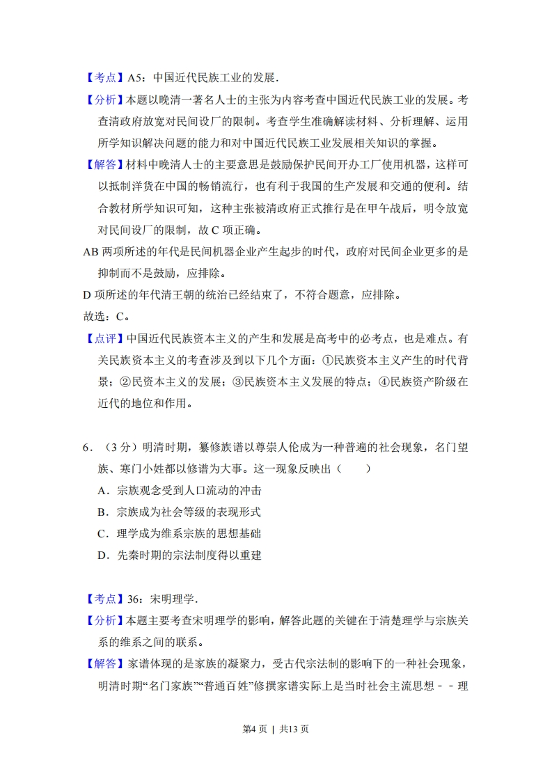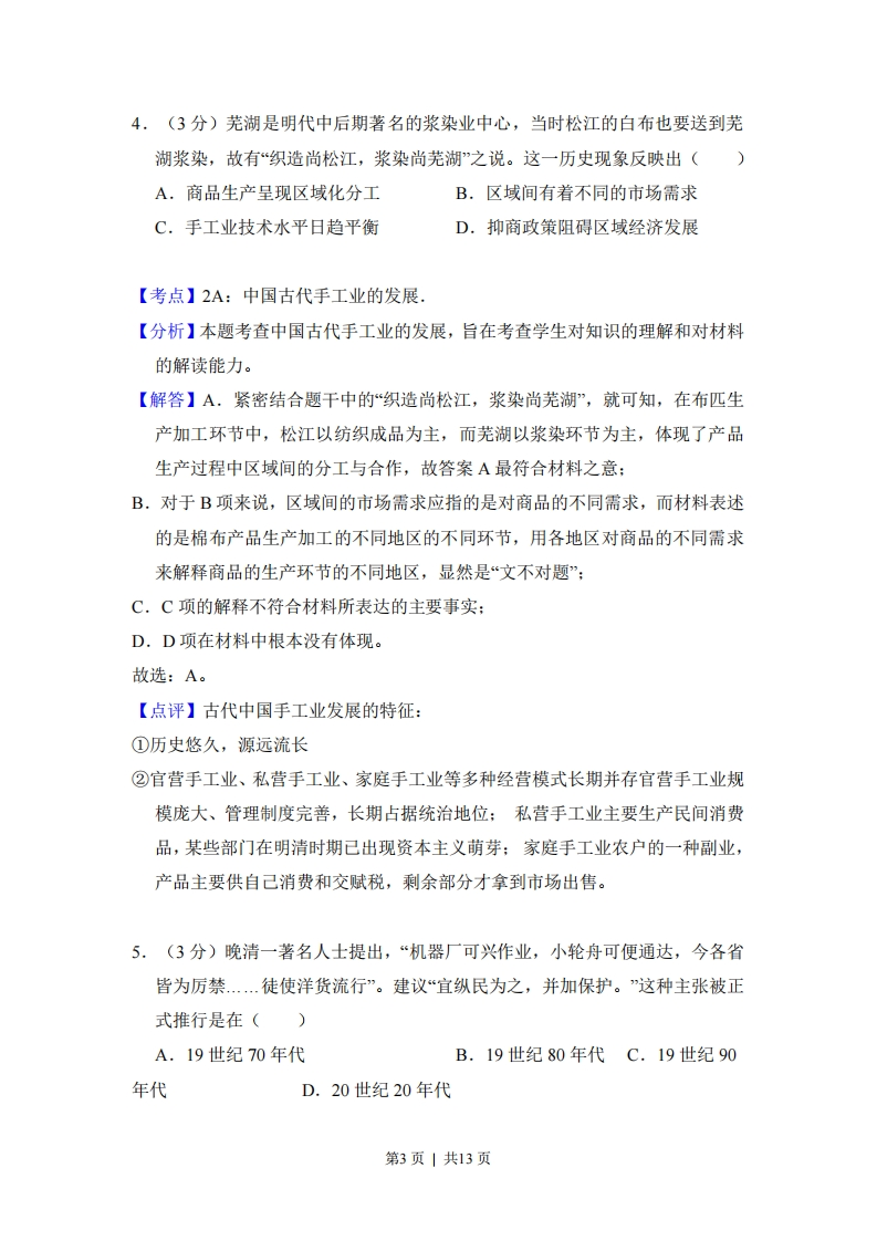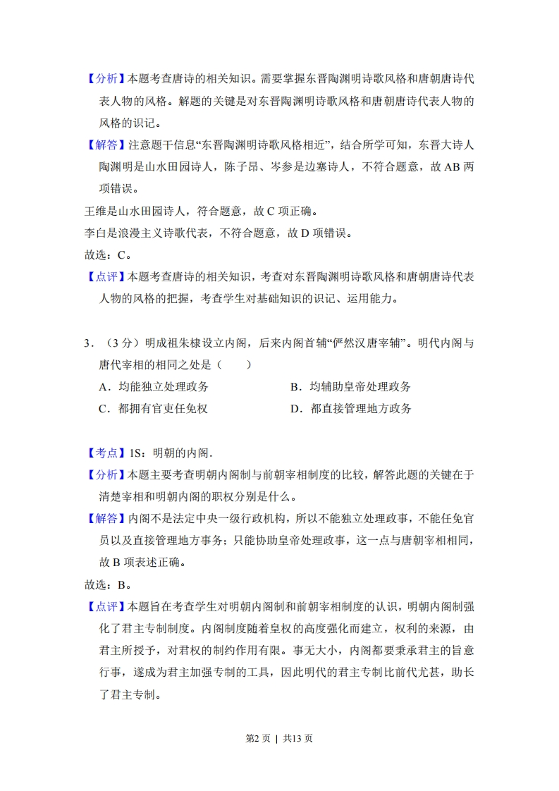 2014年全国统一高考历史试卷(全国卷)事考答案与试题佩析一、选择题(共12小题,每小题3分,满分36分)1.(3分)汉初,官方禁止商人“衣丝乘车”,但后来一些商人“假二千石(官员级别)舆服导从作倡乐,奢侈日甚”。这反映出()A.朝廷的抑商政策发生了重大转变B.休养生息造成消费观念的改变C.官员与商人的社会地位渐趋一致D.原有规制受到商业发展的挑战【考点】2X:重农抑商政策及其影响.【分析】本题考查重农抑商政策及其影响,重农抑商是中国历代封建王朝最基本的经济指导思想,其主张是重视农业、以农为本,限制工商业的发展。【解答】根据题干材料中禁止商人“衣丝乘车”到“假两千石”以及“倡乐“奢侈”等信息说明传统重农抑商政策收到现实的挑战,故D正确:封建社会抑商政策一直没有改变,故A错误:BC与材料信息不符,排除。故选:D。【点评】重农抑商政策在封建社会初期对当时农业以及社会经济的发展、维护社会稳定、巩固新兴地主阶级政权起了积极作用。例如商鞅变法,实行重农抑商政策,鼓励发展农业生产,从而促进了秦国的经济实力不断增强,为后来秦始皇统一六国奠定了物质基础。2,(3分)东晋南朝诗人的作品在唐代成为模仿的对象。下列唐代诗人中,与东晋陶渊明诗歌风格相近的是()A.陈子昂B.岑参C.王维D.李白【考点】3N:唐诗.第1页|共13页