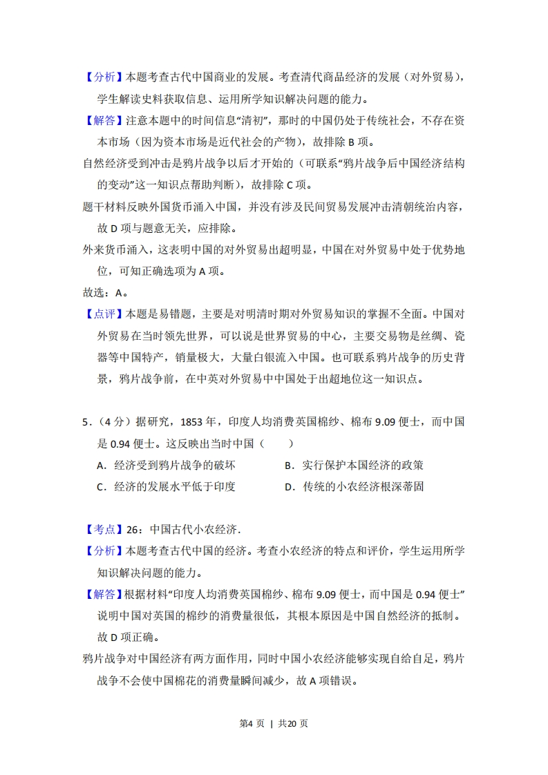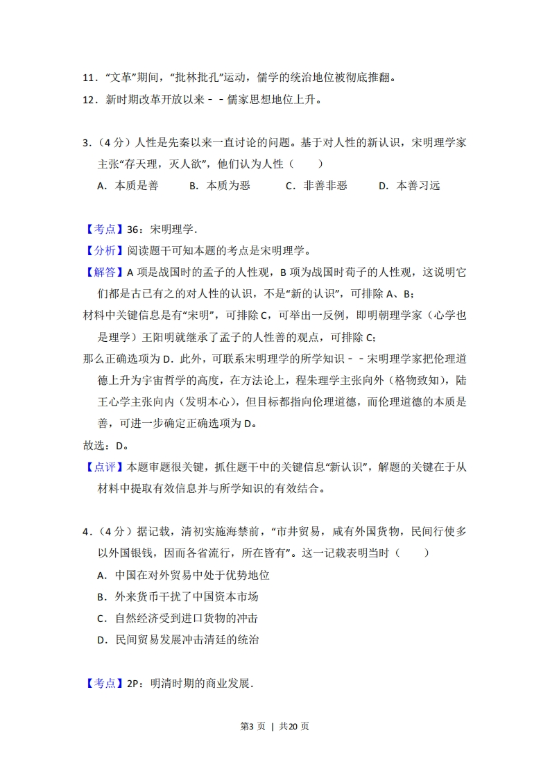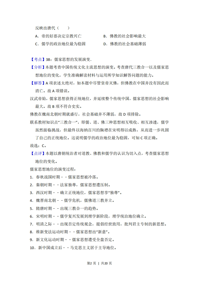 2014年全国统一高考历史试卷(新课标I)事考答来与试想解析一、选择题(共12小题,每小题4分,满分48分)1.(4分)中国古代,“天”"被尊为最高神。秦汉以后,以“天子”自居的皇帝举行祭天大典,表明自己“承天”而“子民”,官员、百姓则祭拜自己的祖先。这反映了秦汉以后()A.君主专制缘于宗教权威B.政治统治借助于人伦秩序C.皇权至上促成祖先崇拜D.祭天活动强化了宗法制度【考点】34:董仲舒的思想主张,【分析】根据题干中的信息“皇帝举行祭天大典,表明自己‘承天'而子民”,可知考查的知识点是董仲舒的思想主张。【解答】A、君主专制从思想上看始于战国韩非子,从制度上看始于秦朝,而当时的中国没有真正意义上的宗教,更谈不上宗教权威,A不正确:C、项错误,祖先崇拜在原始社会就有,与皇权至上不够形成因果关系,C不正确:D、项需联系西周的宗法制度去判断,宗法制度的核心是嫡长子继承制,宗法制在西周以后的整个中国长期存在,从秦朝到清朝,宗法制度突出表现在皇位的继承上仍是主要沿用嫡长子世袭,故与题干不相符,排除:通过排除法,可知正确项为B.此外,还可借助唯物史观的分析方法--统治者的文化行为实质是为维护其政治统治服务的,进一步确定正确选项为B。故选:B。【点评】本题考查了是董仲舒的思想主张,解题时注意抓住关键信息结合所学知识进行分析。2.(4分)唐高祖李渊自认为是老子后裔,规定老子地位在孔子之上,佛教位居第三:武则天时明令佛教位在道教之上:后来唐武宗又大规模地“灭佛”。这第1页|共20页