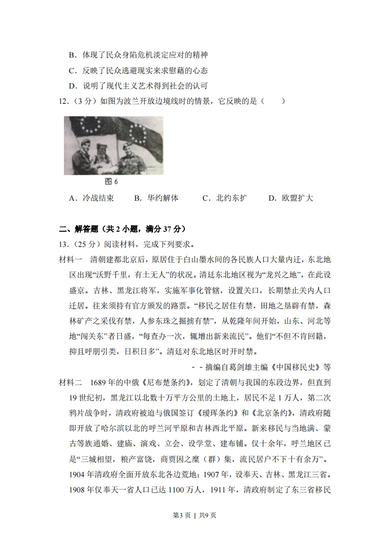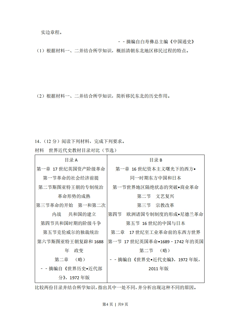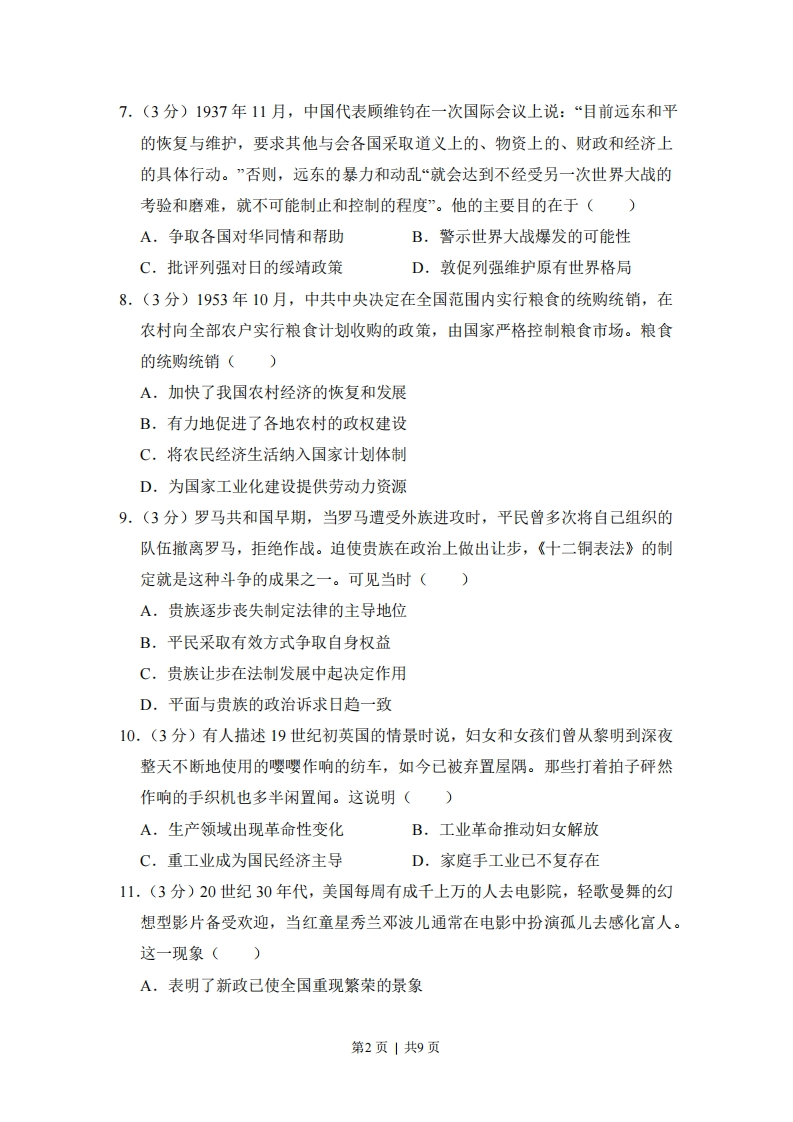2014年全国统一高考历史试卷(新课标I)一、选择题(共12小题,每小题3分,满分36分)1.(3分)周代分封制下,各封国贵族按“周礼”行事,学说统一的“雅言”,促进了各地文化的整合。周代的“雅言”最早应起源于现在的()A.河南B.河北C.陕西D.山东2.(3分)秦朝法律规定,私拿养子财物以偷盗罪论处,私拿亲子财物无罪:西晋时规定,私拿养子财物同样无罪。这一变化表明,西晋时()A.养子亲子权利相同B.血缘亲情逐渐淡化C.宗族利益受到保护D.儒家伦理得到强化3,(3分)北宋中期,“蜀民以铁钱重,私为券,谓之交子,以便贸易,富民十六户主之。其后,富者资稍衰,不能偿所负,争讼数起”。这表明交子()A,具有民间交易凭证功能B.产生于民间的商业纠纷C.提高了富商的社会地位D.促进了经济重心的南移4.(3分)明初废丞相、设顾问性质的内阁大学士,严防权臣乱政。明中后期严嵩、张居正等内阁首辅操纵朝政,权倾一时。这表明()A.皇权渐趋衰落B.君主集权加强C.内阁取代六部D.首辅权力失控5.(3分)1892年,维新思想家宋恕提出“欲更官制、设议院、改试令,必自易西服始”。康有为在奏议中也不止一次提及“易服”。维新派如此重视易服的主要原因是()A,改制中易服更易推行B.意在营造改制的社会氛围C.中国需改变对外形象D.长袍马褂代表了守旧势力6.(3分)1926年,有报纸评论说:“自从蒋介石抬出三民主义,大出风头以后,许多人都觉得主义是值钱的,于是乎孙传芳标榜三爱(爱国、爱民、爱敌),东三省有人主张三权(民权、国权、人权).听说四川有些军人到处请教人替他们想个主义玩玩。”这种现象反映了当时()A,政治宣传促使各界思想趋同B.标榜主义成为军阀自保的主要手段C.民主思想已经成为社会潮流D.各地军阀对三民主义理解存在差异第1页|共9页