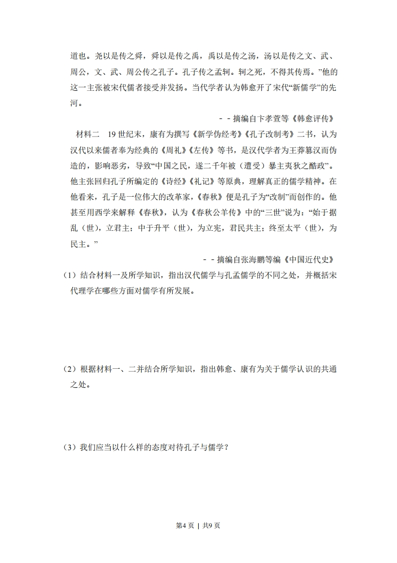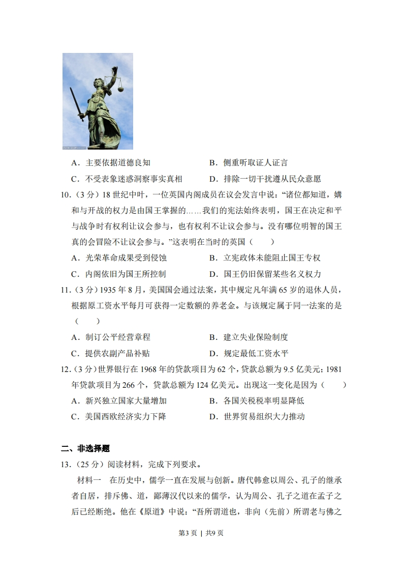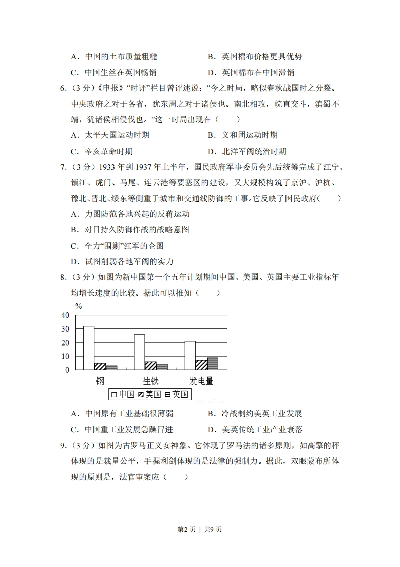 2015年全国统一高考历史试卷(新课标I)一、选择题1.(3分)《吕氏春秋·上农》在描述农耕之利时不无夸张地说:一个农夫耕种肥沃的土地可以养活九口人,耕种一般的土地也能养活五口人。战国时期农业收益的增加()A.导致畜力与铁制农具的使用B.抑制了手工业和商业的发展C.促进了个体小农经济的形成D.阻碍了大土地所有制的成长2.(3分)两汉时期,皇帝的舅舅、外祖父按例封侯:若皇帝幼小,执政大臣也主要从他们之中选择。这被当时人视为“安宗庙,重社稷”的汉家之制”。汉代出现外戚干政的背景是()A.皇帝依靠外戚抑制相权B.“家天下”观念根深蒂固C.母族亲属关系受到重视D.刘氏同姓诸侯王势力强大3,(3分)宋代东南沿海地区出现了一些民间崇拜,如后来被视为海上保护神的妈祖、被视为妇幼保护神的临水夫人等,这些崇拜得到朝廷认可,后世影响不断扩大。这反映出()A.朝廷不断鼓励海洋开发B.女性地位逐渐得到提高C.东南沿海经济社会影响力上升D.统治思想与民众观念趋向一致4.(3分)下表呈现的变化反映了(河南、江苏两地科举考试状元人数表唐宋明清河南151621江苏781749A.理学的影响力不断扩大B.经济发展促进文化兴盛C.中原地区经济急剧衰退D.政治重心南移趋势明显5.(3分)1852年,一位在华英国人在报告中称,英国商人运往伦敦的中国生丝是以“无用的”曼彻斯特上等棉布包装的。而在此之前,用于包装的主要是中国产的土布。包装布的这种变化反映了当时()第1页|共9页