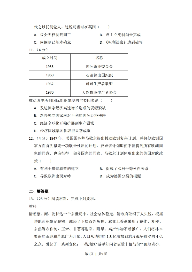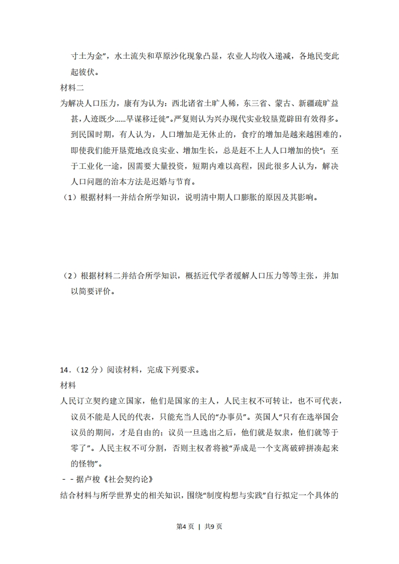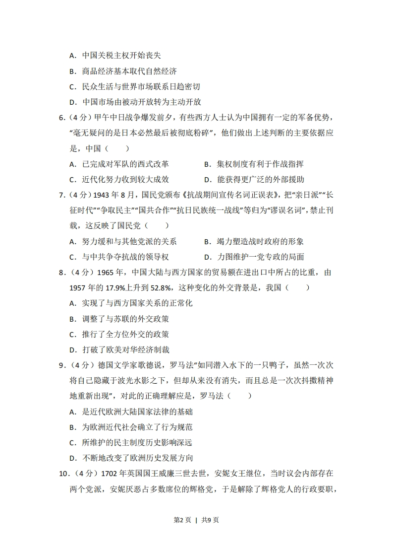 2016年全国统一高考历史试卷(新课标I)一、选择题(共12小题,每小题4分,满分48分)1.(4分)孔子是儒家学派的创始人,汉代崇尚儒学,尊《尚书》等五部书为经典,记录孔子言论的《论语》却不在“五经”之中,对此合理的解释是()A.“五经”为阐发孔子儒学思想而作B.汉代儒学背离了孔子的儒学思想C.儒学思想植根于久远的历史传统D.儒学传统由于秦始皇焚书而断绝2.(4分)如图为汉代画像砖中的农事图。此图可以用来说明当时()A.大地主田庄上的生产情形B.精耕细作农业的不断发展C.土地公有制下的集体劳作D.个体农户的生产劳作状态3,(4分)史载,宋太祖某日闷闷不乐,有人问他原因,他说:“尔谓帝王可容易行事耶.偶有误失,史官必书之,我所以不乐也。”此事反映了()A.重史传统影响君主个人行为B.宋代史官所撰史书全都真实可信C.史官与君主间存在尖锐矛盾D.宋太祖不愿史书记录其真实言行4.(4分)明初废行省,地方分设三司,分别掌管一地民政与财政、司法、军事,直属六部。明中叶以后,皇帝临时派遣的巡抚逐渐演变为三司之上的地方最高行政长官。这一变化有助于()A.扩大地方行政权力B.提高地方行政效率C.削弱六部的权限D.缓解中央与地方的对立5.(4分)19世纪中期以后,中国市场上的洋货日益增多,火柴、洋布等用品“虽穷乡僻壤,求之于市,必有所供”。这种状况表明()第1页1共9页