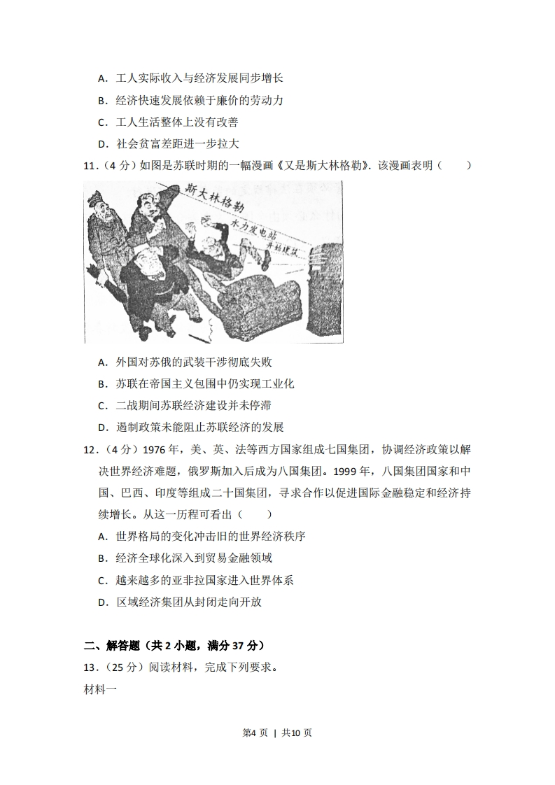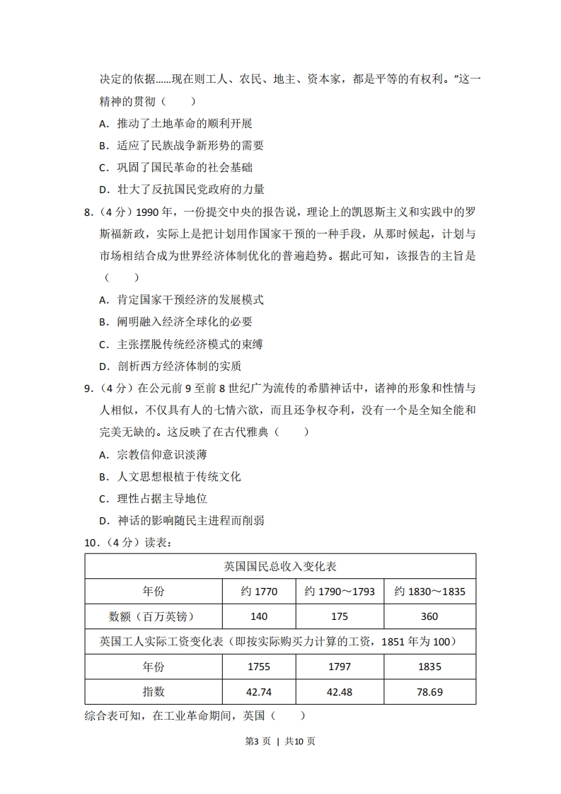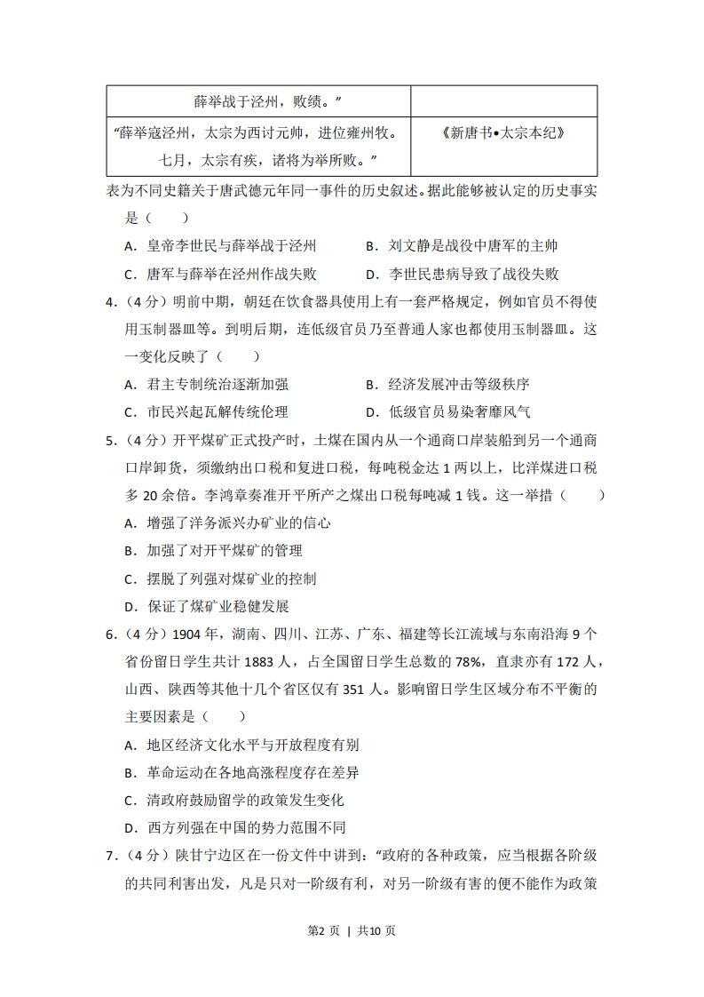 2017年全国统一高考历史试卷(新课标I)一、选择题:本题共12小题,每小题4分.在每小题给出第四个选项中,只有一项是符合题目要求的。1.(4分)周灭商之后,推行分封制,如封武王弟康叔于卫,都朝歌(今河南淇县):封周公长子伯禽于鲁,都奄(今山东曲阜):封召公奭于燕,都蓟(今北京).分封()A.推动了文化的交流与文化认同B.强化了君主专制权力C,实现了王室对地方的直接控制D.确立了贵族世袭特权2.(4分)读表:皇帝纪年公元纪年郡级政区汉高帝十二年前195年15郡汉文帝十六年前164年24郡汉景帝中六年前144年68郡、国汉武帝元封五年前106年108郡、国表为西汉朝廷直接管辖的郡级政区变化表。据此可知()A.诸侯王国与朝廷矛盾渐趋激化B.中央行政体制进行了调整C.朝廷解决边患的条件更加成熟D.王国控制的区域日益扩大3.(4分)读表:记述出处“秦王(李世民)与薛举大战于泾州,我师败《旧唐书·高祖本纪》绩。”“薛举寇泾州,太宗(李世民)率众讨之,不利《旧唐书•太宗本纪》而旋。”“秦王世民为西讨元帅…刘文静(唐朝将领)及《新唐书·高祖本纪》第1页|共10页