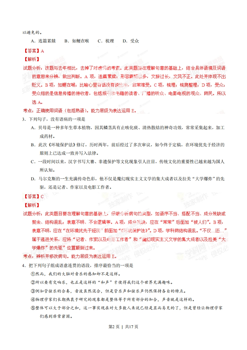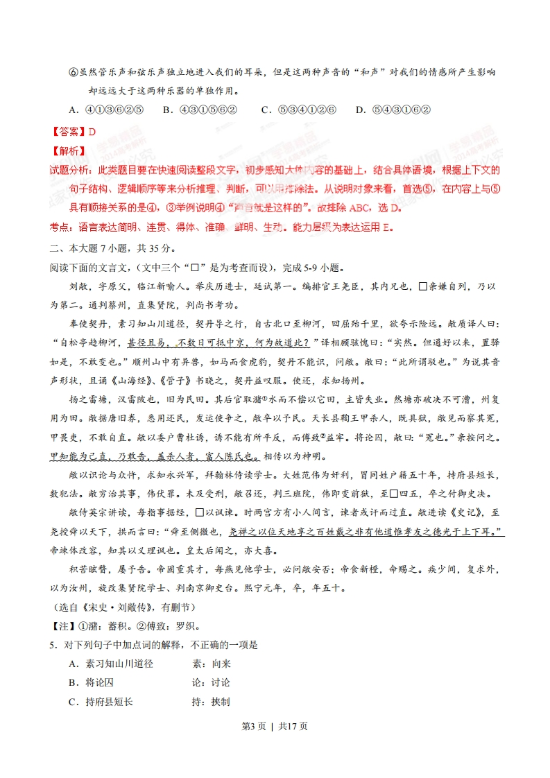 绝密★启用前试卷类型:B2014年普通高等学校招生全国统一考试(广东卷)语文本试卷共8页,24小题,满分150分。考试用时150分钟。注意事项:1.答卷前,考生务必用黑色字迹的钢笔或签字笔将自己姓名和考生号、考场号、座位号填写在答题卡上。用2B铅笔将试卷类型(B)填涂在答题卡相应位置上。将条形码横贴在答题卡右上角“条形码粘贴处。”2.选择题每小题选出答案后,用2B铅笔把答题卡上对应题目的答案信息号涂黑,如需改动,用橡皮擦干净后,再选涂其它答案,答案不能答在试卷上。3.非选择题必须用黑色字迹的钢笔或签字笔作答,答案必须写在答题卡各题目指定区域内相应位置上:如需改动,先划掉原来的答案,然后再写上新的答案:不准使用铅笔和涂改液。不按以上要求作答的答案无效。4.作答选做题时,请先用2B铅笔填涂选做题的题号对应的信息点,再作答。漏涂、错涂、多涂的,答案无效。5.考生必须保持答题卡的整洁。考试结束后,将试卷和答题卡一并交回。一、本大题4小题,每小题3分,共12分。1.下列词语中加点的字,每对读音都不相同的一组是A.驰骋/聘请饶恕/夙愿塞翁失马/敷衍塞责B.瑕疵/遐想遏止/摇曳是否/威否C.诽谤/磅礴洗涤/嫡亲累积劳累D.渗透/掺杂俯仰/辅导屡见不鲜/鲜为人知【答案】A【解析】试题分析:此题分别考查对形近音同(或音异)、形异音同(或音异)、多音多义的汉字读音的辨识能力。该题型近几年稳中求进,引入成语的考查,对考生而西:在心理上不会有太大的影响,有利于考生渐渐进入答题正常状态,体现了出题人的人文关怀分析时,可用排除法。B项,“瑕遐”均读x,故排除B。C项,“涤嫡”均读di,故排除C。D项,“俯辅”均读ǔ,故排除D。所以选A。考点:识记现代汉语普通话常用字的字音。能力层级为识记A2.下面语段中画线的词语,使用不恰当的一项是与连篇累牍的电视剧本身相比,剧中翻书的动作、人物的坐姿等,只是一些细节。然而,令专家如鲠在喉、遭观众调侃的,正是其中与历史常识相冲突的文化“倒刺”。梳理这些细节,无论是将死后蓝号、庙号当作生前名号,还是“早产”的线装书、字画、历史事件等,其中的知识性错误都不难发现。只要多一些检查环节,多一些细节上的较真,在文化产品正式推向受众之前做好知识核查,诸多类似笑话或许是可第1页|共17页以避免的。A.连篇累牍B.如鲠在喉C.梳理D.受众【答案】A【解析】试题分析:该题与去年相比,去掉了对虚词的考查。此类题要在理解句意的基础上,结合具体语境及词语的意思来分辨,做出判断。A项,连篇累牍:形容篇幅过多,文辞过长,文风不正。此处并体现不出贬义。B项,如鲠在喉:比喻心里有话没有说出来,非常难受。C项,梳理:梳爬整理,D项,受众:受众指的是信息传播的接收者,包括报和书籍的读者、播的听众、电景电视的观众、网民。所以选A考点:正确使用词语(包括熟语)。能力层级为表达运用E。3.下列句子,没有语病的一项是A.贝母是一种多年生草本植物,因其鳞茎具有止咳化痰、清热散结的神奇功效,常常采集起来,加工成药材。B.此次《环境保护法》修订,历时两年,前后经过了多次审议,如今终于定稿,在环境优先于经济的原则上己达成一致并写入法律。C.一段时间以来,汉字书写大赛、非遗保护等文化现象引人注目,传统文化的重要性己越来越为国人所认知。D.马尔克斯的一生充满传奇色彩,他不仅是魔幻现实主义文学的集大成者以及拉美“大学爆炸”的先驱,还是记者、作家以及电影工作者。【答案】C【解析】试题分析:此类题目要在理解句意的基础上,仔细分析病句的类型,如语序不当、搭配不当、成分残缺或赘余、结构混乱:表意不明、不合逻辑等。A项,成分残决,应在“常常”后面加“被人们”。B项,表意不明,应在“在环境优先于经济”前面加“环保护法》”。D项,学科网结构混乱。“不仅.还”属于递进关系,应将“记者、作家以及电影工作者”和“幻现实主义文学的集大成者以及拉美“大学爆炸”的先驱”位置颠倒过来。考点:辨析并修改病句。能力层级为表达运用E。4.把下列句子组成语意连贯的语段,排序最恰当的一项是①然而,我们的大脑对音乐的感知却不是这样。②所以要有交响乐,也正是这样的“和声”才使得我们这个世界充满趣味。③例如管弦乐的合奏,音波虽然混合,但是管乐声和弦乐声仍然保持各自的特点。④物理学家们长期热衷于研究的现象都是整体等于所有部分的加合,声音就是这样的。⑤整体可以大于部分之和,这一事实现在对大多数人来说已经是显而易见的了,但是曾经让物理学家们感到非常窘困。第2页|共17页⑥虽然管乐声和弦乐声独立地进入我们的耳朵,但是这两种声音的“和声”对我们的情感所产生影响却远远大于这两种乐器的单独作用。A.④①③⑥②⑤B.④③①⑤⑥②C.⑤③④①②⑥D.⑤④③①⑥②【答案】D【解析】试题分析:此类题目要在快速阅读整段文字,初步感知大价内容的基础上,结合具体语境,根据上下文的句子结构、逻辑顺序等来分析推理、判断,可以用除法。从说明对象来看,首选⑤,在内容上与⑤具有顺接关系的是④,③举例说明④“有音就是这样的”。议排除ABC,选D。考点:语言表达简明、连贯、得体、准确、鲜明、生动。能力层级为表达运用E。二、本大题7小题,共35分。阅读下面的文言文,(文中三个“口”是为考