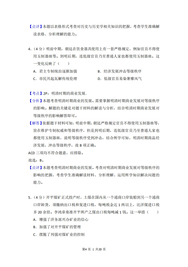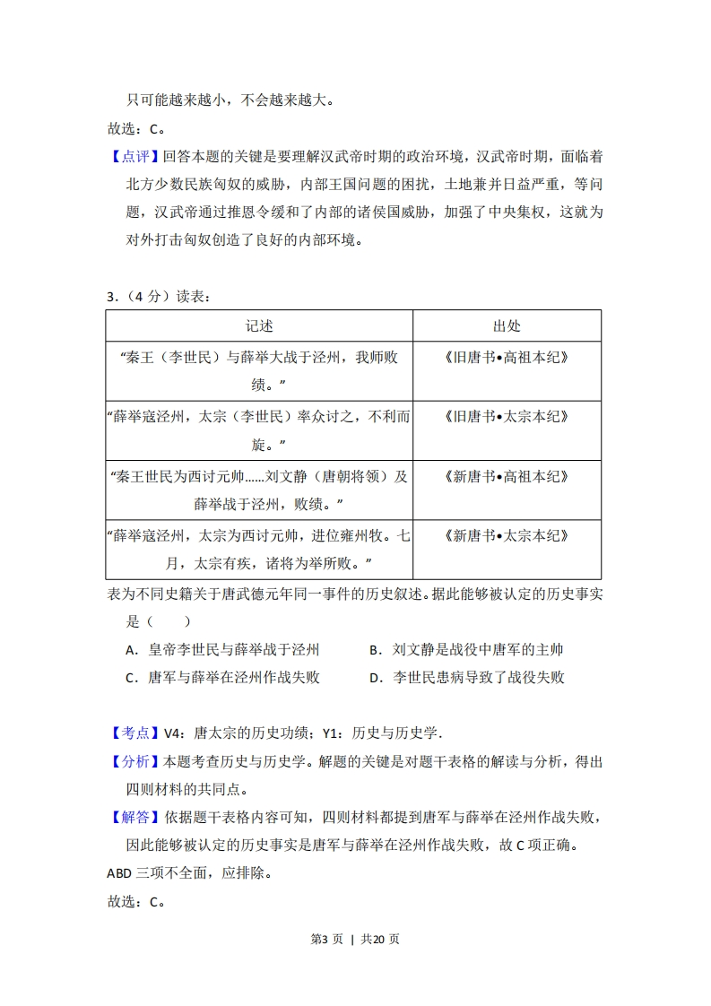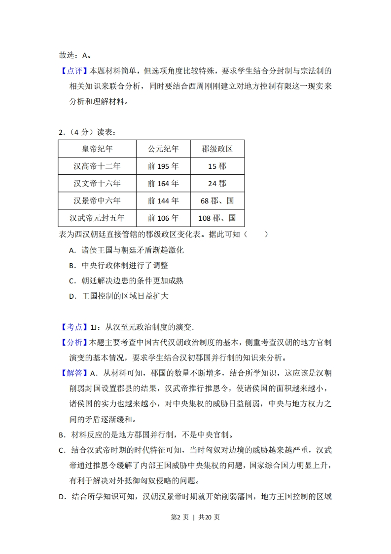 2017年全国统一高考历史试卷(新课标I)事考答来与试想解析一、选择题:本题共12小题,每小题4分.在每小题给出第四个选项中,只有一项是符合题目要求的.1.(4分)周灭商之后,推行分封制,如封武王弟康叔于卫,都朝歌(今河南淇县):封周公长子伯禽于鲁,都奄(今山东曲阜):封召公奭于燕,都蓟(今北京).分封()A.推动了文化的交流与文化认同B.强化了君主专制权力C.实现了王室对地方的直接控制D.确立了贵族世袭特权【考点】12:西周的分封制.【分析】本题主要考查西周分封制的内容和影响,要求学生从材料中受封对象与周王之间的关系来分析。【解答】A.题目的引导语是“分封”,而不是“材料反映了、说明了、体现了”由此可知,这个题目中的材料只是引出考察的对象分封,及其的作用,结合分封制的内容,我们可知,分封制加强了西周王朝对地方的控制,形成了众星捧月的政治格局,也强化了周边地区对西周的文化认同,促进了各地区的文化交流。B.分封制主要是地方官制,不可能加强君主专制的权力,另外,西周时期,没有形成专制主义中央集权制度,君主专制权力在当时不是非常突出,西周主要强调以德治国。C.结合所学知识,我们知道分封制地方诸侯国有很强的独立性,西周王朝就是不能够直接操控地方,所以实行分封,选项表述是错误的。D.分封制的实施,确实是体现了世袭的贵族特权,但不能说明,贵族的世袭特权是由分封制确立的,在西周之前,世袭贵族就拥有特权。第1页|共20页