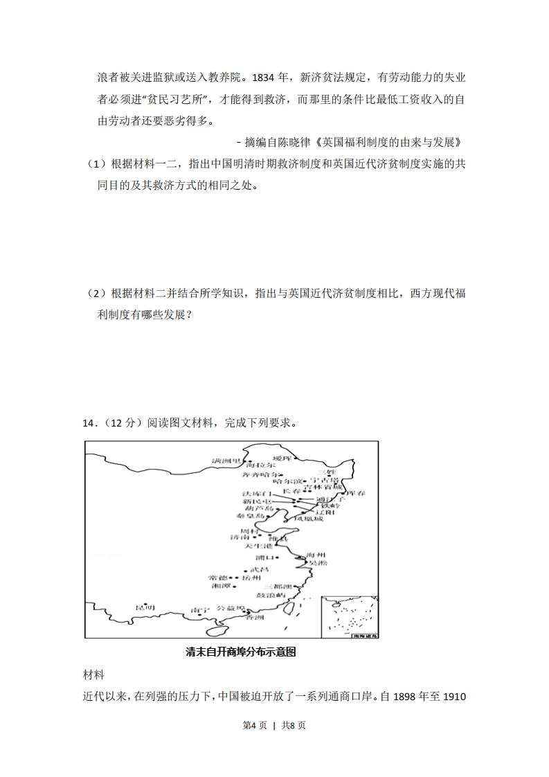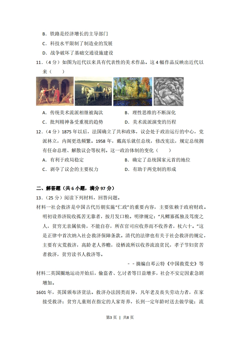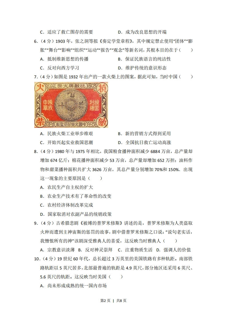 2016年全国统一高考历史试卷(新课标Ⅲ)一、选择题(共12小题,每小题4分,满分48分)1.(4分)周代青铜器上的铭文与商代相比,字数越来越多,语句也愈加格式化。这些铭文大都记述个人业绩,追颂祖先功德,希冀子孙保用。这表明西周时()A.创造了一种全新的文字体系B.形成了重视历史传承的风尚C.宗法制度受到了严重的挑战D.青铜器的功用发生重大改变2.(4分)东汉王充在《论衡》中说:“萧何入秦,收拾文书(国家档案文献),汉所以能制九州者,文书之力也。”其意在说明,西汉成功地实现对全国的统治,是因为汉初()A.实行了崇尚儒家的政策B.继承了秦朝的基本制度C.未能充分发挥文书功能D.官吏熟知秦朝典章制度3,(4分)唐太宗对南朝后期竞相模仿萧子云书法的风气表示不屑,认为其“仅得成书,无丈夫之气”,只有王羲之的书法才“尽善尽美”,于是连西州(今吐鲁番)幼童习字的范本都是王羲之书帖。王羲之在中国书法史地位的确立,是因为()A.皇帝好恶决定社会对艺术的评判B.王羲之的艺术成就不可超越C.艺术水平与时代选择的共同作用D.朝代更替影响艺术评判标准4.(4分)明末有人描述江南农村的变化时说,百年前的雇工“戴星出入,俗柔顺而主令尊”,如今“骄惰成风,非酒食不能劝”“夏必加下点心,冬必与早粥”。这一变化反映了()A.农业中人身依附关系强化B.政府积极推行重农政策C.市镇经济与手工业的发展D.奢靡风气瓦解传统伦理5.(4分)甲午战后,梁启超提出“诗界革命”,曾赋诗“泱泱哉我中华物产腴沃甲大地,天府雄国言非夸。君不见英日区区三岛尚崛起,况乃堂矞吾中华!”这反映出“诗界革命”()A.倡导民主革命的思想B.推动了白话文运动第1页1共8页