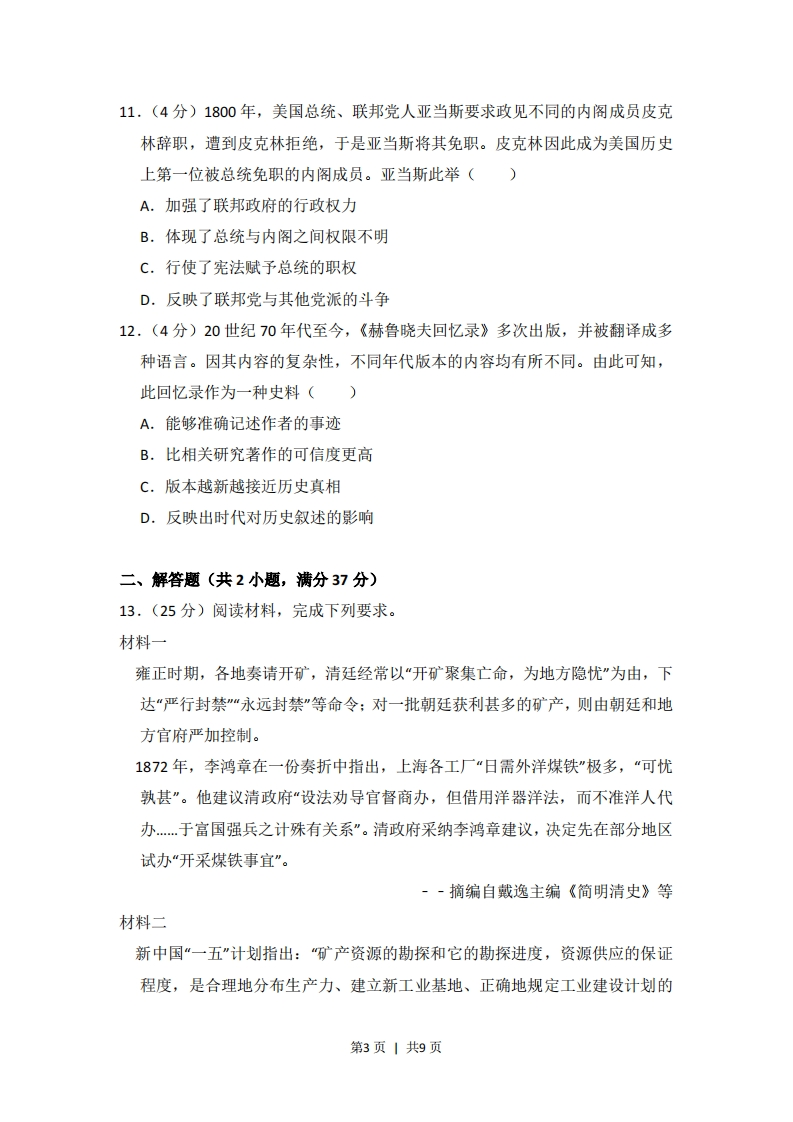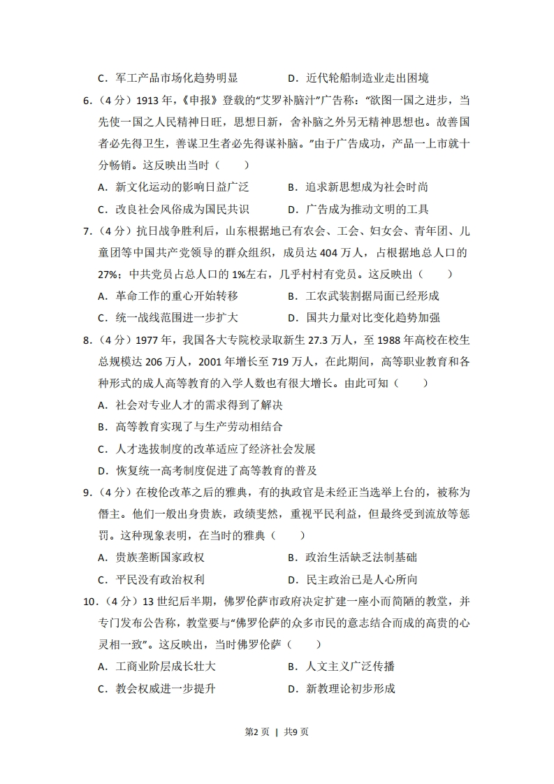 2017年全国统一高考历史试卷(新课标Ⅱ)一、选择题(共12小题,每小题4分,满分48分)1.(4分)如图为春秋战国之际局部示意图。当时,范蠡在陶、子贡在曹鲁之间经商成为巨富,这一现象反映了()国家湖泊山A.区域位置影响商贸发展B.争霸战争促进经济交往C.交通条件决定地方经济状况D.城市规模扩大推动商业繁荣2.(4分)《史记》《汉书》均为私家撰著。魏晋以后,朝廷任用史官负责修撰本朝或前朝历史,甚至由宰相主持,皇帝亲自参与,这反映出官修史书()A.记载的真实性B.评价历史的公正性C.修撰的政治性D.解释历史的客观性3.(4分)北朝时,嗜好奶类制品的北方人常常嘲笑南方人的喝茶习俗。唐中期,北方城市中,“多开店铺,煎茶卖之,不问道俗,投钱取饮。其茶自江、淮而来,舟车相继,所在山积”。据此可知,唐中期()A.国家统一使南茶开始北运B.南北方饮食习惯趋于一致C.南方经济文化影响力上升D.南方经济水平已超越北方4.(4分)明初朱元璋严禁宦官读书识字,但中后期宦官读书识字逐渐制度化,士大夫甚至有针对性的编纂适合宦官学习的读本。由此可以推知,明代中后期()A.中枢决策过程发生异变B.皇帝权力日趋衰落C.内阁议政功能已经丧失D.宦官掌握决策权力5,(4分)1879年以前,福州船政局所造之船均“派拨各省,并不索取原价分文”;此后造船所用材料费由用船一方拨付,采取“协造”方式生产。这种变化反映了()A.军用工业由官办转为商办B.“协造”意在缓解经费压力第1页1共9页
