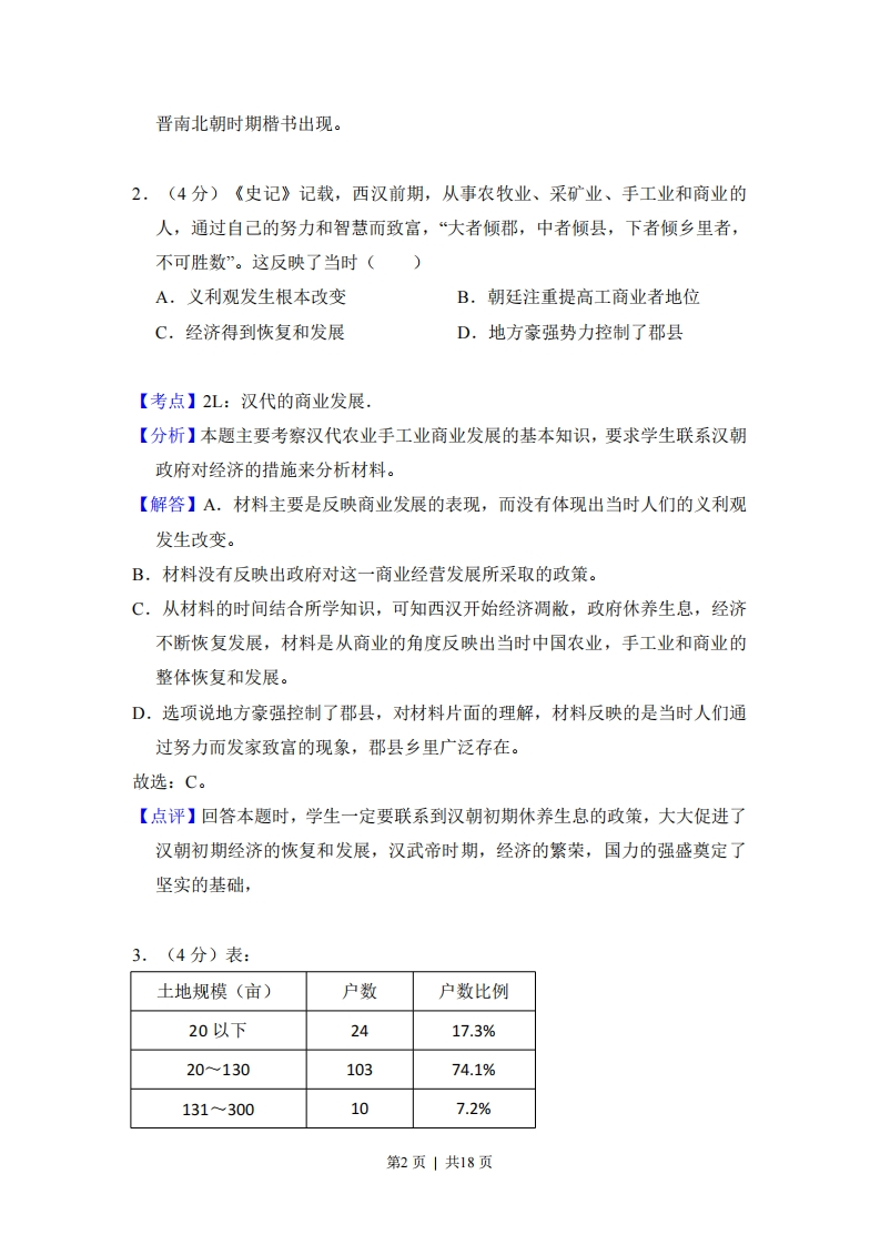 2017年全国统一高考历史试卷(新课标Ⅱ)事考答来与试想解析一、选择题:本题共12小题,每小题4分,满分48分.在年小题给出的四个选项中,只有一项是符合题目要求的.1,(4分)如图是西周与战国两个时期相同文字的不同写法,反映出字形发生了变化,促成这一变化的主要因素是(鞋一車A.文字的频繁使用B.书写材料的不同C,各国变法的实施D.“书同文”的推行【考点】3I:汉字的形成演变,【分析】本题主要考查中国古代汉字的发展历程,那就学生结合西周到战国时期的中国社会现实来分析。【解答】A.中国古代汉字发展的总体趋势是由繁到简,之所以出现这样的变化是由于中国的现实,西周到战国时期社会政治经济市场化不断的发展,文字在社会发展中的表述功能越来越强,被频繁地使用,所以必须由繁到简便于书写。B.从西周到战国时期,我国出现了简牍,都是写在竹和木片上,而且都用笔和墨。C.各国变法从春秋时期开始,但是各国变法中并没有涉及到文字的。D.书同文是秦始皇推行的措施,和材料时代不符。故选:A。【点评】学生在回答问题时应该知道中国古代汉字发展的基本过程,原始社会最早出现的是图画文字,后来发展出象形文字,商朝时期出现成熟的文字,甲骨文,西周时期出现篆书,秦朝统一以后推行小篆,汉朝普遍采用隶书,魏第1页|共18页