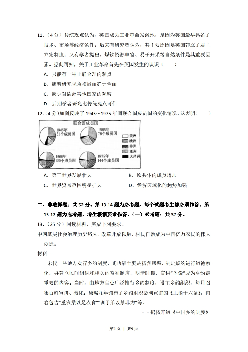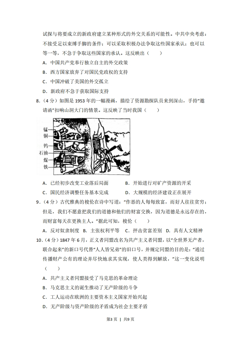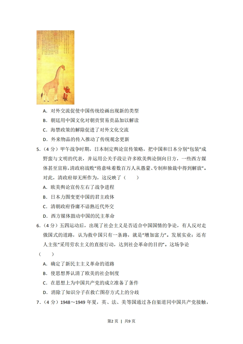2018年全国统一高考历史试卷(新课标I)一、选择题:本题共12小题,每小题4分,共48分。在每小题给出的四个选项中,只有一项是符合题目要求的。1.(4分)《墨子》中有关于“圆"“直线”“正方形"“倍”的定义,对杠杆原理、声音传播、小孔成像等也有论述,还有机械制造方面的记载。这反映出,《墨子》()A.汇集了诸子百家的思想精华B.形成了完整的科学体系C.包含了劳动人民智慧的结晶D.体现了贵族阶层的旨趣2.(4分)据学者研究,唐朝“安史之乱”后百余年间的藩镇基本情况如表所示。表“安史之乱”后百余年间唐朝藩镇基本情况表藩镇类型数量(个)官员任免赋税供纳兵额与功能河朔型7藩镇自擅不上供拥重兵以自立中原型8朝廷任命少上供驻重兵防骄藩边疆型17朝廷任命少上供驻重兵守边疆东南型9朝廷任命上供驻兵少防盗贼由此可知,这一时期的藩镇(A.控制了朝廷财政收入B.彼此之间攻伐不已C.注重维护中央的权威D.延续了唐朝的统治3.(4分)北宋前中期,在今四川井研县一带山谷中,密布着成百上千个采用新制盐技术的竹筒井。井主所雇工匠大多来自“他州别县”,以“佣身赁力”为生,受雇期间,若工作条件或待遇不满意,辄另谋高就。这反映出当时()A.民营手工业得到发展B.手工业者社会地位高C.雇佣劳动已经普及D.盐业专卖制度解体4.(4分)如图中的动物是郑和下西洋时外国使臣随船向明政府贡献的奇珍异兽。明朝君臣认为,这就是中国传说中的“麒麟”,明成祖遂厚赐外国使臣。这表明当时()第1页1共9页