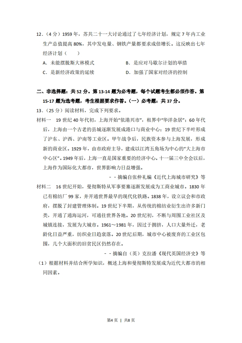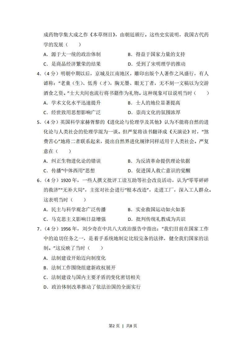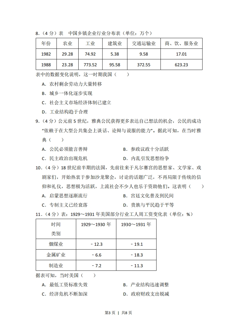 2018年全国统一高考历史试卷(新课标Ⅲ)一、选择题(共12小题,每小题4分,满分48分)1.(4分)据考古报告,从数十处战国以前的墓葬中发现了铁器实物,这些铁器不少是自然陨铁制作而成,发现地分布情况见图。据此可知,战国以前()▲发现地A.铁制农具得到普遍使用B.新疆地区与中原联系紧密C.我国的治铁技术已经相当普及D.铁器分布可反映社会发展程度2.(4分)表宋代宰相祖辈任官情况表曾祖、祖父或父亲任官情况宰相人数北宋(71)南宋(62)高级官员208中级官员1510低级官员128无官职记录2436据学者研究整理而成,反映出两宋时期()A.世家大族影响巨大B.社会阶层流动加强C.宰相权力日益下降D.科举制度功能弱化3.(4分)我国第一部药学专书《神农本草经》大约成书于汉代,《唐本草》是世界上第一部由国家制定的药典,宋代颁行了多部官修本草,明代李时珍撰第1页1共8页