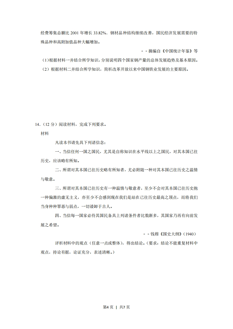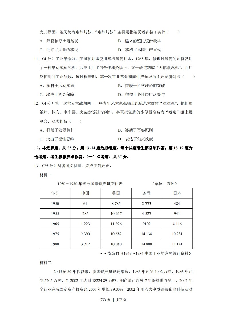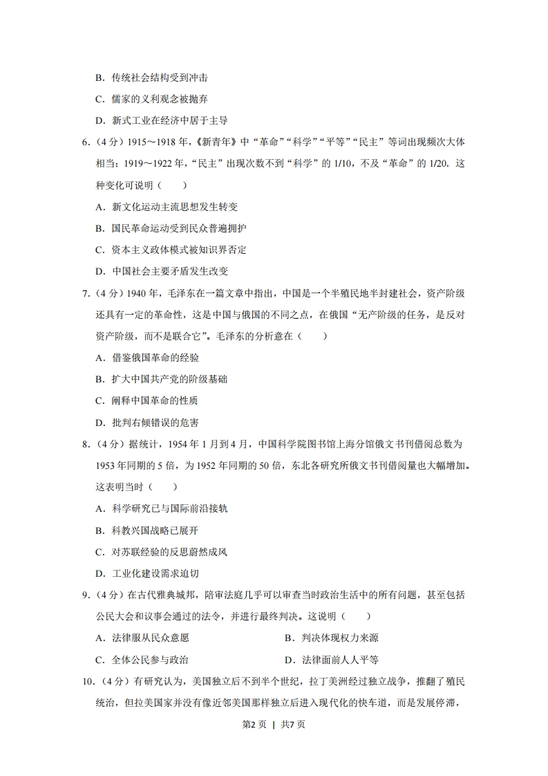 2019年全国统一高考历史试卷(新课标I)一、选释题:本题共12小题,每小题4分,共48分。在每小题给出的四个选项中,只有一项是符合题目要求的。1.(4分)据学者考订,商朝产生了17代30位王,多为兄终弟及:而西周产生了11代12位王。这反映出()A.禅让制度的长期影响B.王位继承方式的变化C.君主寿命的时代差异D.血缘纽带关系的弱化2.(4分)汉武帝时,朝廷制作出许多一尺见方的白鹿皮,称为“皮币”,定价为40万钱一张。诸侯王参加献礼时,必须购皮币用来置放礼物,而当时一个“千户侯”一年的租税收入约为20万钱。朝廷这种做法()A.加强了货币管理B.确立了思想上的统一C.削弱了诸侯实力D.实现了对地方的控制3.(4分)唐代之前,荆楚民间存在一种祈求丰收的“牵钩之戏”,至唐代称作“拔河”,广为流传。唐玄宗《观拔河俗戏》诗云:“壮徒恒贾勇,拔拒抵长河。欲练英雄志,须明胜负多…预期年岁稔,先此乐时和。”据此可知,在唐代()A.江南文化成为主流B.耕战结合观念深入人心C.阳刚与力量受到推崇D.诗歌以描写宫廷生活为主4.(4分)明中后期,大运河流经的东昌府是山东最重要的棉花产区,所产棉花多由江淮商人坐地收揽,沿运河运至江南,而后返销棉布。这一现象产生的主要因素是()A.交通方式的变革B.土地制度的调整C.货币制度的改变D.地区经济的差异5.(4分)表川沙县部分名人简历表黄彬国学生,干练有才,上海招商局创办时,章程皆其手订。朱纯祖监生,幼时孤苦伶仃,学习米业,中年创设朱丽记花米行。姚光第南邑生员,感于地方贫瘠日甚,就其家设机器轧棉厂。如表是19世纪末20世纪初毗邻上海的川沙县部分名人的简历,说明当时国内()A.科举取士转向选拔实务人才第1页1共7页