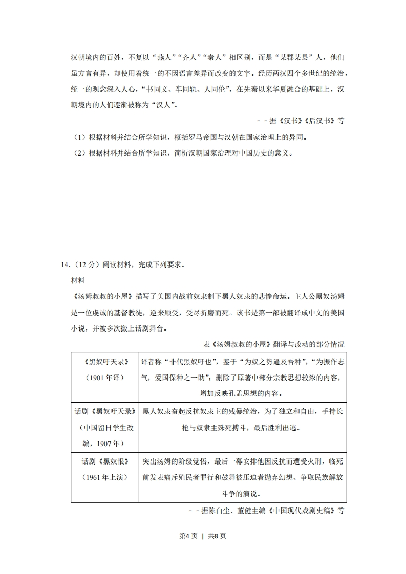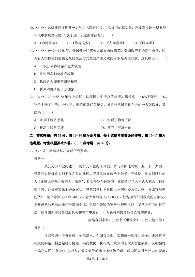 2019年全国统一高考历史试卷(新课标Ⅲ)一、选释题:本题共12小题,每小题4分,共48分。在每小题给出的四个选项中,只有一项是符合题目要求的。1.(4分)“教民亲爱,莫善于孝:教民礼顺,莫善于悌:移风易俗,莫善于乐:安上治民,莫善于礼。”这一思想产生的制度渊源是()A.宗法制B.禅让制C.郡县制D.察举制2.(4分)在今新疆和甘肃地区保存的佛教早期造像很多衣衫单薄,甚至裸身,面部表情生动:时代较晚的洛阳龙门石窟中,造像大都表情庄严,服饰亦趋整齐。引起这一变化的主要因素是()A.经济发展水平B.绘画技术进步C.政治权力干预D.儒家思想影响3.(4分)北宋实行募兵制,兵士待遇较为优厚,应募者以此养家糊口,兵员最多时达120多万人。这一制度()A,加重了政府财政负担B.提升了军队的战斗力C.弱化了对地方的控制D.加剧了社会贫富分化4.(4分)乾隆时江南地主“所居在城或他州异县,地亩山场皆委之佃户”。苏州甚至出现“土著安业者田不满百亩,余皆佃农也。上田半归于郡城之官户”。由此可知,当时江南()A.土地所有权变更极为频繁B.农业生产利润微不足道C.个体农耕为主要生产形式D.农业中商品化生产普遍5.(4分)19世纪六七十年代,外国人将自己的名字租借给中国人经办新式企业的做法,在通商口岸较为盛行。这一做法()A.导致民间设厂高潮局面的出现B.有利于中国新的社会阶层发展C.加剧了外国资本对中国的输入D.扭转了中国对外贸易入超局面6.(4分)1916年1月,陈独秀在《青年杂志》撰文称:“个人之人格高,斯国家之人格亦第1页1共8页