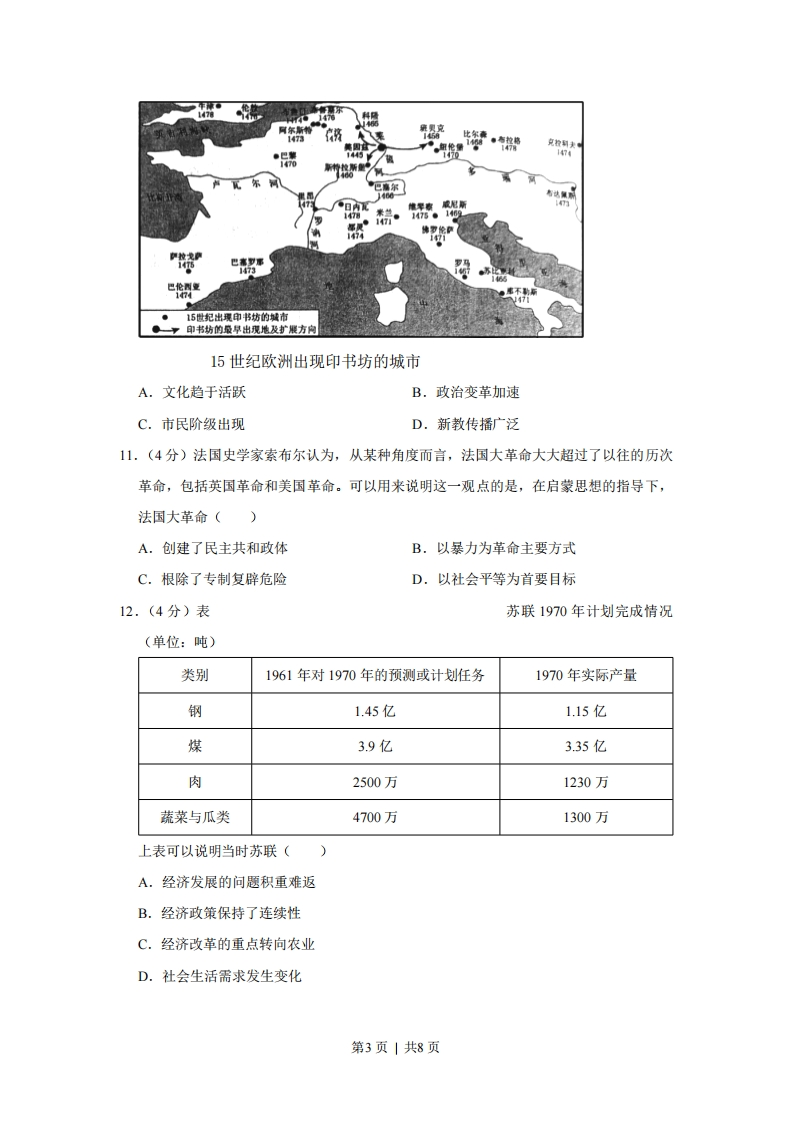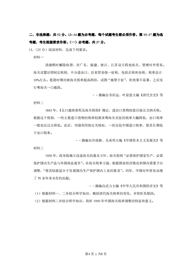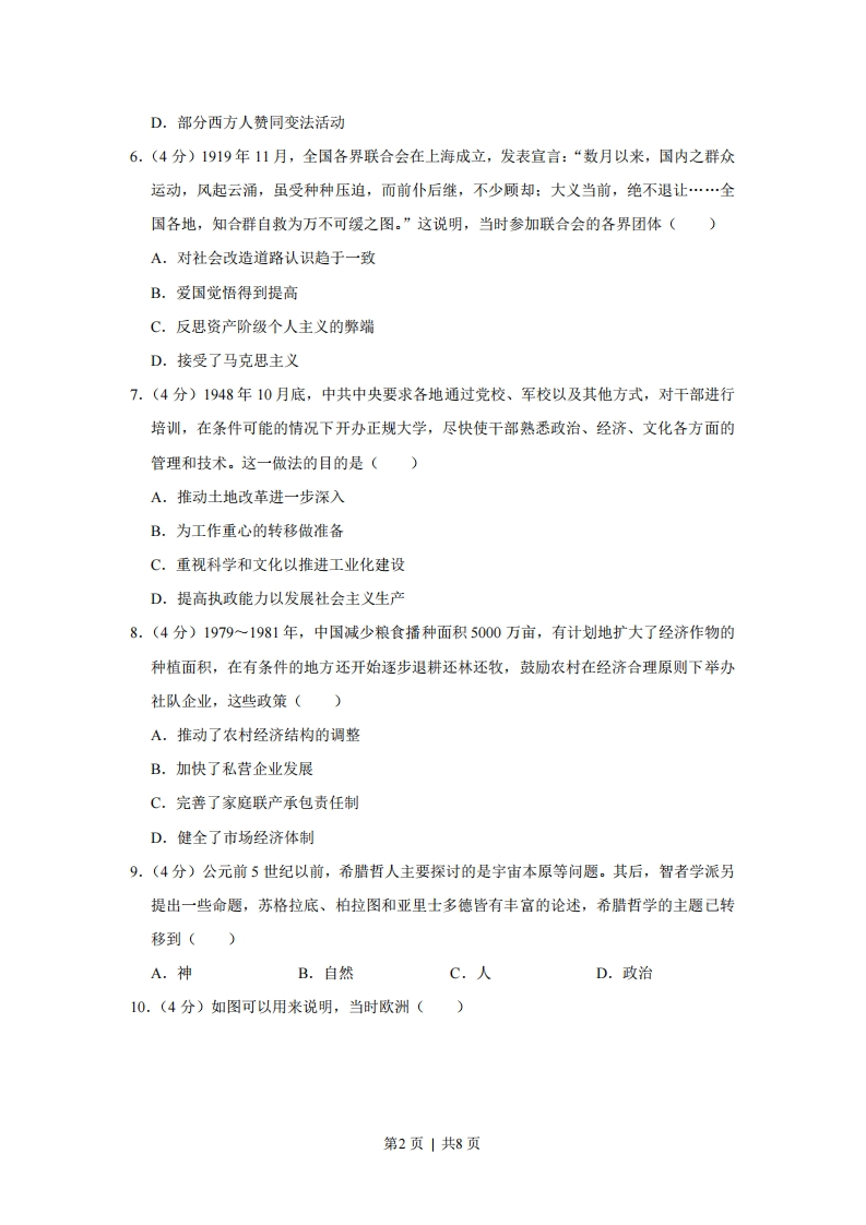 2019年全国统一高考历史试卷(新课标Ⅱ)一、选释题:本题共12小题,每小题4分,共48分。在每小题给出的四个选项中,只有一项是符合题目要求的。1.(4分)战国后期,秦国建造了一批大型水利工程,如郑国渠、都江堰等,一些至今仍在发挥作用。这些工程能够在秦国完成,主要是因为()A.公田制度逐渐完善B.铁制生产工具普及C.交通运输网络通畅D.国家组织能力强大2.(4分)西汉初期,道家学说兼采阴阳、儒、墨、名、法各家学说的精髓:后来董仲舒的儒家学说也吸收阴阳五行、法、道等各种思想。促成当时学术思想上呈现这种特征的主要因素是()A.王国势力强大B.百家争鸣局面的延续C.现实统治需要D.兼收并蓄的文化政策3.(4分)程颗诗云:“闲来无事不从容,睡觉东窗日己红。万物静观皆自得,四时佳兴与人同。道通天地有形外,思入风云变态中,富贵不淫贫贱乐,男儿到此是豪雄。”其体现的主旨是()A.人类与自然和谐共处B.人与万事万物皆同理C.张扬自我的人生态度D.无为而治的思想理念4.(4分)研究表明,明代大商人的资本一般为白银数十万两,多者上百万两。到清代中期,大商人的资本一般在一百万两以上,甚至多达千万两。这表明清代中期()A.商人的地位发生根本性改变B.重农抑商政策明显松弛C.商业活动的规模进一步扩大D.白银开始成为流通货币5.(4分)1898年,一份英文报纸报道:光绪皇帝己经遇害,“太后现在正维持着光绪名义上统治的滑稽剧,一到适当的时候,便公开宣布他的死讯”。这则报道可以用来说明当时()A.君主立宪受到社会的广泛支持B.清政府加强排外活动力度C.列强寻找干涉中国内政的借口第1页|共8页