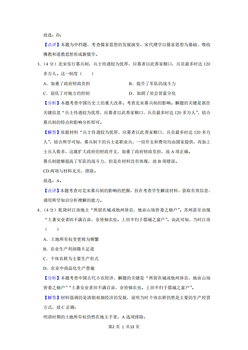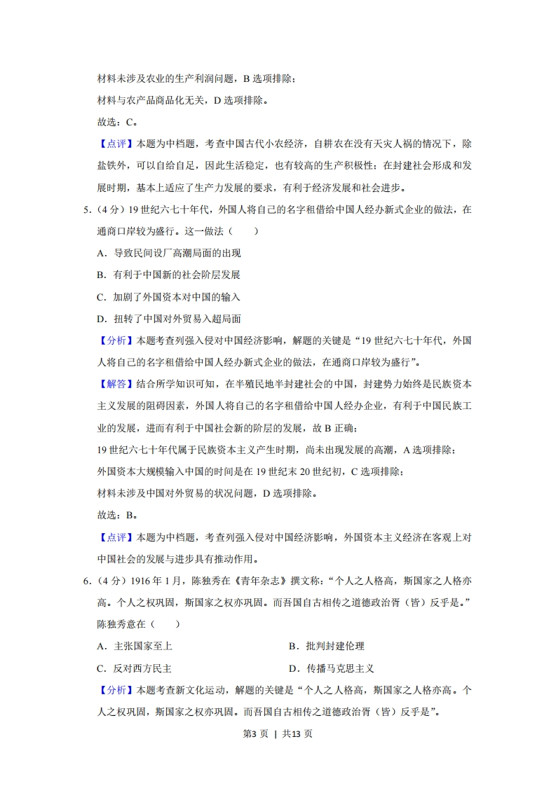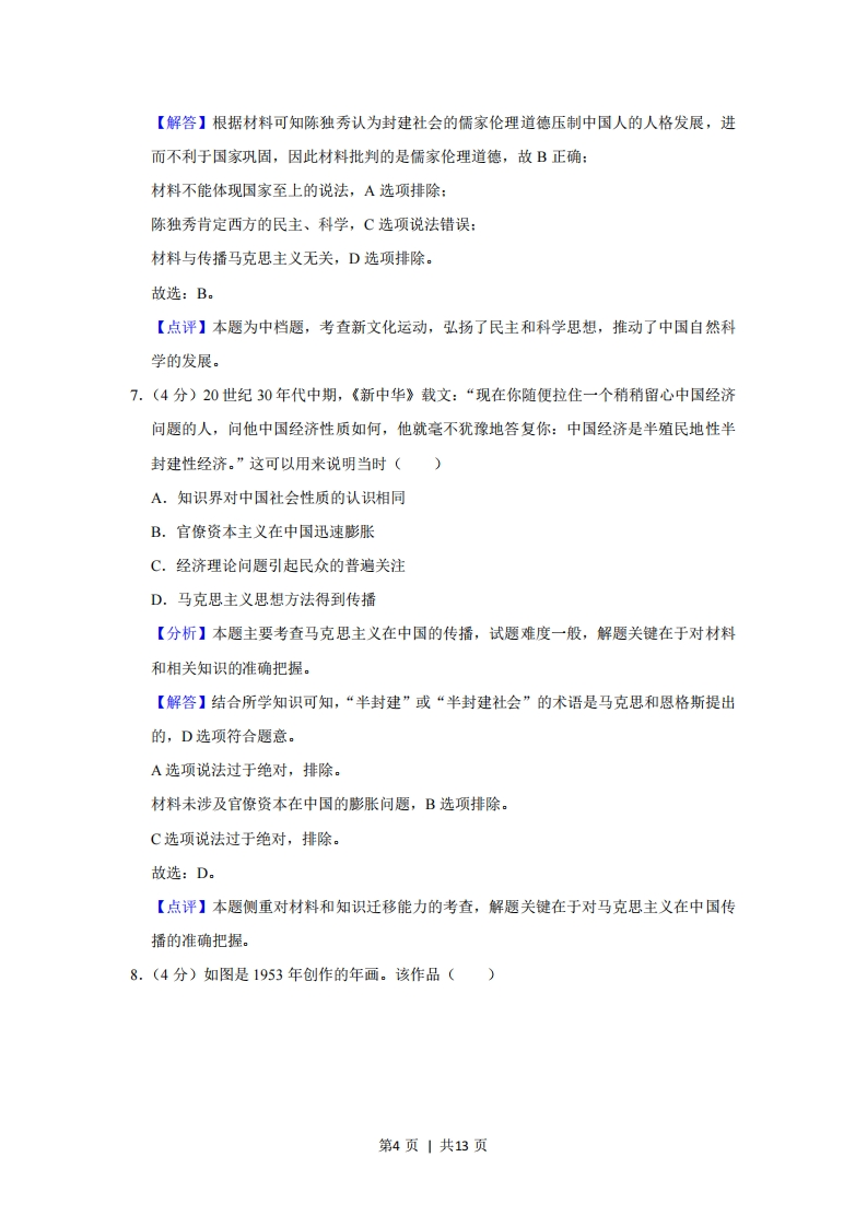 2019年全国统一高考历史试卷(新课标Ⅲ)◆考答案与试题解析一、选择题:本题共12小题,每小题4分,共48分。在每小题给出的四个选项中,只有一项是符合题目要求的。1.(4分)“教民亲爱,莫善于孝:教民礼顺,莫善于悌:移风易俗,莫善于乐:安上治民,莫善于礼。”这一思想产生的制度渊源是()A.宗法制B.禅让制C.郡县制D.察举制【分析】本题考查宗法制,解题的关键是“教民亲爱,莫善于孝:教民礼顺,莫善于悌”。【解答】“教民亲爱,莫善于孝:教民礼顺,莫善于悌”表明材料强调血缘关系,与宗法制有关,故A正确:BCD材料未体现,排除。故选:A。【点评】本题为中档题,考查宗法制,凝聚宗族,防止内部纷争,强化王权,形成“周天子-诸侯-卿大夫-士”的等级秩序,有利于统治阶级内部的稳定和团结:把“国”和“家”密切结合,保证王权的稳定,保证贵族的特权。2.(4分)在今新疆和甘肃地区保存的佛教早期造像很多衣衫单薄,甚至裸身,面部表情生动:时代较晚的洛阳龙门石窟中,造像大都表情庄严,服饰亦趋整齐。引起这一变化的主要因素是()A.经济发展水平B.绘画技术进步C.政治权力干预D.儒家思想影响【分析】本题考查儒家思想的发展演变,解题的关键是“佛教早期造像很多衣衫单薄,甚至裸身,面部表情生动:时代较晚的洛阳龙门石窟中,造像大都表情庄严,服饰亦趋整齐”。【解答】“佛教早期造像很多衣衫单薄,甚至裸身,面部表情生动:时代较晚的洛阳龙门石窟中,造像大都表情庄严,服饰亦趋整齐”主要是由于儒家思想吸收佛道思想,形成理学,成为官方哲学,故D正确:ABC均不符合题意,排除。第1页|共13页