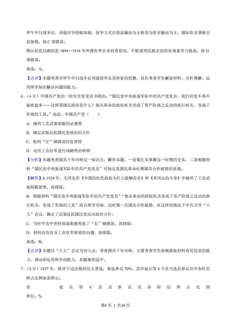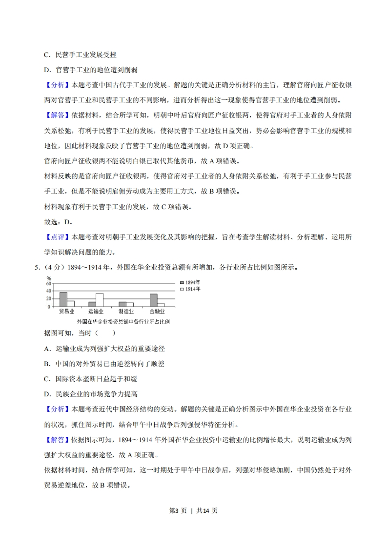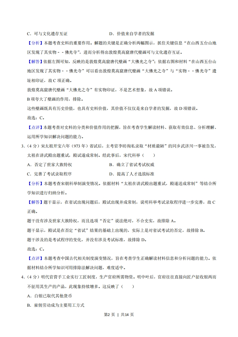 2020年全国统一高考历史试卷(新课标Ⅱ)◆考答案与试题解析一、选择题:本题共12小题,每小题4分,共48分。在每小题给出的四个选项中,只有一项是符合题目要求的。1.(4分)据史书记载,角抵(摔跤)“盖杂技乐也,巴俞(渝)戏、鱼龙蔓延(百戏节目)之属也”。秦二世曾在宫中欣赏。汉武帝在长安举行了两次大规模的角抵表演,长安百姓“三百里内皆观”,他也曾用角抵表演欢迎来长安的西域人。据此可知,当时角抵()A.促进了川剧艺术的发展B.拥有广泛的社会影响C.推动了丝路文化的交流D.源于民间的劳作技能【分析】本题考查中国古代的社会生活。解题的关键是正确分析材料的主旨,分析得出材料反映了角抵表演受到各个阶层的欢迎,进而分析得出角抵拥有广泛的社会影响。【解答】依据材料可知,角抵表演不仅仅受到皇室的欣赏,还受到百姓和西域人的欢迎,说明角抵拥有广泛的社会影响,故B项正确。材料没有体现角抵促进川剧艺术的发展,故A项错误。材料不能说明角抵推动丝路文化的交流,故C项错误。D项不是材料的主旨,排除。故选:B。【点评】本题考查对秦汉时期角抵表演及其影响的把握,旨在考查学生解读材料、分析理解、运用所学知识解决问题的能力。2.(4分)敦煌莫高窟61号洞中的唐代壁画“五台山图”中有一座“大佛光之寺”,梁思成、林徽因按图索骥,在山西五台山地区发现了其实物~-佛光寺。这一事例说明此类壁画()敦煌壁画中的“大佛光之寺”五台山佛光寺A.创作源于艺术想象B.能完整还原历史真实第1页|共14页