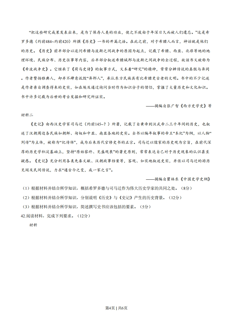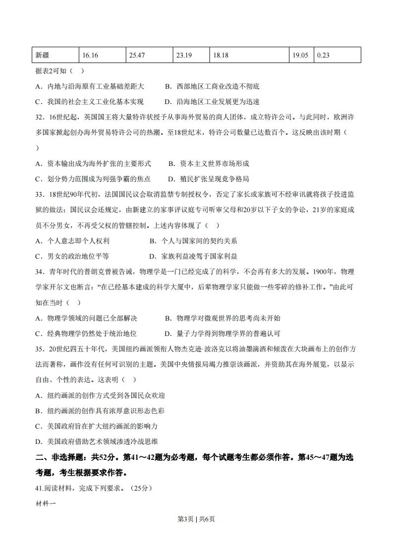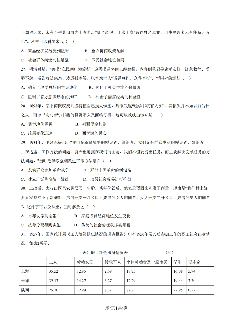 绝密★启用前2021年普通高等学校招生全国统一考试(乙卷)文科综合能力测试历史部分注意事项:1.答卷前,考生务必将自己的姓名、准考证号填写在答题卡上。2。回答选择题时,选出每小题答案后,用铅笔把答题卡上对应题目的答案标号涂黑。如需改动,用橡皮擦干净后,再选涂其他答案标号。回答非选择题时,将答案写在答题卡上。写在本试卷上无效。3.考试结束后,将本试卷和答题卡一并交回。一、选择题:本题共12小题,每小题4分,共48分。在每小题给出的四个选项中,只有一项是符合题目要求的。24.西周分封制下,周天子与诸侯国君将包括土地及人口的采邑赐给卿、大夫作为世禄。西周中期以后,贵族所获采邑越来越多,到春秋时期,有的诸侯国一个大夫的采邑就多达数十个。这说明()A.土地国有制度废除B.分封体制不断强化C.诸侯国君权力巩固D.社会生产持续发展25.表1西汉末、东汉中期部分地区民户数量表单位:户郡名西汉末东汉中期代郡(今河北、山西间)5677120123太原(今属山西)16986330902南阳(今河南南部及湖北、陕西部分地区)359316528551汝南(今河南东南、安徽西北)461587404448豫章(今属江西)67462406496零陵(今湖南、广西间)21092212284据表1可知,在此期间()A.长江以南经济发展加速B.豪强大族势力没落C.南北经济的不平衡加剧D.个体农耕经济衰退26.宋代,官府强调“民生性命在农,国家根本在农,天下事莫重于农”,“毋舍本逐末”。苏辙说:“凡今农第1页|共6页