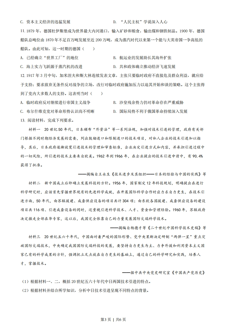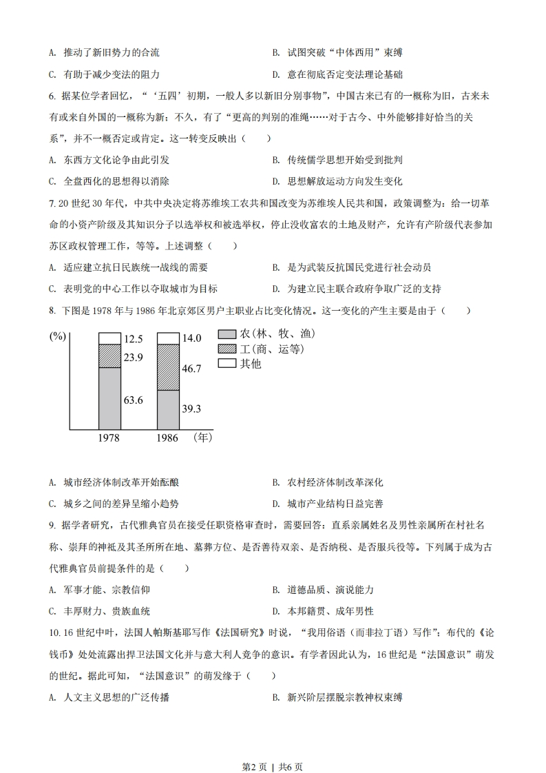 2022年全国乙卷文综历史试题1.据下图可知,商、西周青铜器铸造的繁荣()▲重要铜矿水(安徽铜陵)。商、西周政治中心(湖北天治)A(江西瑞昌)·西周主要诸侯国A.推动了南北农业经济进步B.依赖大规模商业活动开展C.反映了南北方联系的加强D.缘于统治区域扩大到江南2.盛唐洋溢着刚健丰伟、庄重博大的时代气象,这在书法艺术上亦有体现。宋代书法家米芾推崇唐代某位书法家的作品“如项羽挂甲,樊哙排突,硬弩欲张,铁柱将立,昂然有不可犯之色”。能够突出体现这一风格的书体是()A.小篆B.楷书C.行书D.草书3.宋朝在州府设通判,重要州府设两名,民户少的州可以不置,但若武官任知州,则必置。通判有自己专属的衙门通判厅,与知州(府)共议政务、同署文书,“有军旅之事,则专任钱粮之责”。据此可知,设置通判的主要目的是()A.规范地方行政B.防止武人干政C.提升军事能力D.削弱州府权力4.明后期有士人称,江南流行“好名喜夸”之风,家中但凡有千金之产,必定会营建一园,“近聚土壤,远延木石,聊以矜眩于一时耳”,但“俗气扑人”。这可用于说明()A.士大夫传统观念的颠覆B.世俗化审美趣味的初现C.士农工商社会结构解体D.江南市镇工商业的繁荣5.维新变法期间,湖南巡抚陈宝箴推行变法改革,但在上《请厘正学术造就人才折》中称“康有为平日所著《孔子改制考》一书…其徒和之,持之愈坚,失之愈远,嚣然自命,号为‘康学',而民权平等之说炽矣”,并奏请销毁《孔子改制考》。这种主张()第1页」共6页