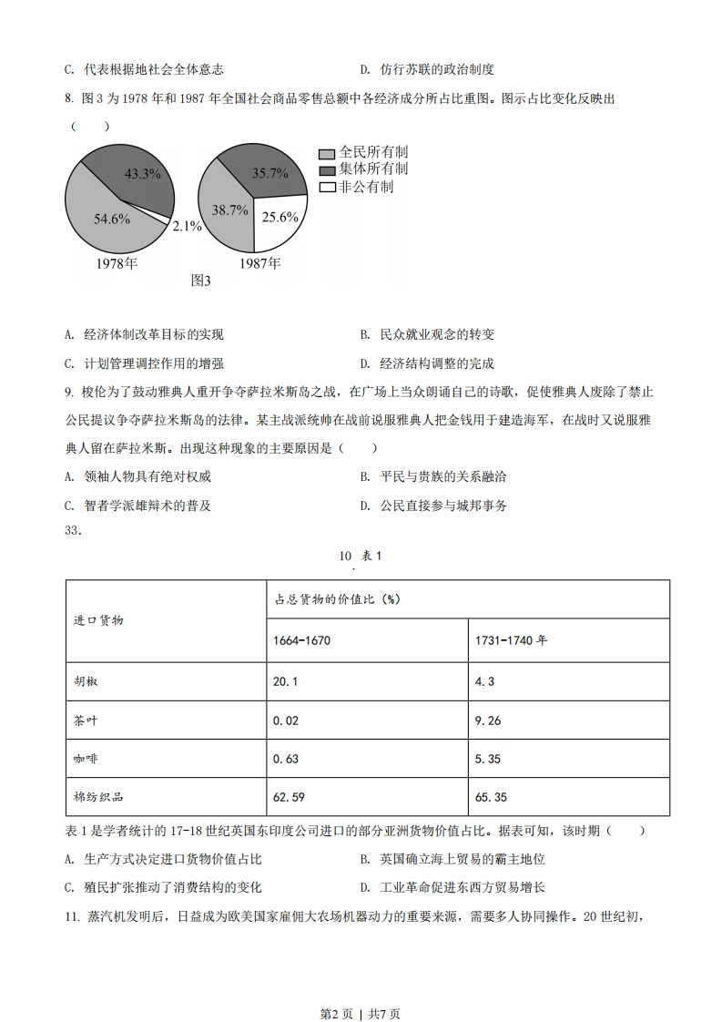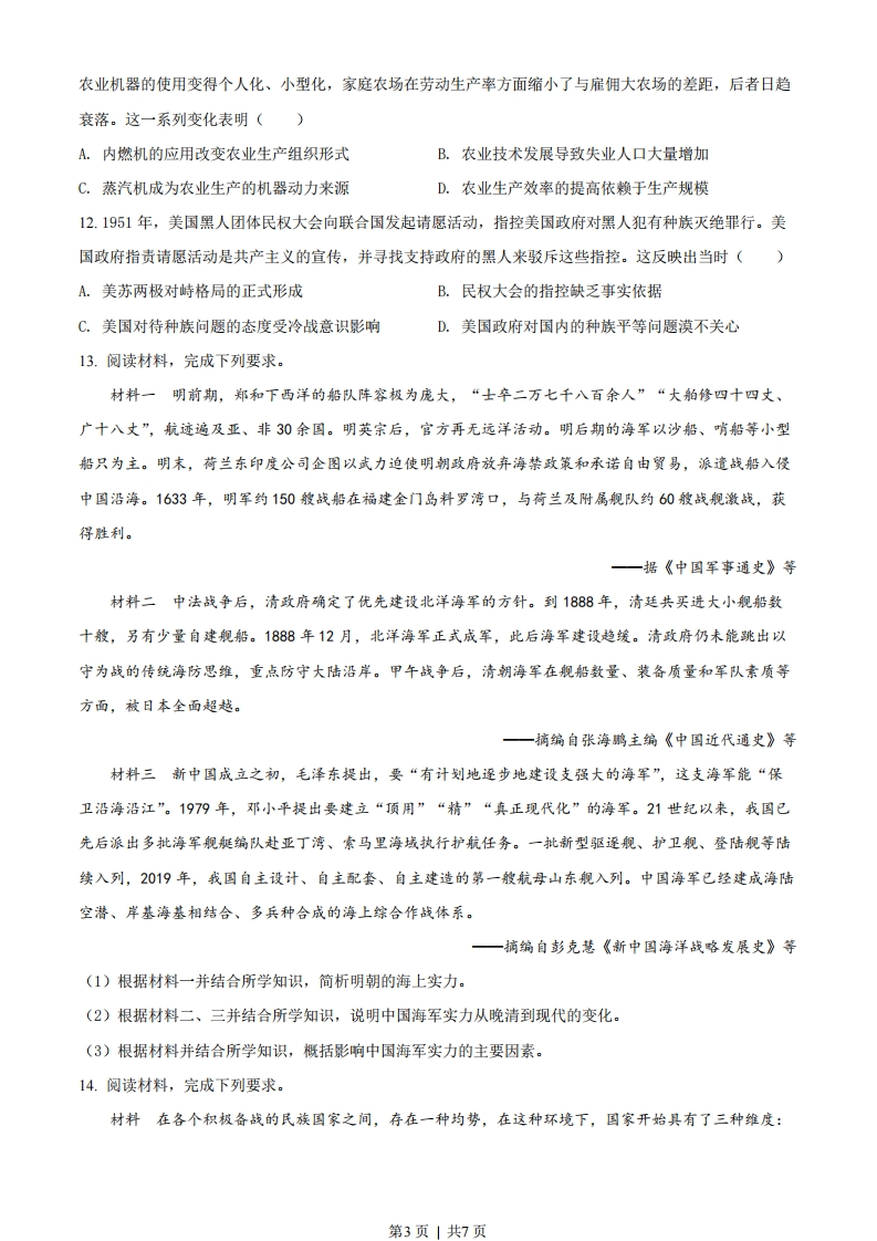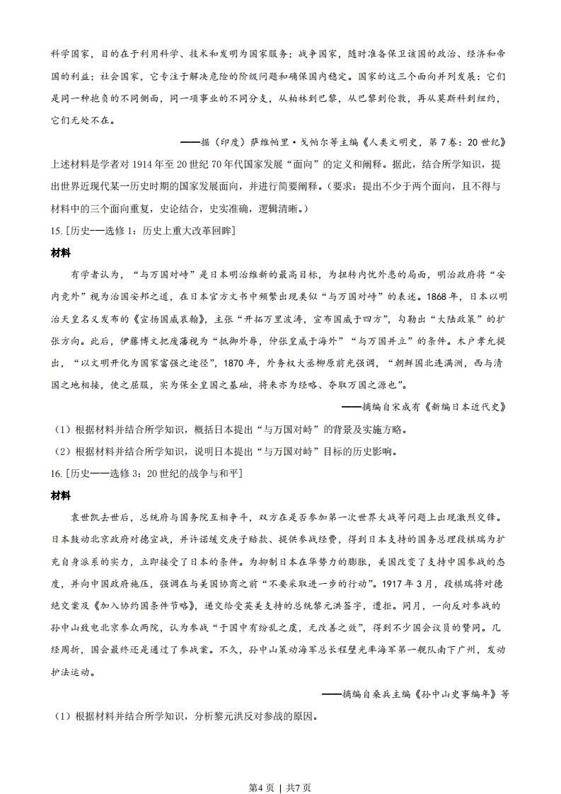 2022年高考全国甲卷历史真题1.汉晋时期有多种文本记载,帝尧之时,“天下太和,百姓无事”。有老者“击壤”而戏,围观者称颂帝尧。老者歌云:“吾日出而作,日入而息,凿井而饮,耕地而食,帝何德于我哉!”上述记载所体现的政治理念最接近()A.孔子B.老子C.韩非D.墨子2.西晋至唐初,皇子皇弟封王开府,坐镇地方,手握重权。唐玄宗在京城专门修建一座大宅邸,集中安置诸王,由宦官管理,称为“十王宅”,又仿此建“百孙院”。此后,唐朝沿用该制度。由此可知,唐后期对皇子皇孙的安置()A.削弱了藩镇势力B.强化了分封体制C.凸显了专制集权D.动摇了宗法制度3.宋朝海外贸易中,输出的商品主要是丝织品、瓷器、漆器、铁器等,输入的商品以香料、犀角、象牙、珊瑚、珍珠等为大宗。政府每年从海上进口贸易中获利颇丰。这表明,在宋朝()A.进口商品成为基本生产资料B.开辟了海上丝绸之路C.外贸成为国家税收主要来源D.手工业生产较为发达4.康熙年间,多次令各地举荐山林隐逸,又令官员推举博学鸿儒,吸收学行兼优之士。开设明史馆,召集文人编纂明史,还进行多部儒经传注的修纂,编成《康熙字典》。上述措施的主要目的是()A.承续华夏传统B.倡导疑古辨伪C.弘扬程朱理学D.保存历史文献5.1846年,上海的进口货值较前一年下降13%,1847年又减少5.4%,1848年更大幅度地下降20.1%。此后虽有回升,但极不稳定,一直到1854年还没有恢复到1845年的水平。这可用于说明,进口货值的下降()A.阻止了自然经济的解体B.导致西方商品倾销重心转移C.促使传统手工业的恢复D.成为列强进一步侵华的借口6.“百日维新”前,梁启超任教于湖南时务学堂,“所言皆当时一派之民权论”,又窃印《明夷待访录》《扬州十日记》等禁书,“加以案语,秘密分布,传播革命思想,信奉者日众”,于是“湖南新旧派大哄”。这反映出,当时()A.革命己成为主要思潮B.维新派变法策略未能统一C.变法思想的根本转变D.维新派侧重动员民众变法7.1939年,朱德指出,“在中国,由议会选举政府,决定施政方针,边区是第一个”。1940年,毛泽东再次强调,这种政权“是一切赞成抗日又赞成民主的人们的政权,是几个革命阶级联合起来对于汉奸和反动派的民主专政”。这说明,边区政府()A.具备了新民主主义的特征B.脱离了国民政府管辖第1页」共7页