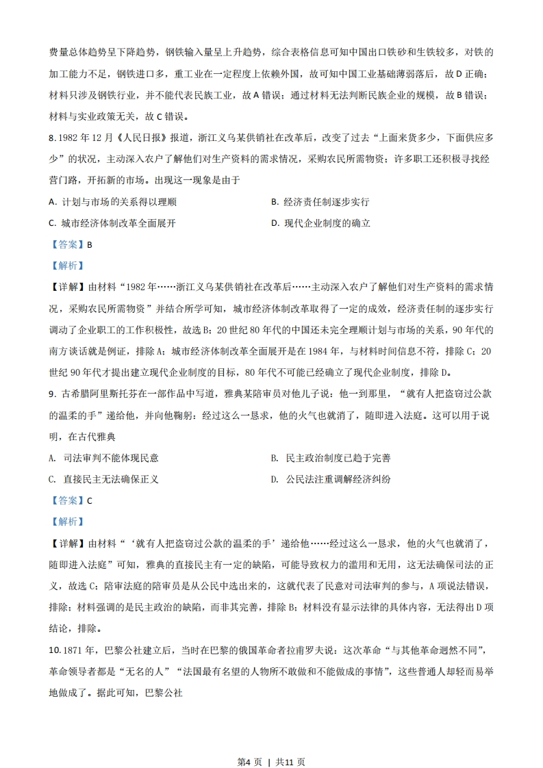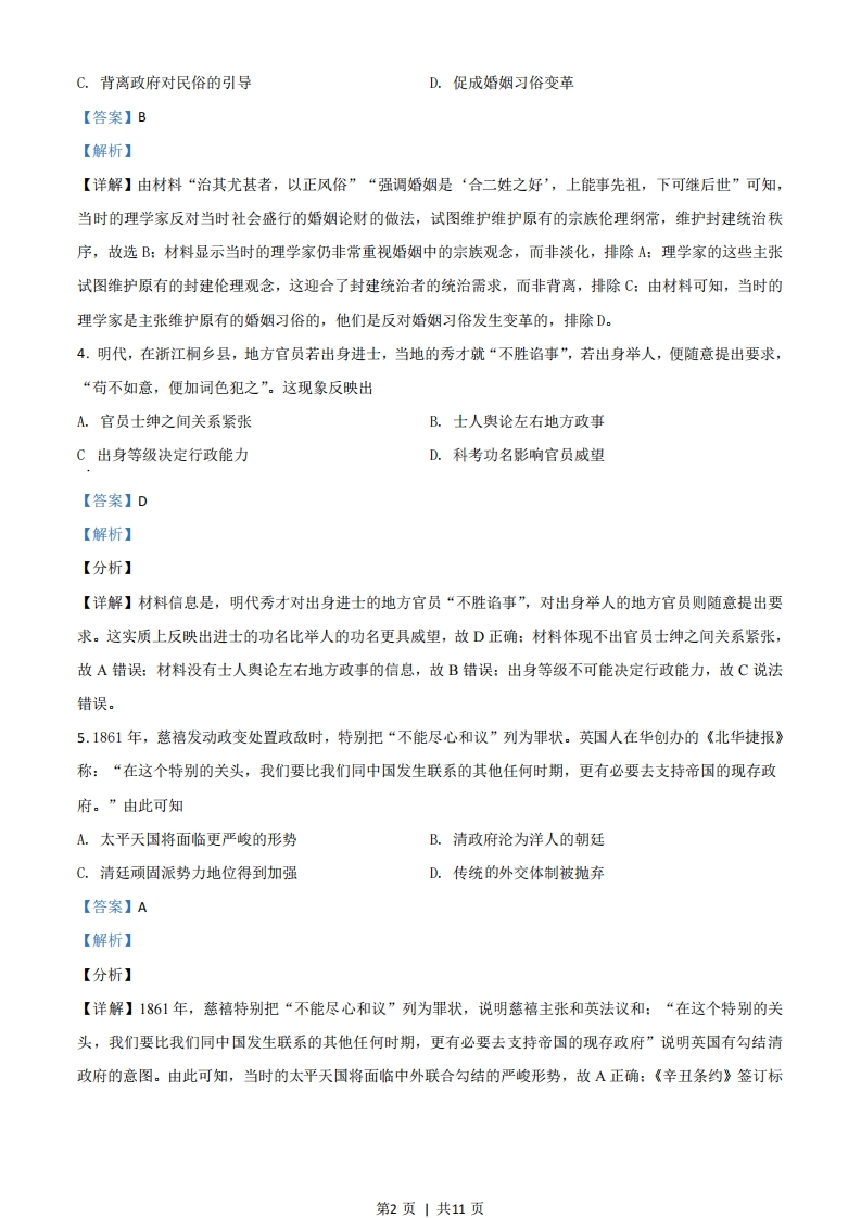 2021年普通高等学校招生全国统一考试(全国甲卷)文综历史试题一、选择题1.老子认为,“失道而后德,失德而后仁,失仁而后义,失义而后礼”。孔子则说,“不学礼,无以立”,要“非礼勿视,非礼勿听,非礼勿言,非礼勿动”。这反映出,当时他们A.反思西周的礼乐文化B.迎合封建贵族政治诉求C.主张维护夏商周制度D.得到统治者的积极支持【答案】A【解析】【详解】材料中的老子认为礼的出现是社会偏离了大道、仁义等道德观念逐步失败的产物,而孔子则认为礼是调和社会矛盾、维持社会秩序的有效方式,二者尽管对礼的看法有所不同,但提出观点的出发点是相同的,即都出于对西周礼乐制度的反思,只是一个赞同,一个批评而己,故选A:老子对礼是持否定态度的,他的主张并未迎合封建贵族的政治诉求,排除B:老子主张小国寡民,主张退回夏商周之前的社会当中去,C项不是老子的诉求,排除:老子和孔子生活于春秋时期,他们都主张退回到以前的社会当中去,故他们的主张并未得到统治者的积极支持,排除D。2.汉代,中央各部门长官与地方各郡太守自行辟召属官,曾一度出现“名公巨卿,以能致贤才为高:而英才俊士,以得所依秉为重”的现象。能够保障辟召制度有效运作的是A.分科考试选官制建立B.监察体系的改进C.郡国并行制度的完善D.察举制度的实施【答案】B【解析】【分析】【详解】依据所学知识可知,辟召制度是察举制的补充,选拔了大量真才实学之人,其运作是辟主根据民间呼声或自己的见闻,使出身草野没有机会入仕之人进入统治阶层。辟召制度是“中央各部门长官与地方各郡太守自行辟召属官”,要保证其有效运作并加强中央的控制,这就需要监察体系的改进,故B正确:分科考试选官制指的是科举制,故A错误:郡国并行制度是地方行政制度,和材料没有必然联系,故C错误:察举制度和辟召制度是两种不同的选官制度,故D错误。3.宋代盛行婚姻论财,遭到一些士大夫的批评。南宋理学家张弑认为,“婚姻结好,岂为财物?”甚至表示“治其尤甚者,以正风俗”。还有理学家强调婚姻是“合二姓之好”,上能事先祖,下可继后世。这反映了当时理学家A.淡化婚姻中的宗族观念B.意图维护礼教纲常第1页|共11页