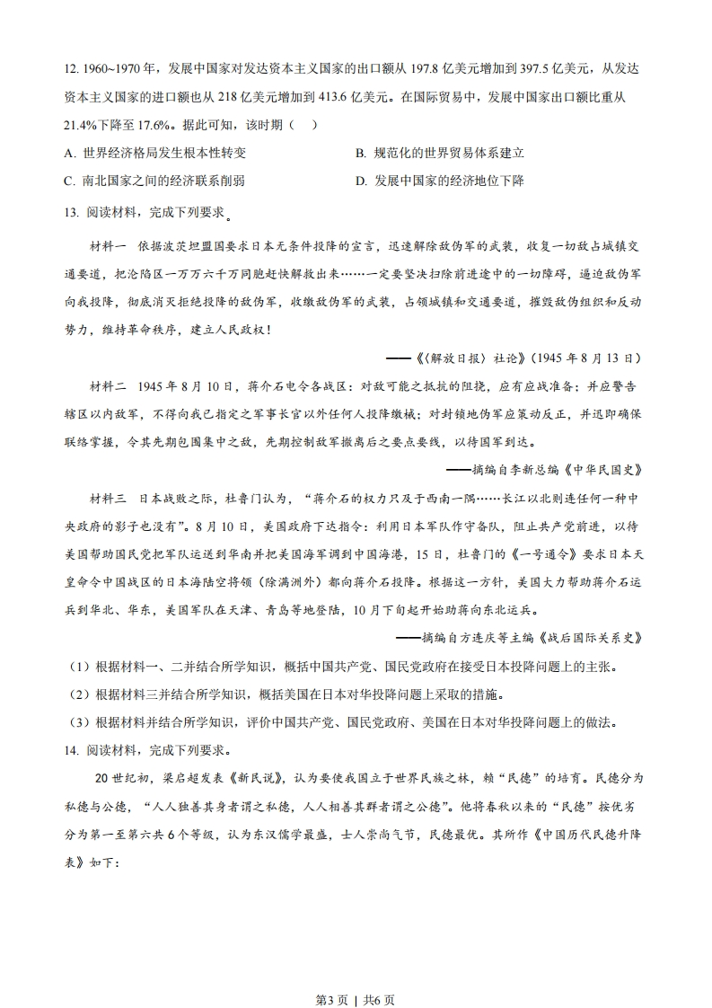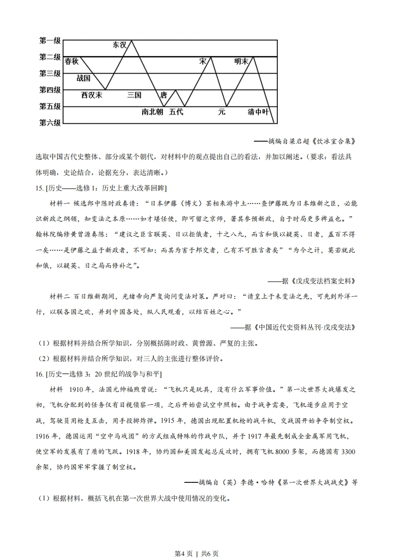 2023年普通高等学校招生全国统一考试(全国乙卷)历史1.孟子说:“五亩之宅,树之以桑,五十(岁)者可以衣帛矣:鸡豚狗彘之畜,无失其时,七十(岁)者可以食肉矣:百亩之田,勿夺其时,数口之家可以无饥矣。”这一观点所依托的时代背景是()A.休养生息政策的实施B.井田制度的繁荣C.农业生产技术的发展D.商业活动的衰退2.唐代中后期文人间流行诗歌唱和之风,“江南”成为唱和的重要主题。杭州、苏州、湖州、宣州(今安徽宣城)等地名常在唱和诗歌中出现。这种风尚()A.得益于稳定的地方秩序B.缘于坊市制度的崩溃C.助推山水田园诗的兴起D.导致经济重心的南移3.南宋时书籍流行,文人刻书蔚然成风,如陆游、范成大、杨万里、朱熹等人在各地任官期间,都曾刊行自己或先人、名宦、师友、乡贤的著述,地方官学、民间书院等亦以刻书为己任。这有助于()A.士族阶层的出现B.儒学正统地位的确立C.科举制度的兴起D.社会文化水平的提升4.明初,朱元璋要求百姓邻里之间必须互相知晓丁数、职业,即“某民丁几,受农业者几,受士业者几,受工业者几,受商业者几”。这一措施意在()A.强调农商皆本B.加强对民间的控制C.禁止人口流动D.促进经济均衡发展5.19世纪70年代之前,伦敦市场上中国茶叶价格的日常波动很难影响到中国国内的茶叶出口价格。随着中英间电讯联系的建立,中国茶叶的出口价格随着伦敦市场的标价而变动,销售数量也随着世界经济的变动而波动,这()A.导致中国茶叶出口衰落B.改变了中国对外贸易的入超状况C.促成了世界经济一体化D.削弱了中国茶叶的国际市场地位6.1920年5月,陈独秀发表演说:“中国古人说‘劳心者治人,劳力者治于人'。现在我们要将这句话倒转过来说,‘劳力者治人,劳心者治于人'。”9月,他发文主张“用革命的手段建设劳动阶级(即生产阶级)的国家”。这反映出()A.工人待遇得到极大改善B.民主与科学深入人心C.无产阶级登上政治舞台D.工农运动的蓬勃发展7.图1、图2分别为1955~1956年拍摄的动画片《神笔》《骄傲的将军》的剧照,两部影片融入了中国传统戏曲、诗画等元素,在世界影坛上独树一帜。这体现出新中国艺术创作()第1页|共6页