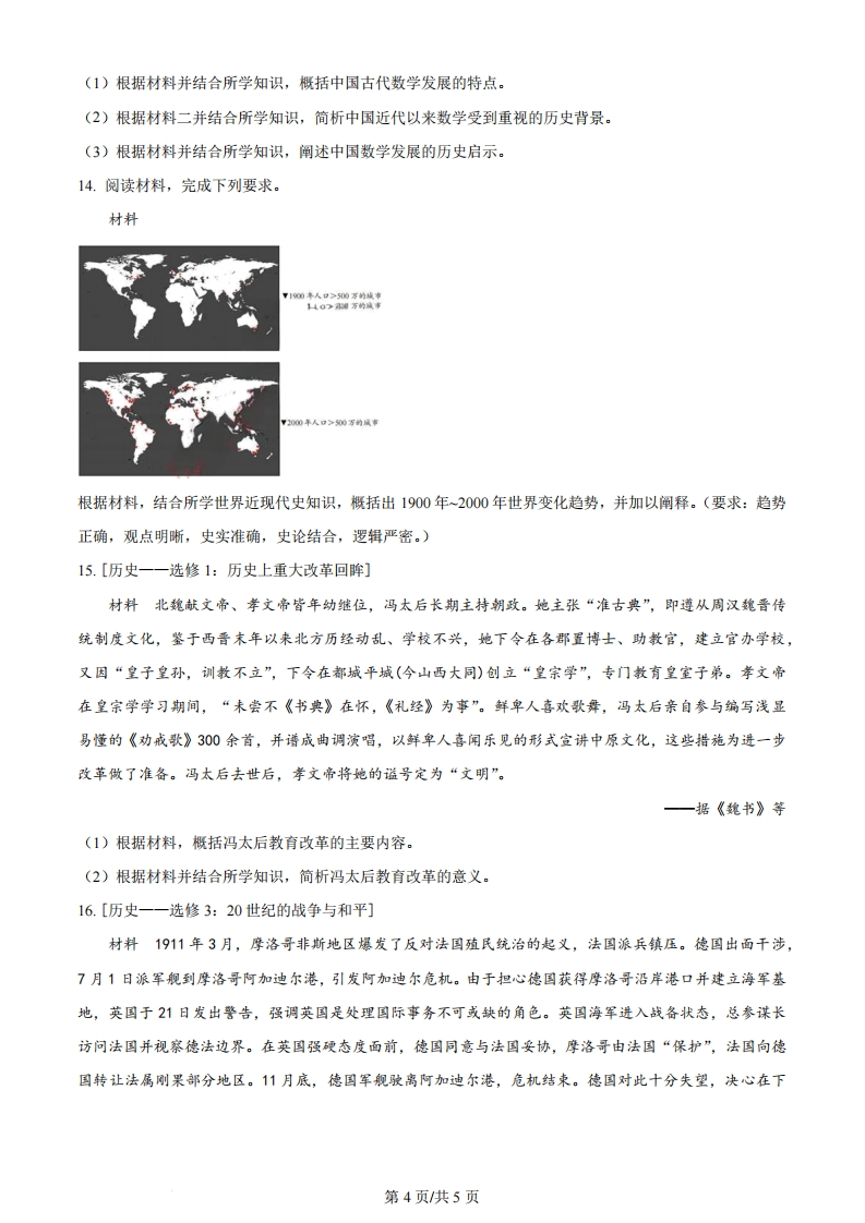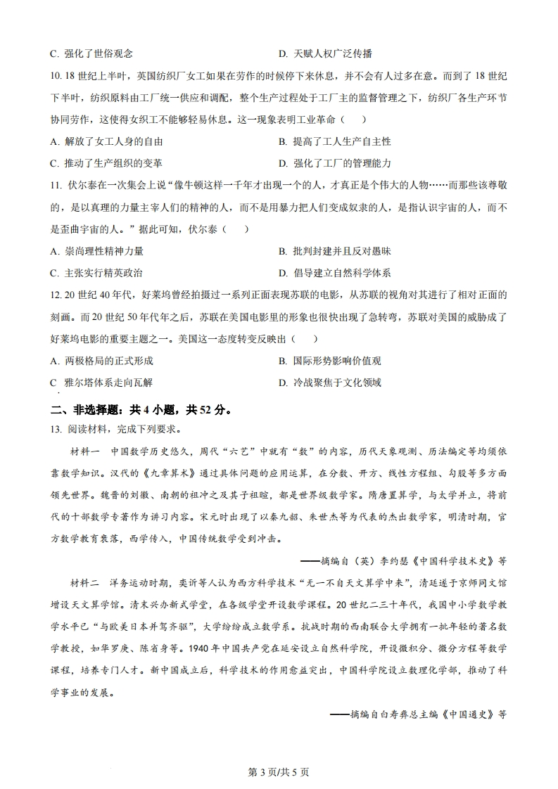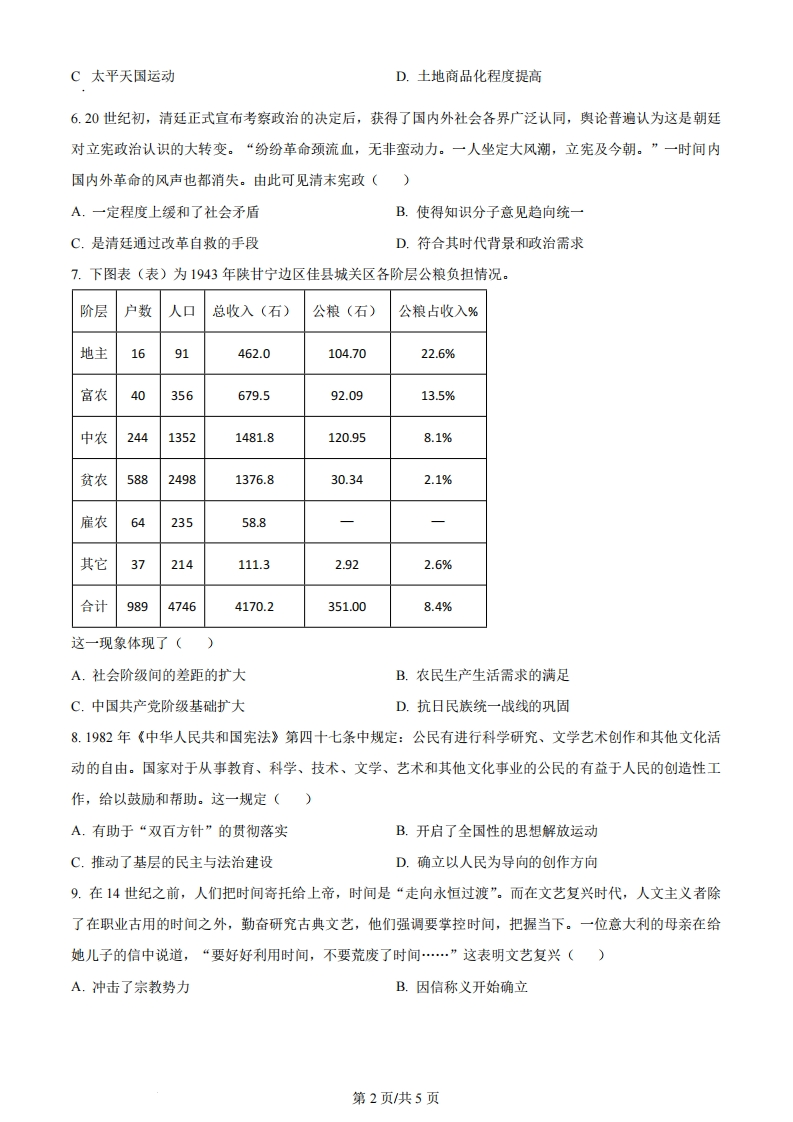 绝密★启用前2024年普通高等学校招生全国统一考试(全国甲卷)历史注意事项:1,答卷前,考生务必将自己的姓名、准考证号填写在答题卡上。2。回答选择题时,选出每小题答案后,用铅笔把答题卡上对应题目的答案标号涂黑。如需改动,用橡皮擦干净后,再选涂其它答案标号。回答非选择题时,将答案写在答题卡上。写在本试卷上无效。3。考试结束后,将本试卷和答题卡一并交回。一、选择题:本题共12小题,每小题4分,共48分。在每小题列出的四个选项中,只有一项是最符合题目要求的。1.春秋时期,周王室衰微,诸侯争当“盟主”。齐国、晋国、楚国接续争雄,吴越争霸。诸侯成为“盟主”可以()A.取代周天子获得分封权力B.成为诸侯国的“大宗”C.免除向周王室纳税的义务D.号令各诸侯国的行动2.隋唐时期,常有商贩运着木材到城中指定区域进行售卖,也有人在城外种植桑树,然后砍伐送到城市作为柴薪进行售卖为生。由此可知,该时期()A重农抑商政策废弛B.城市能源问题突出C.商品经济不新发展D.市镇经济开始兴起3.明代中后期士大夫广泛参与日用类书籍编纂。弘治年间进士邝璠以《耕织图》为蓝本,编撰《便民图纂》一书,为苏南一带农村日常生活及农事活动提供指导。其内容庞杂,载有农艺、园艺、养畜等农业技术和饮食器用方面的知识。《便民图纂》的出现体现了()A.朝廷加强对社会的控制B.士大夫阶层趋于世俗化C.平民文化需求范围扩大D.日常生产生活的标准化4.清初《西游记》《三国演义》等小说出版盛行,广为传播,同时出现了满文版本进行刊印。而对于清政府认为会败坏社会风气,影响社会稳定的书籍则被列为禁书,进行销毁。这导致了()A.世俗文化发展停滞化B.社会政治和平失序化C.政府的思想专制僵化D.传统伦理道德的延续5.19世纪50年代之前,江苏镇江府土地多集中于地主手中。而到了六七十年代,镇江府“大地主不复存在”,十之八九的土地为耕者所有,1888年后基本集中在小农户手上。导致这一现象出现的原因是()A.西方列强入侵B.民族资本主义的发展第1页/共5页