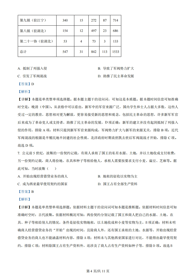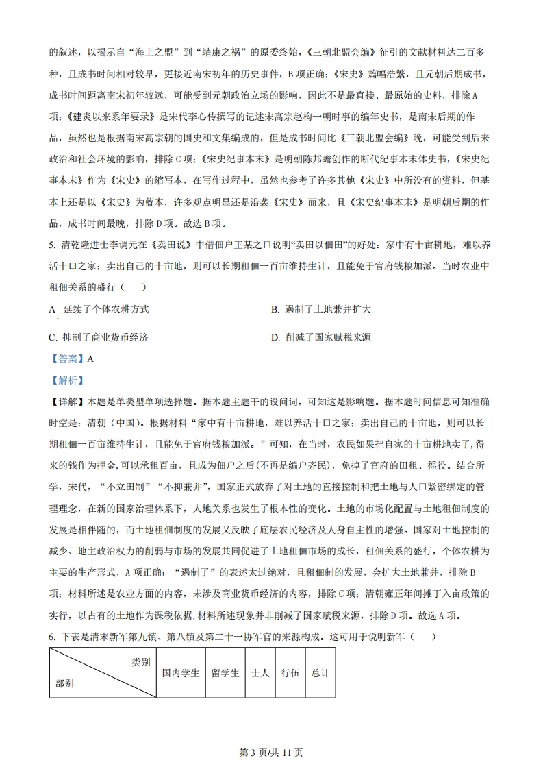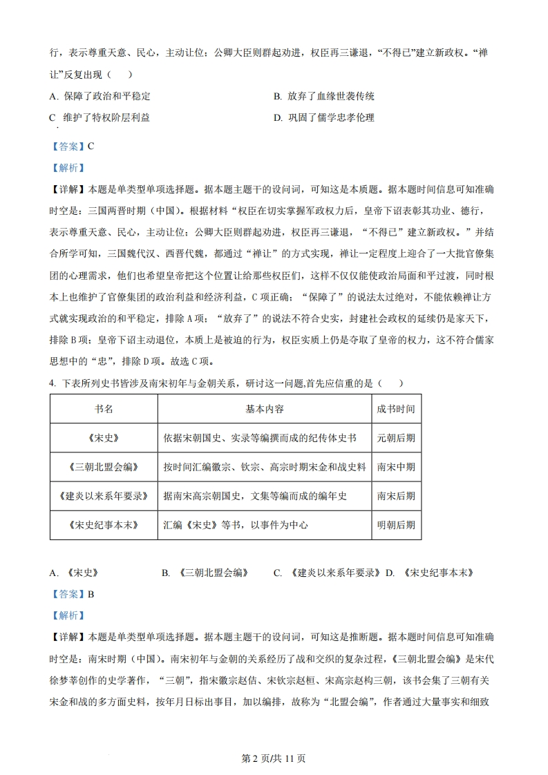 2024年高考新课标卷历史真题1.考古学者在某史前遗址发掘出1300余座墓葬,大、中、小三类墓葬分别占总数的不到1%、近10%和90%。其中大型墓葬规模大、随葬品丰富,出土了成套的石制、陶制礼器等。据此可以推断,该遗址处于()A旧石器时代早期B.旧石器时代晚期C.新石器时代早期D.新石器时代晚期【答案】D【解析】【详解】本题是单类型单项选择题。据本题主题干的设问词,可知这是推断题。据本题时间信息可知准确时空是:新石器时代(中国)。根据材料可知并结合所学可知,墓葬中随葬品的多寡反映出贫富差别开始出现,阶级己经萌芽,社会中正孕育着文明因素,结合所学新石器时代晚期,社会经济文化水平发展到更高的层次,青铜铸造己经发明,城市出现,墓葬中随葬品的种类和数量相差悬殊,反映了阶级的出现,表明在此阶段己经出现了文明的曙光,社会历史己接近文明时代的门槛,D项正确:旧石器时代是指以使用打制石器为标志的人类物质文明发展阶段,距今约250万年约1万年前,从事渔猎和采集,过着群居生活,生产力发展水平有限,并未出现阶级分化,排除A、B项:新石器时代早期,考古学文化的石器仍以打制为主,磨制很少,陶器制作粗糙,居民生活以渔猎采集为主,农业和家畜饲养业处于初期阶段,且早期,社会复杂化程度相对较低,发现的大型聚落及墓葬较少,排除C项。故选D项。2.春秋战国时期,各国纷纷进行政治变革,争相延揽人才,诸子百家大都呼吁“选贤与能”。不认同这一理念的学派是()A.儒家B.墨家C.道家D.法家【答案】C【解析】【详解】本题是单类型单项选择题。据本题主题干的设问词,可知这是反向题。据本题时间信息可知准确时空是:春秋战国时期(中国)。结合所学可知,道家提倡道法自然、无为而治、与自然和谐相处,代表没落的奴隶主贵族阶层,其思想较为保守和倒退,并不积极主张变法改革,延揽人才,C项正确:儒家思想中孟子、荀子分别提出“仁政”“隆礼重法”等思想,代表了新兴的地主阶级的利益,其主张一定程度上迎合了诸侯国变法改革的需要,排除A项:墨家代表社会下层小生产者的利益,主张“尚贤”,希望有贤能的人治理国家,排除B项:法家提出了富国强兵、以法治国的思想,主张今必胜昔,因时变革,排除D项。故选C项。3.三国魏代汉、西晋代魏,都通过“禅让”实现:权臣在切实掌握军政权力后,皇帝下诏表彰其功业、德第1页供11页