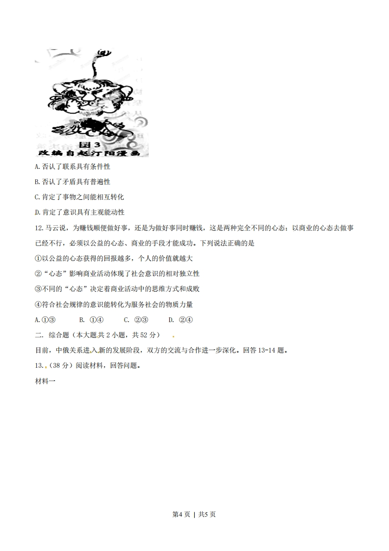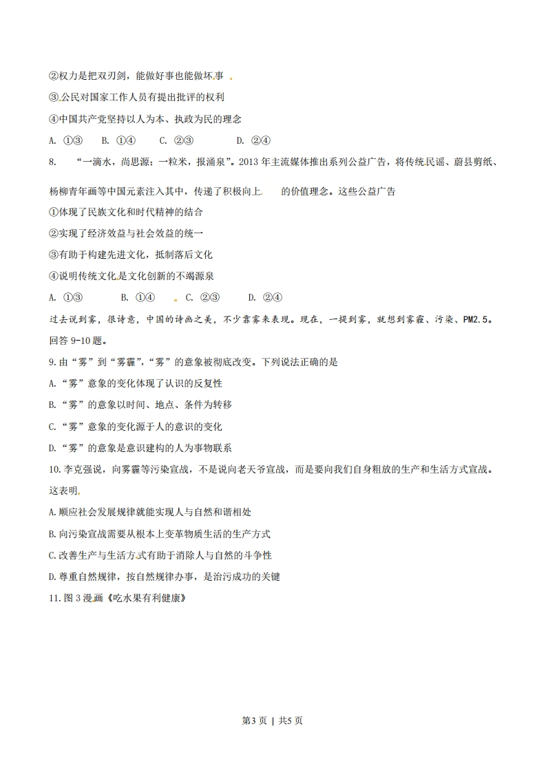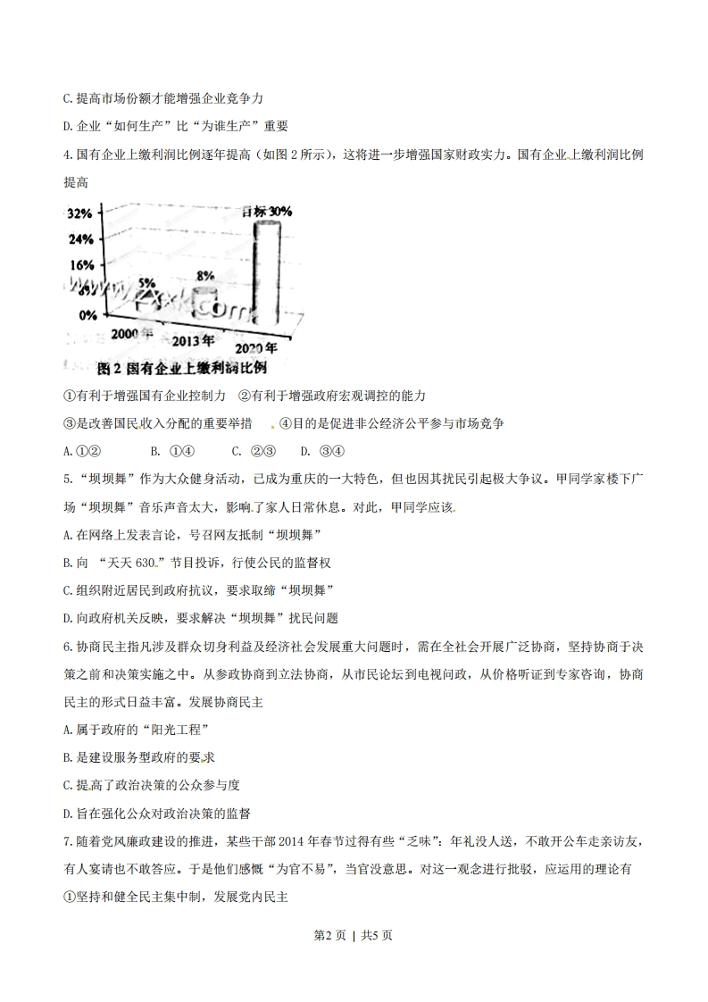 绝密★启封前2014年普通高等学校招生全国统一考试文科综合能力测试(重庆卷)政治说明:本卷为重庆卷,由学科网政治解析团队第一时间独家人工录入。一.选择题(本大题共12小题,每小题4分,共48分)在每小题给出的四个备选项中,只有一个是最符合题目要求的。1.没有买卖就没有杀害。据统计,目前每年约有3万头非洲大象因非法象牙交易被盗猎者杀害。为警示非法象牙交易,多国政府公开销毁缴获的象牙及其制品。材料表明①减少象牙消费将减少猎杀行为②非法猎杀导致象牙的非法交易③公开销毁象牙可以减少象牙交易④象牙消费增长源于收入水平提高A.①③B.①④C.②③D.②④2.结合图1,下列说法正确的是价格卡站低收入湖费者A.目标价格制度违背了市场供求规律B.补贴生产者避免了农产品价格的下跌C.补贴低收入消费者发挥了财政改善民生的功能D.目标价格制度使农产品价格在目标区间内波动3.诺基亚手机以“可以砸核桃”的高质量著称,但面对苹果和三星公司在“用户体验”上的持续创新,诺基亚固步自封,市场份额不断萎缩,最终被微软公司收购。材料表明A.产品质量是企业成功的关键B.市场竞争是“创造性毁灭”的过程第1页|共5页
