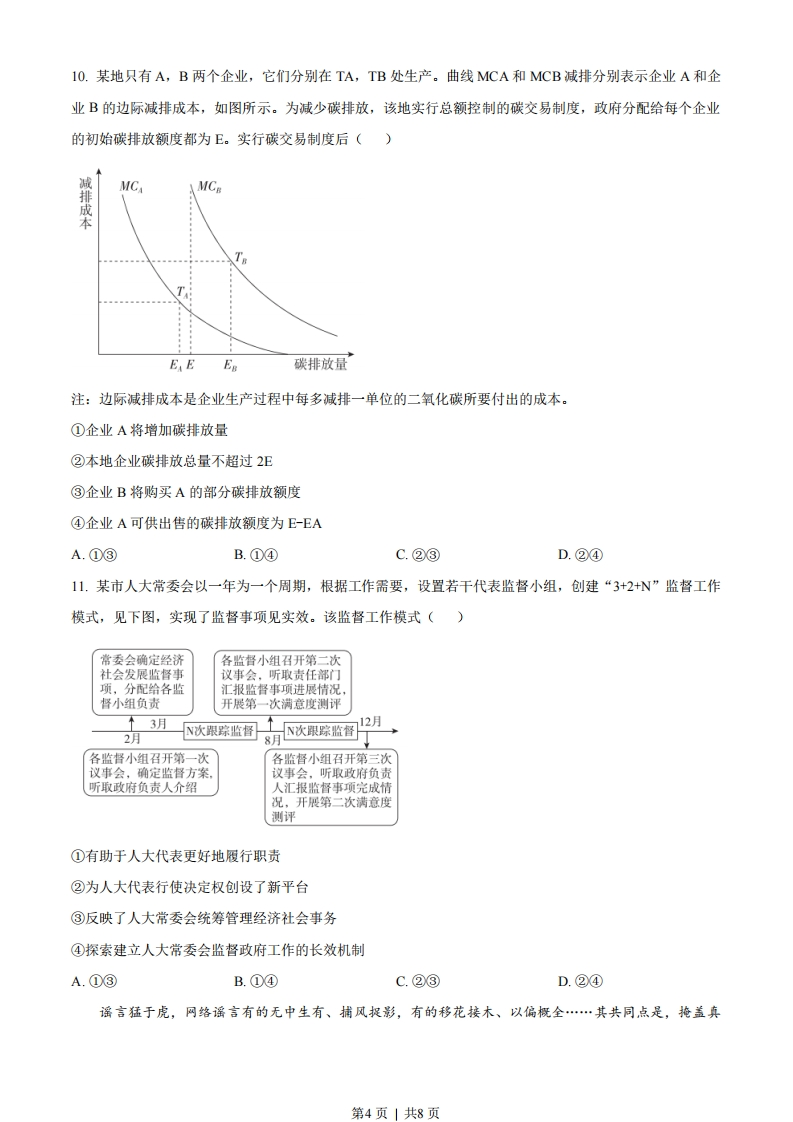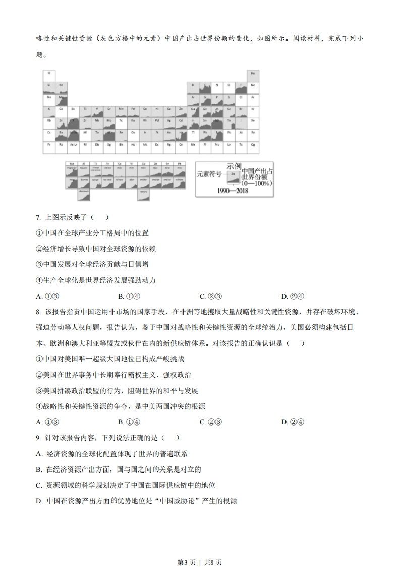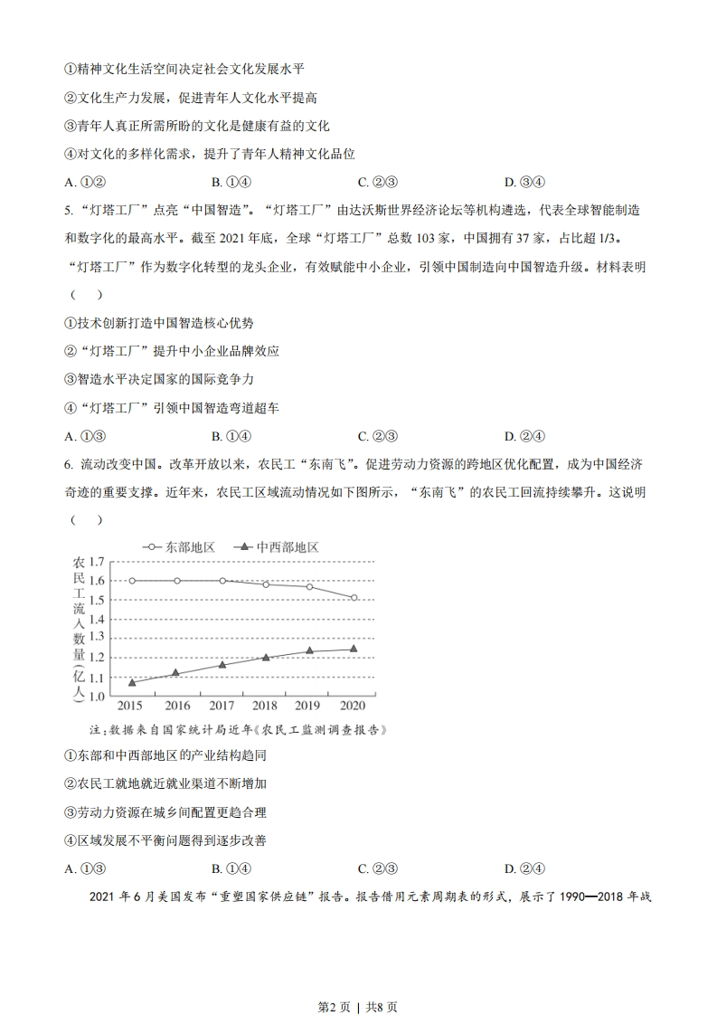 2022年重庆市普通高中学业水平选择性考试思想政治一、单项选释题:本题共15小题,每小题3分,共45分。在每小题给出的四个选项中,只有一项是最符合题目要求的。少年强、青年强,则中国强。阅读材料,完成下列小题。1.小计划大民生。2011年国务院启动“农村义务教育学生营养改善计划”,农村学生每天膳食补贴3元。截至2020年底,营养改善计划覆盖13.16万所学校3797.83万名学生,受益学生的体质健康合格率从2012年的703%提高至86.7%,在此基础上,这些学生身高、体重和学习成绩均有明显增长。该财政补贴计划()①促进社会公平与效率②体现发展成果由人民共享的理念③保障国民经济平稳运行④表明财政政策是资源配置主导手段A.①②B.①④C.②③D.③④2.《2020年全国未成年人互联网使用情况研究报告》显示,我国6~18岁未成年人互联网普及率为94.9%,远高于成年群体,科学研究表明,未成年人正处于脑发育关键时期,长期沉溺网络可能造成脑功能损害,脑神经元的功能连接强化在虚拟世界,对现实世界的认知能力削弱。由此可知()A.未成年人沉溺网络与脑功能损害之间是一种主观联系B.未成年人的脑健康发育是认知能力和水平提升的基础C.未成年人对网络的正确认知只有通过长期网络实践才能形成D.互联网普及率远高于成年人,说明未成年人更易于接受新事物3.一颗法治的种子在青少年心中生根发芽。针对未成年人保护法修订草案,全国人大常委会法工委上海虹桥街道立法联系点向当地某中学学生征集意见。该校学生提出的意见被吸收采纳。同学们通过参与立法意见征集,体验了一堂生动的“法治实践课”。参与立法意见征集()A,是中学生应当履行的政治义务B.有助于培养中学生的民主法治意识C.是中学生行使基本民主权利的体现D.表明中学生是国家立法职权的承担者4.想去哪里去哪里,想看什么有什么。受益图书馆、博物馆、美术馆等公共文化设施的不断完善,青年享受的公共文化服务水平显著提高。与此同时,图书、电影、文艺演出等传统文化产业和数字创意新兴文化产业迅猛发展,青年所需所盼的文化产品日渐丰富,文化视野更加开阔,精神品位不断提升。由此可见()第1页」共8页
