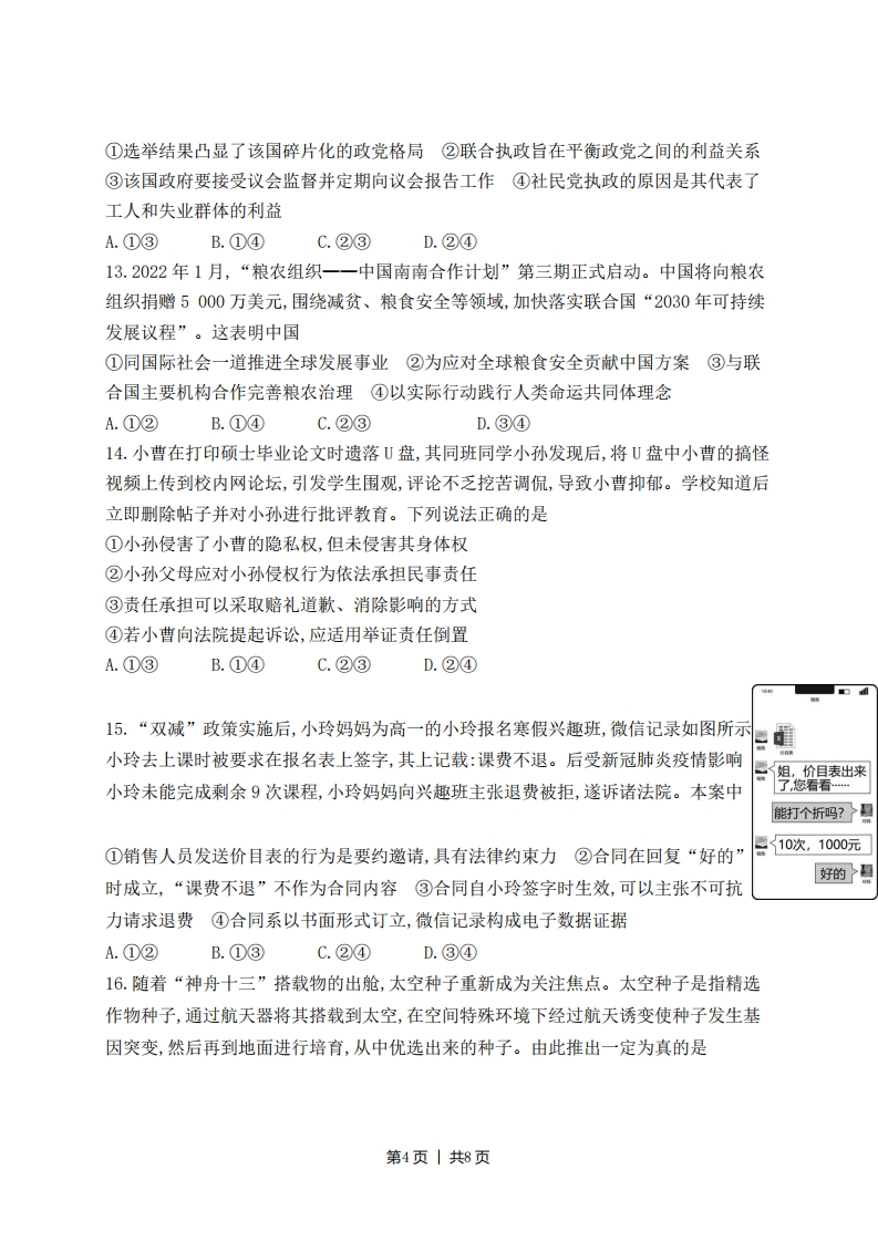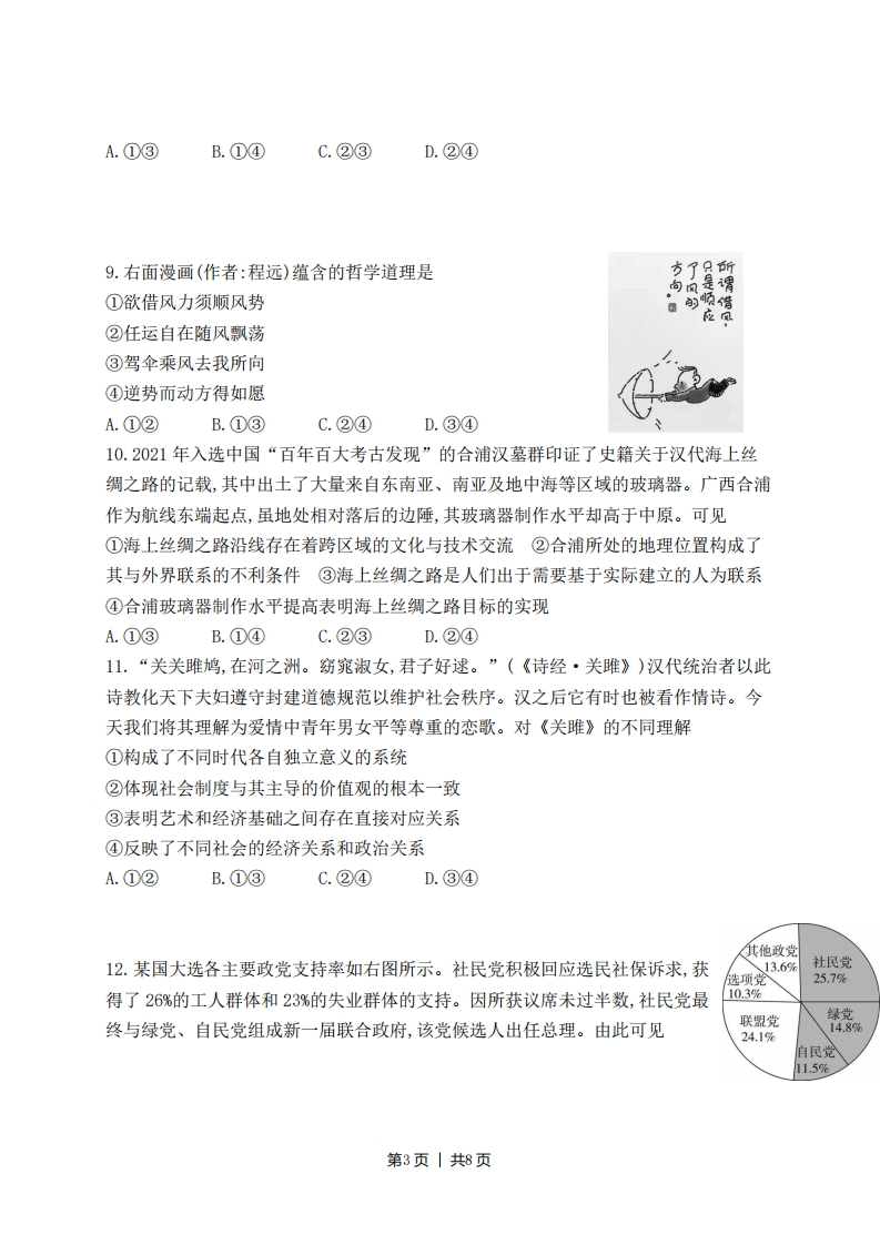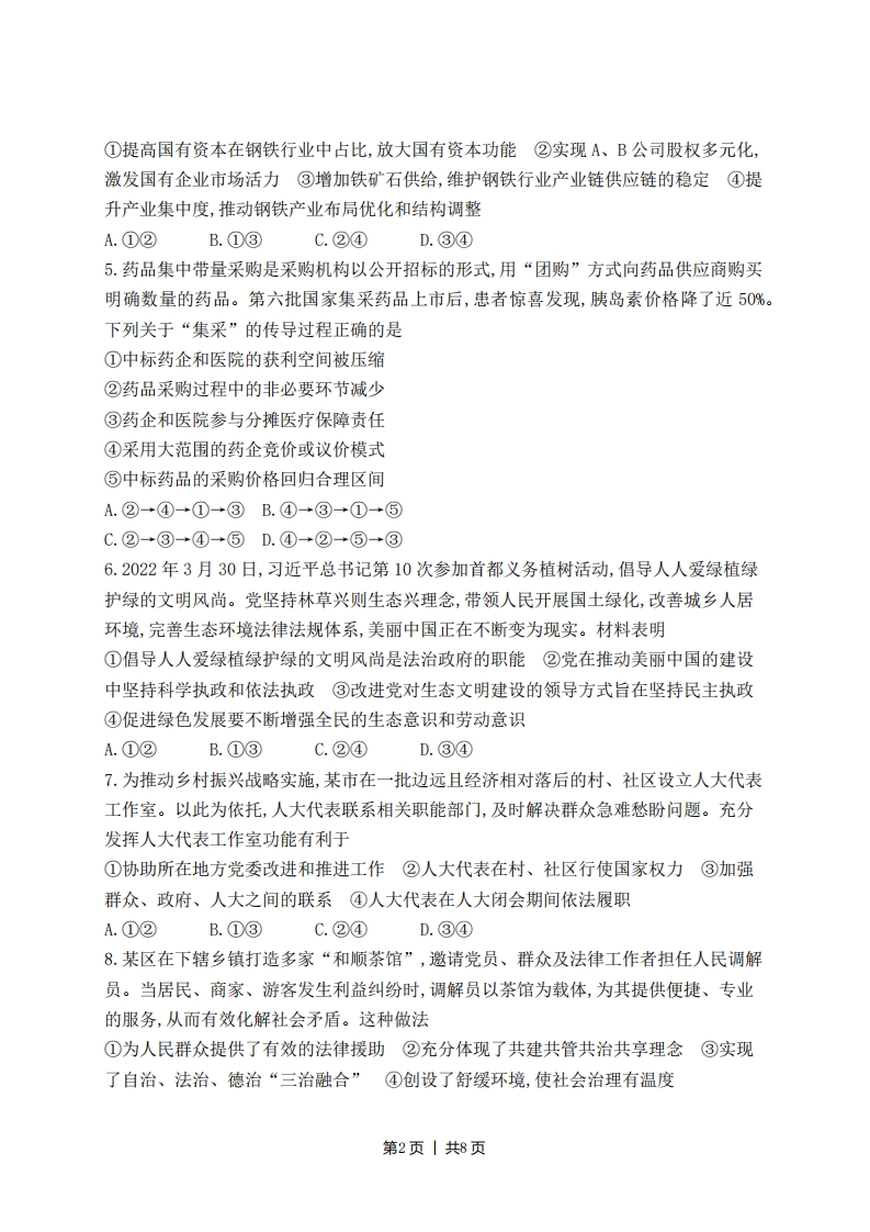 2022年辽宁省普通高等学校招生选择性考试政治一、选择题:本题共16小题,每小题3分,共48分。在每小题给出的四个选项中,只有一个是符合题目要求的。1.李大钊曾说,马克思主义是“世界改造原动的学说”,但必须研究它“怎样应用于中国今日的政治经济情形”。毛泽东指出,“离开中国特点来谈马克思主义,只是抽象的空洞的马克思主义”。习近平总书记指出,“坚持用马克思主义之‘矢’去射新时代中国之‘的’”。这些论述强调①马克思主义为人类社会发展进步指明方向②马克思主义是为人类求解放的人民的理论③党必须不断推进马克思主义中国化时代化④马克思主义是不断发展的开放的理论A.①②B.①④C.②③D.③④2.改革开放以来,我们既不走封闭僵化的老路,也不走改旗易帜的邪路,依靠人民群众创造了伟大奇迹,实现了从生产力相对落后到经济总量跃居世界第二的历史性突破,全面建成了小康社会,开启了全面建设社会主义现代化国家新征程。这表明①改革开放必须坚持走中国特色社会主义道路②改革开放必须突破制度约束,解放和发展生产力③人民群众是改革开放的实践者、参与者和贡献者④改革开放是我国取得一切成绩和进步的根本原因A.①②B.①③C.②④D.③④3.辽宁是抗日战争起始地、解放战争转折地、新中国国歌素材地、抗美援朝出征地、共和国工业奠基地、雷锋精神发祥地,与党的民族复兴伟业同频共振,孕育和传承的红色基因融入辽宁人民的血脉,书写了辉煌与荣光。上述成就的取得在于辽宁①始终坚定不移地坚持中国共产党的坚强领导②坚持以中国特色社会主义思想引领前进方向③致力于中华民族有史以来最深刻的社会变革④人民具有中华民族勇敢坚毅和忠诚担当的品质A.①②B.①④C.②③D.③④4.钢铁企业A(央企)和B(地方国企)重组,地方国资委将所持B企业51%股权无偿划转给A企业。两家企业在铁矿资源储备和采选技术方面都有优势,重组后可推进钢铁板块和铁矿石板块整合运作,粗钢产能将跃居世界第三。该重组有利于第1页|共8页