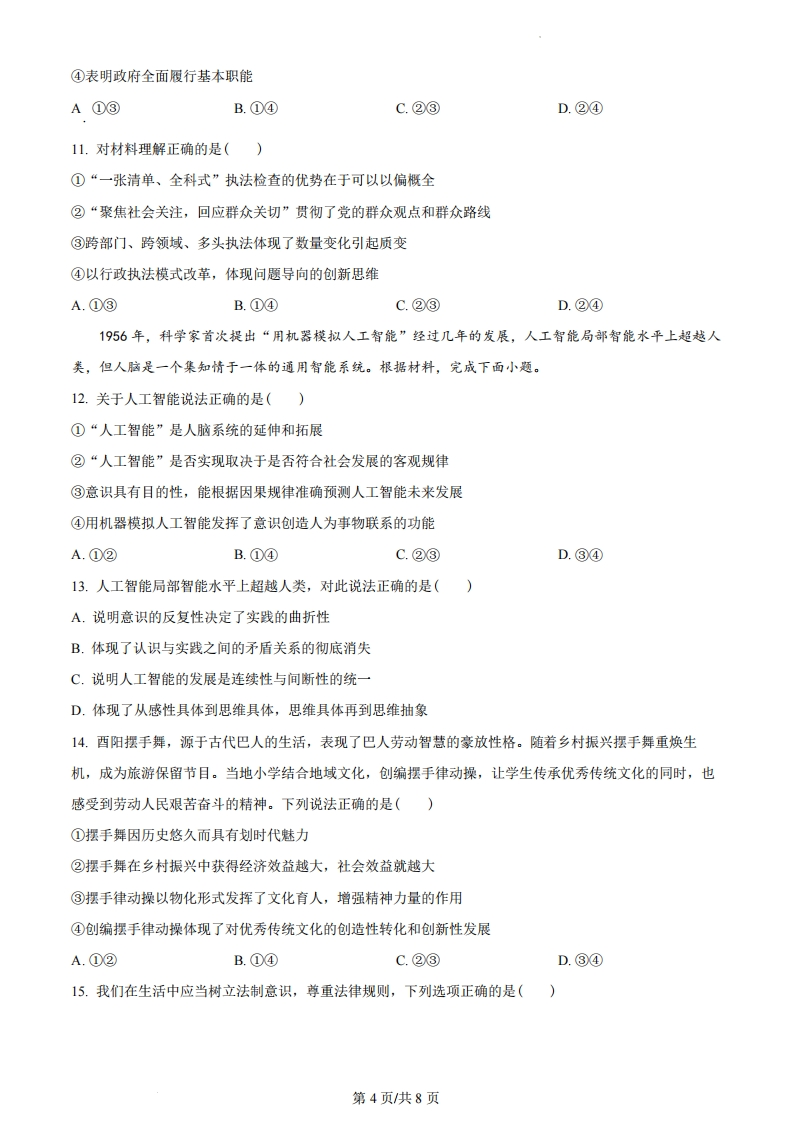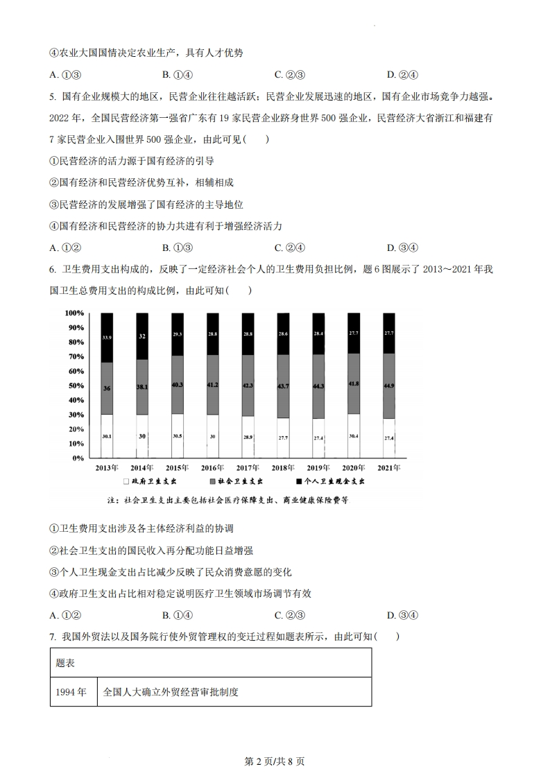 2023重庆高考思想政治本卷满分100分,考试时间75分钟。一、单项选择题:本题共16小题,每小题3分,共45分。在每小题给出的四个选项中,只有一项是符合题目要求的。1.习总书记指出:“要深刻认识,共产主义远大理想与中国特色社会主义共同理想的辩证关系。”既不能离开发展中国特色社会主义事业实现民族复兴的现实工作而空谈远大理想,也不能因为实现共产主义远大理想是一个漫长过程而违背甚至丢掉远大理想。能支撑这一观点的是()A.发展中国特色社会主义的最高目标是实现共产主义B.实现中华民族的伟大复兴,也就实现了共产主义的远大理想C.实现共产主义是一个漫长的过程,现在没有必要谈共产主义D.中国特色社会主义共同理想具有现实性,共产主义远大理想,缺乏现实基础2.习近平总书记在党的二十大报告中明确指出:积极推进实践基础上的理论创新,首先要把握好新时代中国特色社会主义思想的世界观和方法论,坚持好、运用好贯穿其中的立场观点方法“六个必须坚持”,即必须坚持人民至上、必须坚持自信自立、必须坚持守正创新、必须坚持问题导向、必须坚持系统观念、必须坚持胸怀天下。对此作出概括和阐述()A,推进实践基础上的理论创新,必须坚持习近平新时代中国特色社会主义思想的世界观和方法论B.习近平新时代中国特色社会主义思想是马克思主义世界观和方法论的中国化和时代化C.习近平新时代中国特色社会主义思想为解决矛盾问题提供路线图、方法论和具体举措D.习近平新时代中国特色社会主义思想揭示了社会发展规律,决定了社会主义运动发展的方向3.明代思想家顾宪成在东林书院留下“风声雨声读书声声入耳,家事国事天下事事关心”。该对联()A.以直言判断形式描述当时复杂的学习环境B.以选言判断形式呼吁要认真读书学习知识C.以假言判断形式揭示了读书爱国的条件关系D.以联言判断形式的倡导将读书与爱国相结合4.何石宝,硕士毕业后,怀揣着对农业的梦想,从家乡湖南来到了齐鲁大地扎根在平原县这片热土,贡献着自己所学的知识,同时也拥有了一个新标签一一“新农人”,将自己所学的专业知识与农业种植相结合,产量创新高,被评为“粮王”,由此可见(①科学种植是推动农业发展的第一动力②新农人是提高农业生产的主要人力资本支撑③农业现代化为新农人施展才干提供舞台第1页共8页