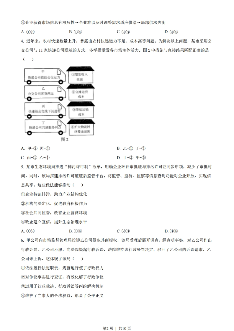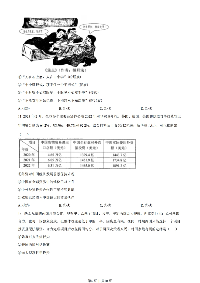2023年辽宁省高考政治试题一、选择题:本题共16小题,每小题3分,共48分。在每小题给出的四个选项中,只有一个是符合题目要求的。1.习近平指出:“概括提出并深入阐释中国式现代化理论,是党的二十大的一个重大理论创新。”“新中国成立特别是改革开放以来,我们用几十年时间走完西方发达国家几百年走过的工业化历程,创造了经济快速发展和社会长期稳定的奇迹…实践证明,中国式现代化走得通、行得稳。”这印证了()①中国的现代化成就是在中国式现代化理论指导下取得的②中国式现代化为推进中华民族伟大复兴开辟了广阔前景③中国式现代化理论实现了马克思主义中国化时代化新的飞跃④中国的现代化既遵循了现代化的一般规律,又符合中国实际A.①②B.①③C.②④D.③④2.辽沈战役是党中央及时抓住战略决战时机打响的具有决定意义的重要战役,历时52天血与火的洗礼取得胜利,使全国军事形势达到一个新的转折点。历史昭示未来。这启示我们,在新时代东北振兴、辽宁振兴的“辽沈战役”中要()①树立正确的历史观,抓住机遇,努力实现振兴发展新突破②坚持以人民为中心的发展思想,放手发动和依靠人民群众③以顽强斗争赢得主动,努力形成对国家重大战略的有力支撑④积极融入新发展格局,紧紧依靠改革创新探索合适的发展道路A.①②B.①③C.②④D.③④3.下列对漫画所反映的劳动力市场问题的推导过程符合经济学原理的是()有会组装木牛流马的吗?千不了!我们的强项是搞策刻和写战书!改编自圈喜悦漫画《怀才不遇》①专业选择先于供求信息获得→劳动者在专业选择上具有盲目性→供求难以匹配②劳动者只看重自身眼前利益→劳动力价格上升使企业需求下降→供求难以匹配③行业间工资和福利存在差距→劳动者向高工资高福利行业集中→局部供求失衡第1页」共10页