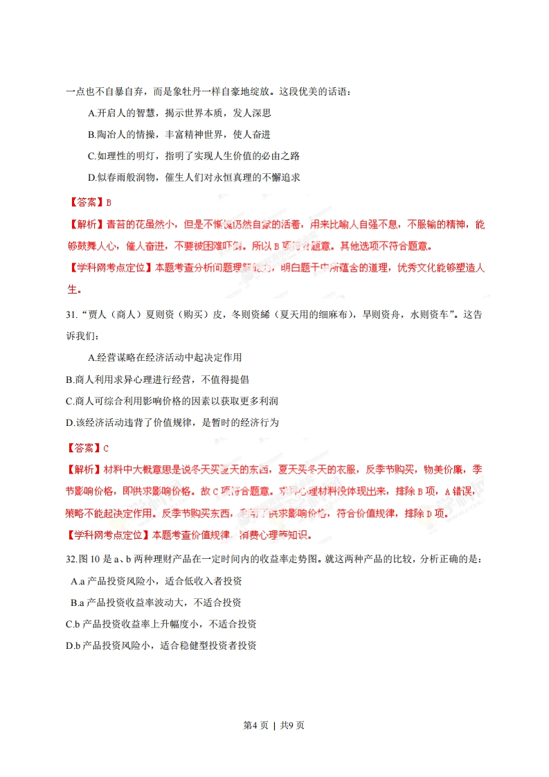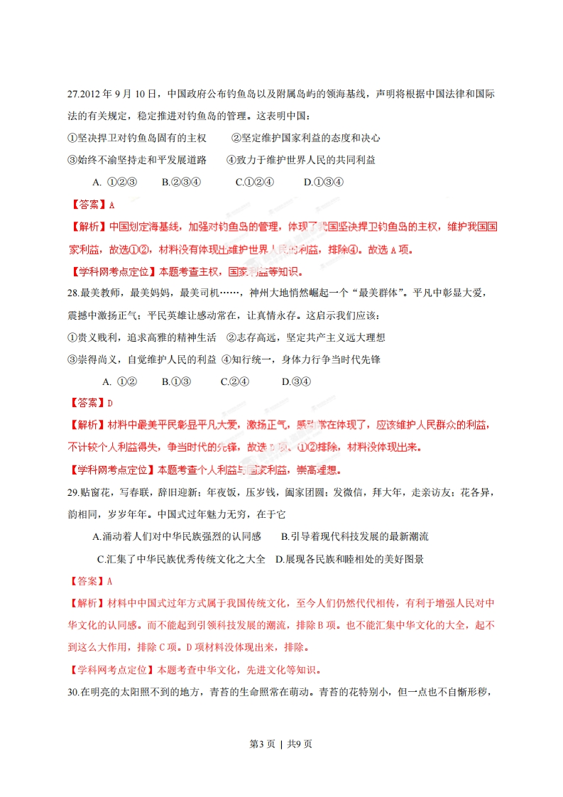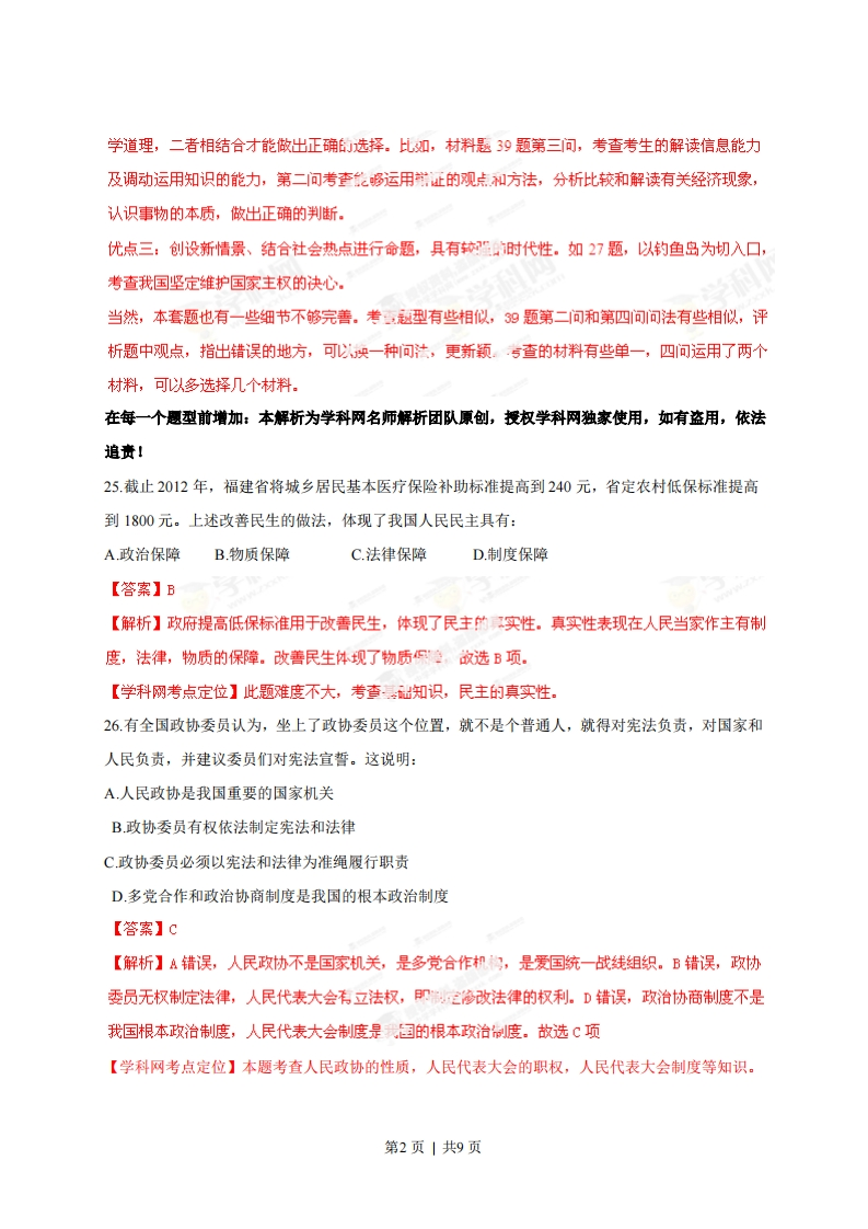 福建文综2013年普通高等学校统一考试政治试题学科网试卷总评本试题共有18个题目,其中13题为选择题,5题是以材料分析为主的主观题。从选择题来看:第25题考查民主真买性的特点,第26趣通过攻协委员责任考查我国政党制度,第27题以钓鱼岛事件为背景考查我国!攻策的幸本内溶,这三个小题都属于攻治生活的重点知识。第28题通过最美群体考查崇高理想,窝30题孝三忧秀文对人的作用,关注的是学生分析理解能力,第29题以过年的习俗为材料,考查中华文化,关是学生对知识的理解,这三小题都属于文化生活的重点知识。第31,33题以反季节买装,离流感,考查影响价格的因素,供给和需求,重点考查学生基础知识,第32题通出线图,考查投资的风险性和收益性,重点考查学生的读图能力,这三小题考查经济生活知识。第3,34,35题分别考查唯物主义,社会存在,社会意识,发展的观点相关知识,其中34题,考查对诗欲的理解,需要学生具备文学素养,和分析理解能力,第35题,漫画类选择题,难度较大,读懂漫画的寓意,还要翻译选项中诗句的大意,最后对号入座,综合性较强,跨度大。五个主观性试题:39题四问考查必修部分,以能力考查为主。42题考查选修部分,以基础知识为主39题(1)间,以经济社会发展中出现的问题为背景,考查政府的相关知识,难度不大。39题(2)问评析类问答题,重点考查学生调运用知识、解释和库择问题的能力,及做题方法,找出正确的地方和错误地方。39题(3)问以勤伦约的时内涵大切入点,综合考查文化发展,社会主义荣辱观,经济决定文化,试题综合性较强,除了考李础知识,还考查分析归纳理解能力。39题(4)间,以消费主义为材料,考查价值判断和价值选择暂学乐,难度不大,角度明确,思路清晰,重点考查价值判断和价值选择的原理P容及方法,·题2间,以党和攻府积极组织抗震救灾为背紧,考查民主集中制的表现,重点考查基础知识,综合分析本套卷优点较多。优点一:题覆盖正广,四本心修的主干知识都有所涉猎,分数的分布较合理,四本必修分别都是三道选择二,一道问答题,必停一24分,必修二23分,必修三21分,必修四22分,选修10分,共100分.优点二:较好地体现了考试大纲所要求的考生应具备的四种能力。如选择题23题,即要求学生有解读图表的能力,获取和解读信息的能力,同时又要求学生掌握价格,供给,需求之间关系的经济第1页|共9页