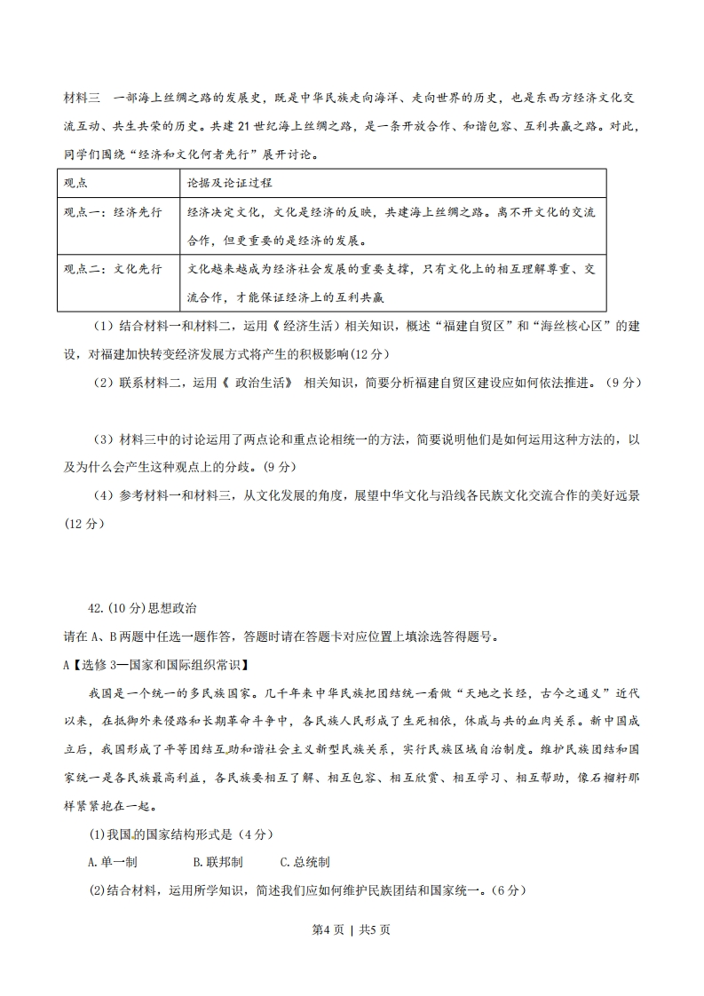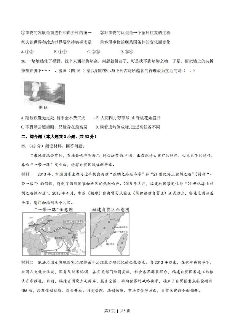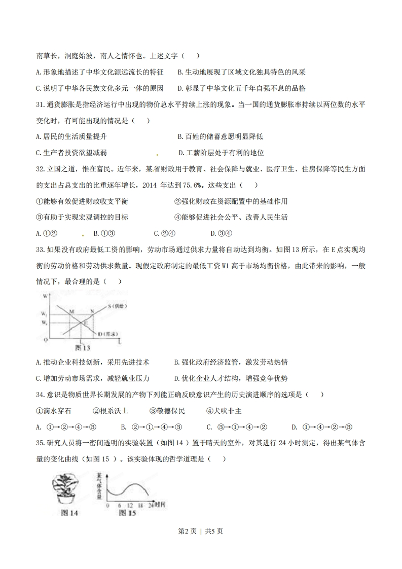 2015年普通高等学校招生全国统一考试文科综合能力测试政治(福建卷)一、选择题:本题共12小题,每小题4分,共48分。在每小题给出的四个选项中,只有一项是符合题目要求的。25.立法法修正案草案经历全国人大全委会“一审”一一公开征求意见一一“二审”一一再次公开征求意见,最后提交十二届全国人大三次会议,接受“三审”。此过程表明()①政府坚持对人民负责原则②全国人大常委会具有最高决定权③社会主义民主具有广泛性和真实性④人民代表大会制度实行民主集中制原则A.①②B.①③C.②④D.③④26.规范党内生活,到铁面问责严格执纪:从亮短揭丑的民主生活会,到重拳破除各种潜规则。党的十八大以来,守底线、讲原则、重法治成为新常态,这有利于广大党员()A牢记党的宗旨,发挥先锋模范作用B.强化执政意识,履行国家管理职能C.遵守党纪国法,扩大党的群众基础D.遵循客观规律,提高依法行政能力27.2015年4月,中国领导人在万隆亚非峰会上表示,中国将于年内对己建交的最不发达国家97%税目产品给予零关税的待遇,并继续向发展中国家提供不附加任何政治条件的援助。此举体现了中国坚持()A.合作共赢理念,推动亚非地区共同发展B.求同存异思想,维护世界的和平与安全C.和平共处原则,主导国际政治经济秩序D.开放包容态度,顺应多极化发展的潮流28.撰写《大众传媒与现代公民素养》的论文,在图书馆查到了下面四篇文章。从篇名判断,最符合论文主题的是()A.现代社会互联网传播特点探究B.网络时代文化传播手段的研究C.网络背景下高中生形象的塑造D.2014年央视收视率的调查分析29.图12是汉字“文”的书写变化的过程,从中我们可以解读出()个安这图12①汉字的产生与发展是一种自然现象②汉字在历史变迁中进行传承和发展③文化都是自己时代的精神上的精华④文化的变化与发展有其固有的规律A.①③B.①④C.②③D.②④30.慷慨悲歌之士,吴楚多放诞纤丽之文,自古然矣。自唐以前,长城饮马,河梁携手,北人之气概也:江第1页|共5页