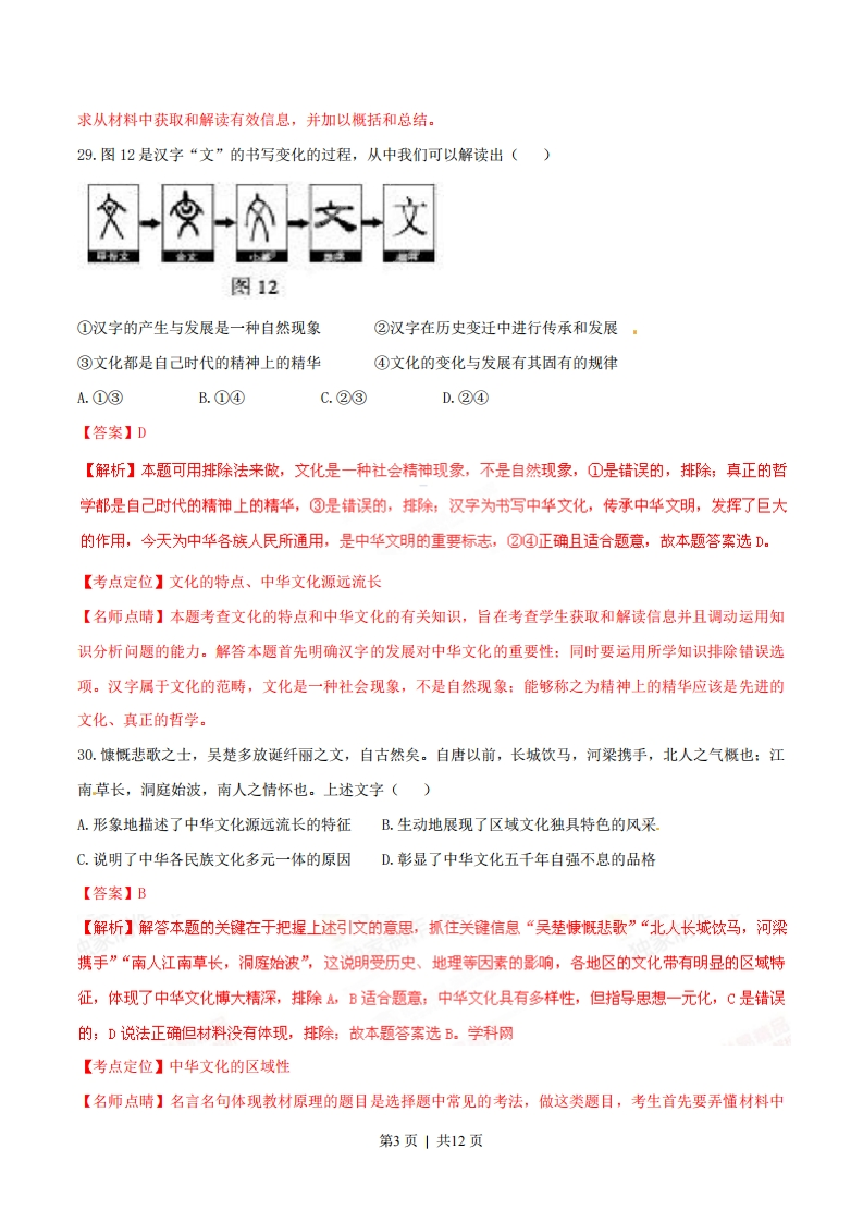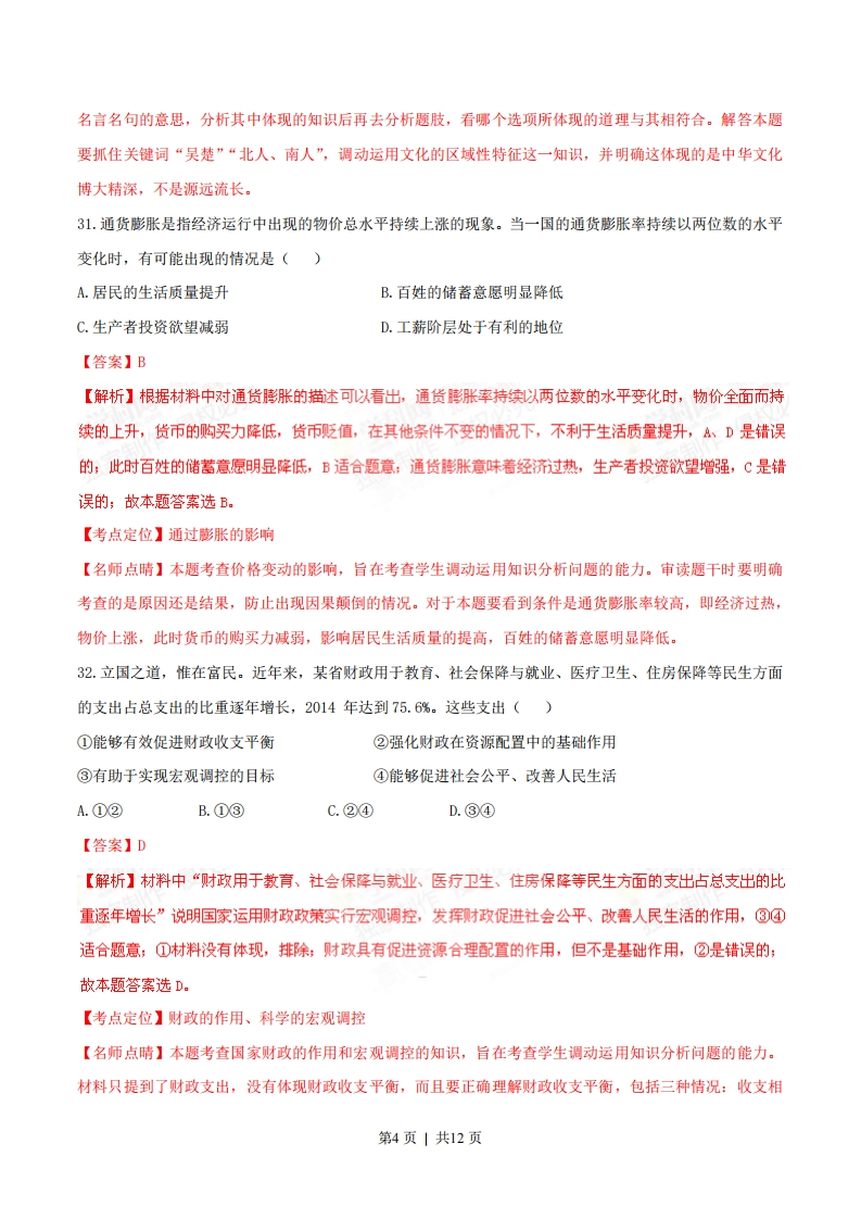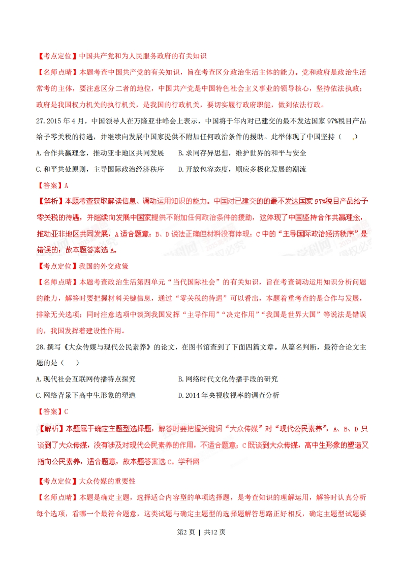 2015年普通高等学校招生全国统一考试文科综合能力测试政治(福建卷)一、选择题:本题共12小题,每小题4分,共48分。在每小题给出的四个选项中,只有一项是符合题目要求的。25.立法法修正案草案经历全国人大全委会“一审”一一公开征求意见一一“二审”一一再次公开征求意见,最后提交十二届全国人大三次会议,接受“三审”。此过程表明()①政府坚持对人民负责原则②全国人大常委会具有最高决定权③社会主义民主具有广泛性和真实性④人民代表大会制度实行民主集中制原则A.①②B.①③C.②④D.③④【答案】D【解析】学科网人民代表大会是人民行使国家权力的机关,它代表人民统一行使国家权力,决定全国和各级地方一切重大事务,享有立法权、决定权、任免权和监督权。材科中立法法修正案草案经历的过程表明人民代表大会具有立法权,实行民主集中制原则,也说明社会主义民主具有广泛性和真实性,③④适合题意,①②材料没有体现,排除:②全国人大常委会具有最高决定权的说法不科学,排除。故本题答案选D。【考点定位】人民代表大会制度【名师点晴】本题考查全国人大及其常委会的权力、社会主义民主的特点和民主集中制原则,旨在考查获取和解读信息以及调动运用知识分析问题的能力。注意区分人大的立法权和决定权,不要看表决通过了,要看通过的内容是什么,只要是法律的制定、修改、废止都是立法权,如果是本行政区的重大事项则是决定权,同时注意民主集中制原则的表现。26.规范党内生活,到铁面问责严格执纪:从亮短揭丑的民主生活会,到重拳破除各种潜规则。党的十八大以来,守底线、讲原则、重法治成为新常态,这有利于广大党员()A.牢记党的宗旨,发挥先锋模范作用B.强化执政意识,履行国家管理职能C.遵守党纪国法,扩大党的群众基础D.遵循客观规律,提高依法行政能力【答案】A【解析】反腐倡廉工作有利于广大党员牢记党的宗旨,发挥先锋模范作用,保持党的纯洁性和先进性,A适合题意,中国共产党是中国特色社会主义事业的领导核心,攻府履行国家职能,要依法行政,B、D都是错误的:C中的“扩大党的群众基础”不适合题意,排除;故本题答案选A第1页|共12页