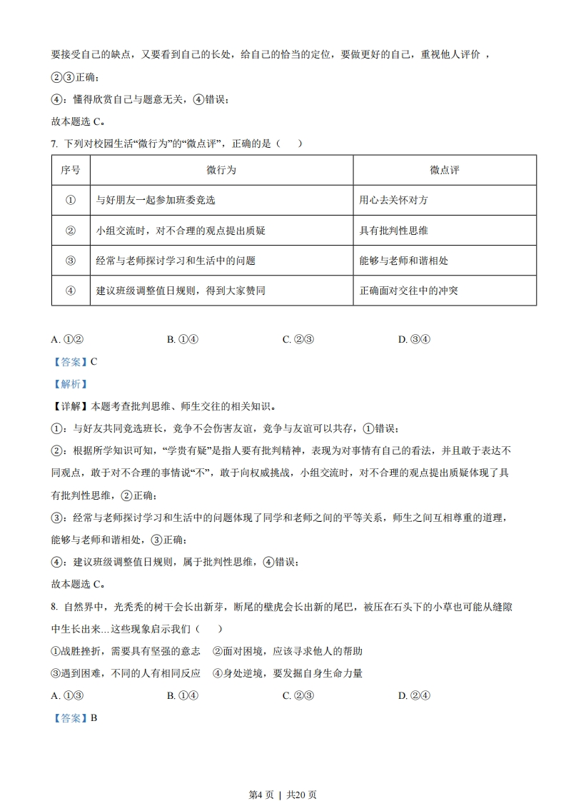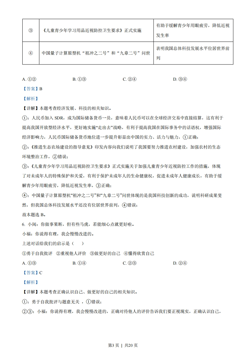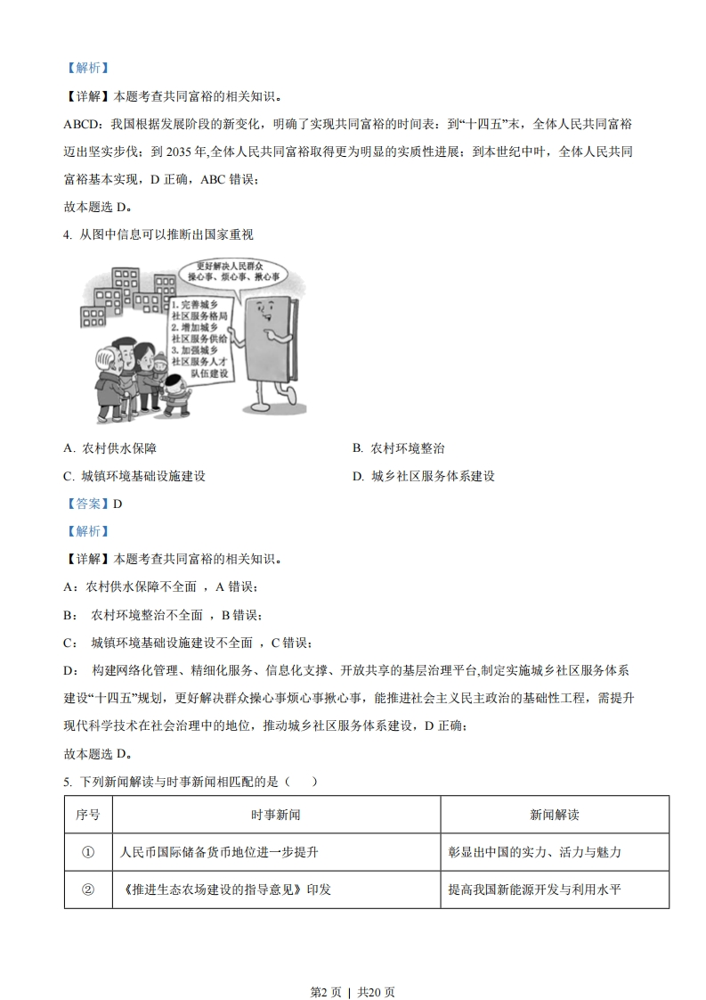 道德与法治试题一、选择题:本题共25小题,每小题2分,共50分。在每小题给出的四个选项中,只有一项是符合题目要求的。1.2021年是中国共产党成立100周年。2022年我们将迎来()A.中国共产党第二十次全国代表大会B.全面建成小康社会C.基本实现社会主义现代化D.第二个百年奋斗目标的实现【答案】A【解析】【详解】时事题,解析略。2.下框时事新闻共同反映的主题是()★中老铁路建成通车:对中国一东盟自由贸易区、大漏公河次区域经济合作将产生积极影响。★我国与“一带一路”沿线国家货物贸易额创新高:我国推动共建“一带一路”取得实打实的成就。A.独立自主,自力更生B.互利共赢,共同发展C.对话协商,兼收并蓄D.积极参与,合作治理【答案】B【解析】【详解】本题考查构建人类命运共同体。B:材料中,中老铁路建成通车、我国与“一带一路”沿线国家货物贸易额创新高,这些都体现了我国坚持构建人类命运共同体,坚持互利共赢,共同发展,故B正确:ACD:选项说法不符合题意,故排除ACD:故本题选B。3.我国己经到了扎实推动共同富裕的历史阶段。关于分阶段促进共同富裕,下列排序正确的是()①全体人民共同富裕基本实现②全体人民共同富裕迈出坚实步伐③全体人民共同富裕取得更为明显的实质性进展A.①—②-③B.①—③—②C.②—①-③D.②③①【答案】D第1页」共20页