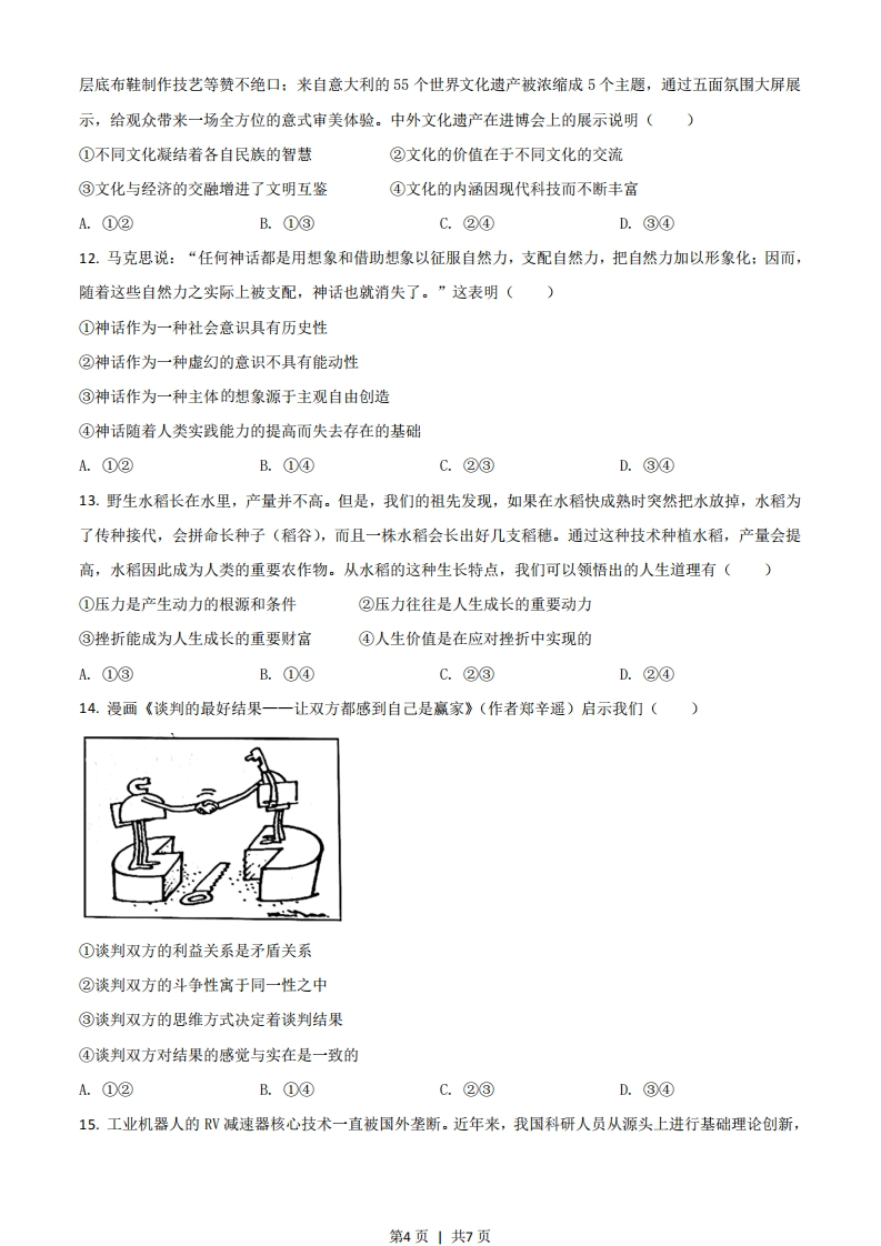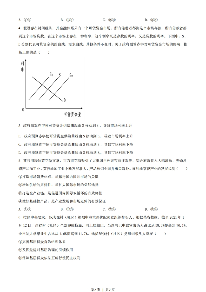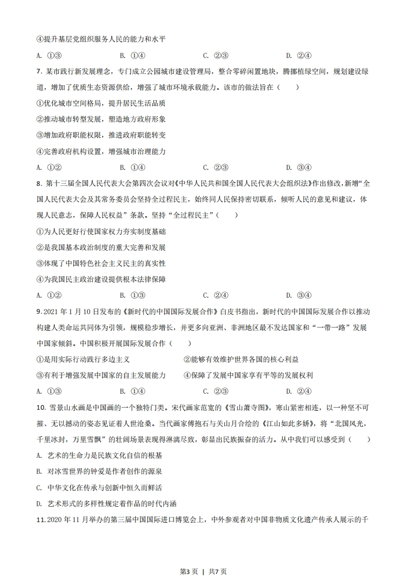 湖南省2021年普通高中学业水平选择性考试思想政治注意事项:1.答卷前,考生务必将自己的姓名、准考证号填写在本试卷和答题卡上。2.回答选释题时,选出每小题答案后,用铅笔把答题卡上对应题目的答案标号涂黑。如需改动,用橡皮擦干净后,再选涂其他答案标号。回答非选择题时,将答案写在答题卡上。写在本试卷上无效。3.考试结束后,将本试卷和答题卡一并交回。一、选择题:本题共16小题,每小题3分,共48分。在每小题给出的四个选项中,只有一项是符合题目要求的。1.“十三五”期间,我国居民收入水平稳步提高,恩格尔系数整体持续下降,服务消费迅速增长,绿色、智能、健康类商品销售日益红火,居民消费向个性化多样化转变。由此可以推断出()①居民收入持续增长使食品消费支出不断减少②服务消费迅速增长能促进消费结构不断优化③居民消费观念的变化是消费升级的关键因素④消费升级能为塑造新的经济增长点提供引领A.①③B.①④c.②③D.②④2.近年来新疆现代农业发展迅速。作为我国棉花的主产区,2020年全区棉花机械采摘率达到69.83%:“中国薰衣草之乡”伊犁,通过传感器监测、自动化农机耕作,薰衣草品质显著提高:“瓜果之乡”哈密,推广智慧农业云系统,瓜果种植更加精细更具特色。现代农业科技的广泛应用()①保障了新疆农产品的市场占有率②提升了新疆农业的规模化集约化水平③创新了新疆农产品的生产和销售模式④推动了新疆资源优势转化为经济优势A.①②B.①③C.②④D.③④3.湖南发展先进制造业有基础、有优势。截至2019年底,全省有16家企业和27个项目列入国家智能制造试点示范和专项项目,制造业占工业增加值比重超过90%,对经济增长贡献率超过30%。从“单项冠军”来看,工程机械产业规模连续10年居全国第一,电力机车产品全球市场份额第一。湖南先进制造业()①突破了关键技术“卡脖子”制约②筑牢了湖南实体经济的发展基础③成为了湖南高质量发展的重要引擎④占据了全球制造业市场的主导地位第1页1共7页