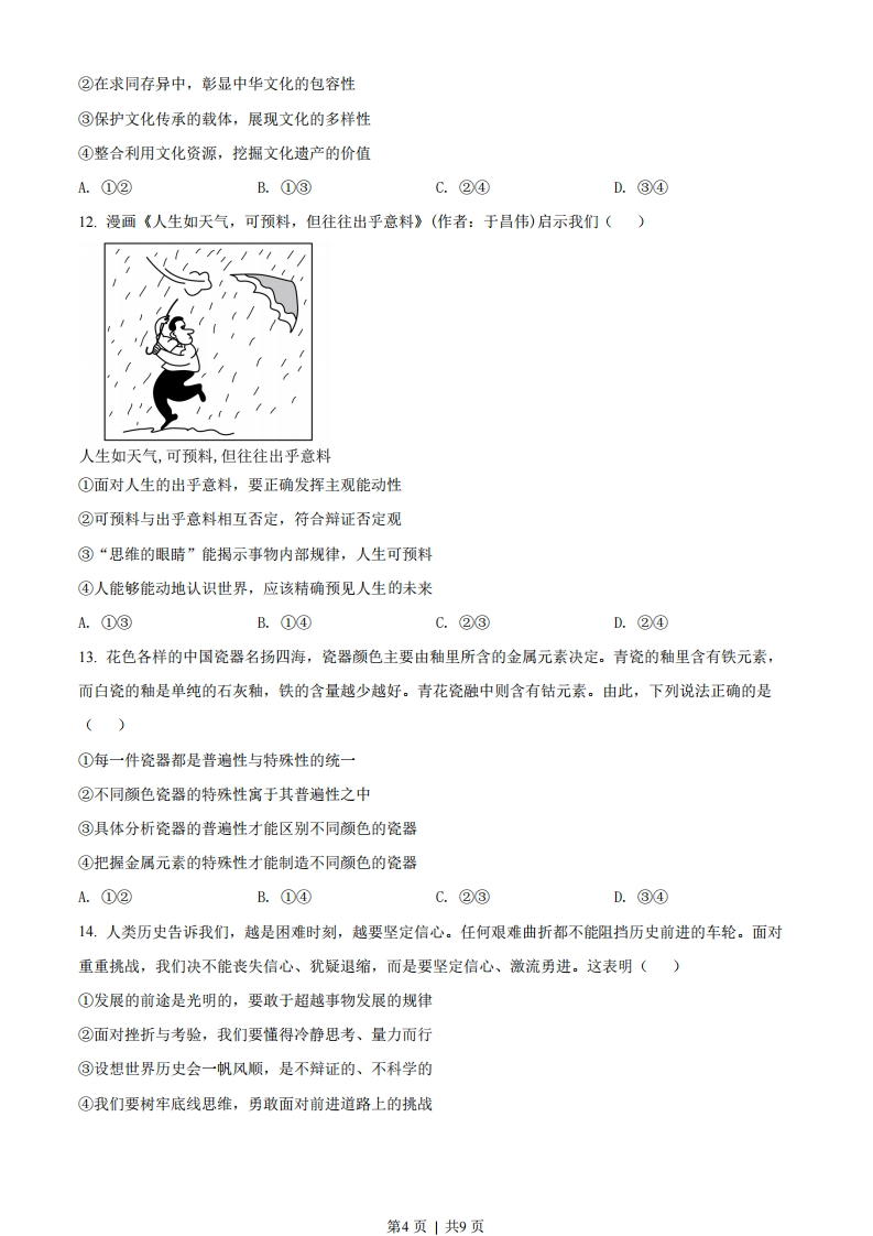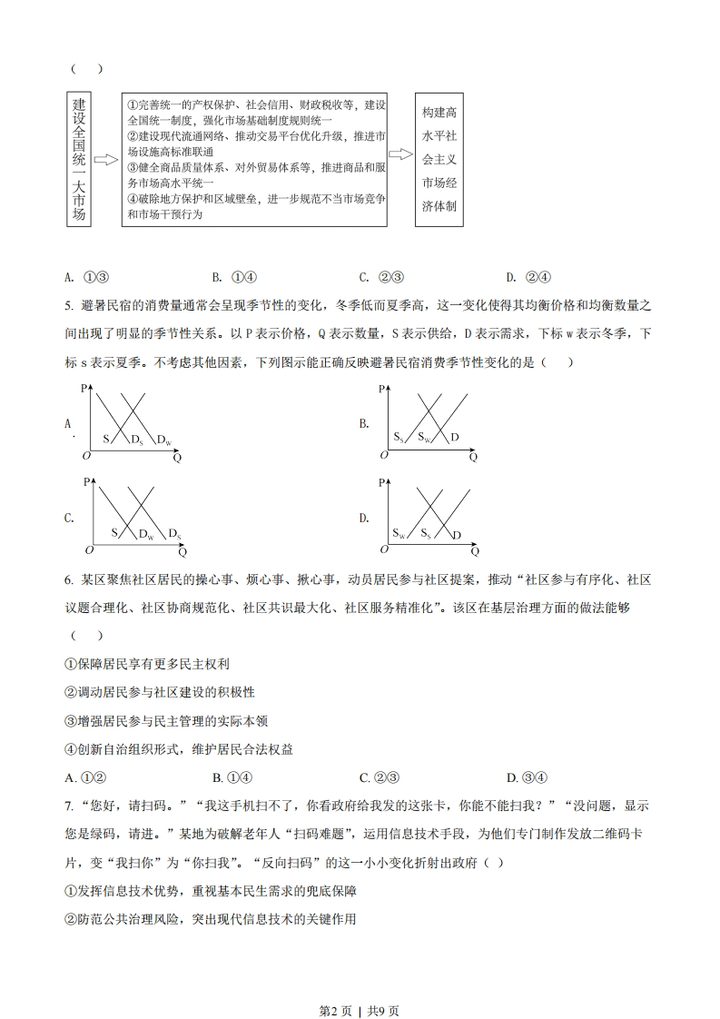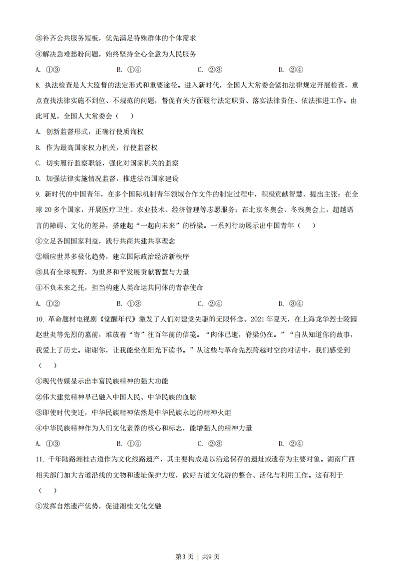 湖南省2022年普通高中学业水平选择性考试思想政治一、选释题:本题共16小题,每小题3分,共48分。在每小题给出的四个选项中,只有一项是符合题目要求的。1.某轮胎企业积极探索数字化转型,建立与消费者的直接联系,基于库存和销售数据及时调整产能计划,优化产品营销,提升服务体验,延展商业模式,个人零售成为新的业务增长点。2021年,在同期轮胎市场负增长的背景下,企业却实现了销量逆势增长近50%。数字化转型对该企业发展的作用体现在()①改进制造工艺,降低生产成本②精准对接市场,促进产品销售③提升服务水平,优化客户体验④提高产品质量,增加产品价值A.①③B.①④C.②③D.②④2.2021年底召开的中央经济工作会议提出,要正确认识和把握资本的特性和行为规律。要发挥资本作为生产要素的积极作用,同时有效控制其消极作用。既要依法加强对资本的有效监管,防止资本野蛮生长,也要支持和引导资本规范健康发展。这要求()①完善市场准入制度,加强对资本的源头治理②健全行业监管机制,消除垄断和资本逐利性③营造公平市场环境,激发各类市场主体活力④积极参与国际循环,引领资本全球化的进程A.①③B.①④C.②③D.②④3.某村建立股份合作社,绿化荒山、修建池塘…优美的生态环境吸引了全国各地的游客和会务、影像项目,村民通过提供食宿、销售特色手工产品获利丰厚。村集体收入大幅增长,收益重点用于环境改造、运营支出和村民福利。发展这种集体经济可以()①促进产业融合发展,推进乡村振兴②推动各种所有制经济取长补短、共同发展③巩固公有制主体地位,充分发挥其主导作用④建立村集体和农户利益共同体,促进共同富裕A.①②B.①④C.②③D.③④4.《中共中央国务院关于加快建设全国统一大市场的意见》强调,要加快建设高效规范、公平竞争、充分开放的全国统一大市场,为构建高水平社会主义市场经济体制提供重要支撑。能正确反映其内在联系的是第1页」共9页